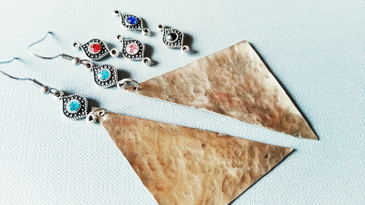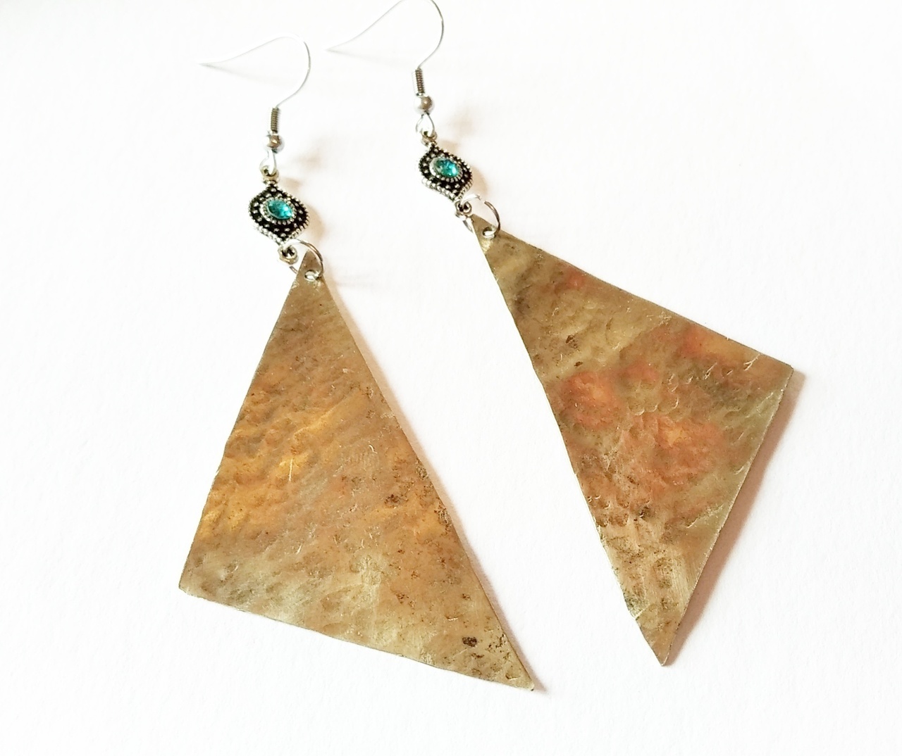 Μεγάλα τρίγωνα σκουλαρίκια με σφυρήλατο αλπακά και κρύσταλλο ματάκι γαλάζιο.