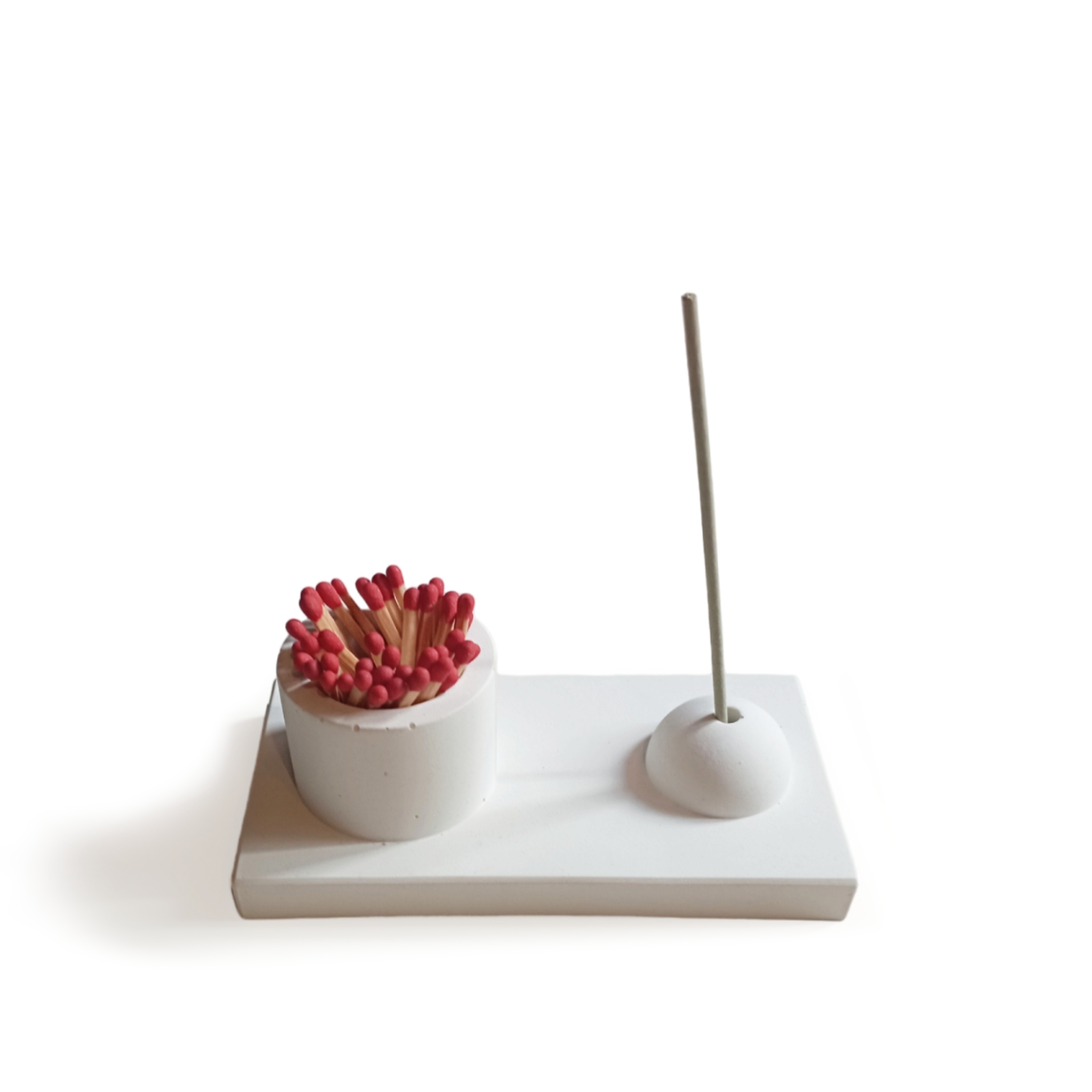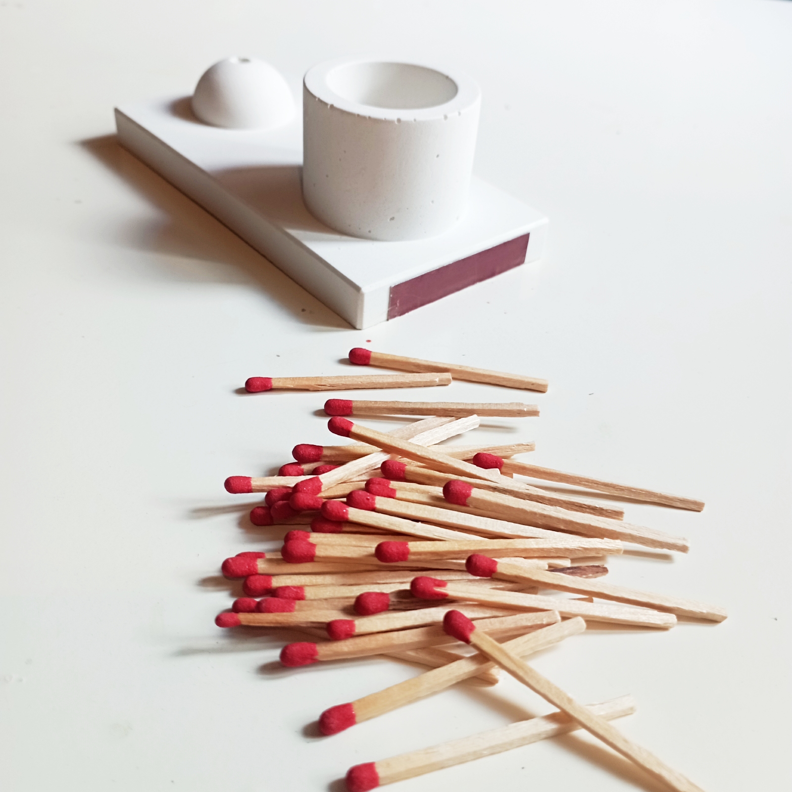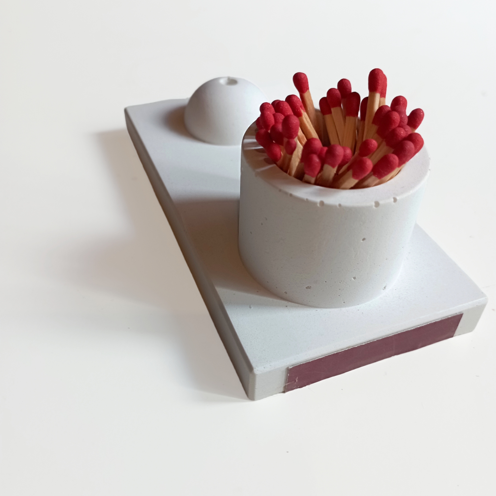 Tσιμεντένια βάση για αρωματικό στικ με έντονα τα γραμμικά στοιχεία. Σχεδιαστικά ξεχωρίζει για το συνδυασμό γεωμετρικών σχημάτων, όπως το παραλληλόγραμμο της βάσης, στο σφαιρικό της θέσης στήριξης και το κυλινδρικό της απόθεσης. Στη μία μικρή πλευρά της βάσης, υπάρχει τραχιά χάρτινη επιφάνεια για να ανάβει η κεφαλή του σπίρτου. Ενα κομψό και πρακτικό αξεσουάρ, που ταιριάζει σε οποιοδήποτε στυλ διακόσμησης, ενώ το λευκό χρώμα προσδίδει μια αίσθηση φρεσκάδας και ηρεμίας. Συμπεριλαμβάνονται 40 σπίρτα ασφαλείας.