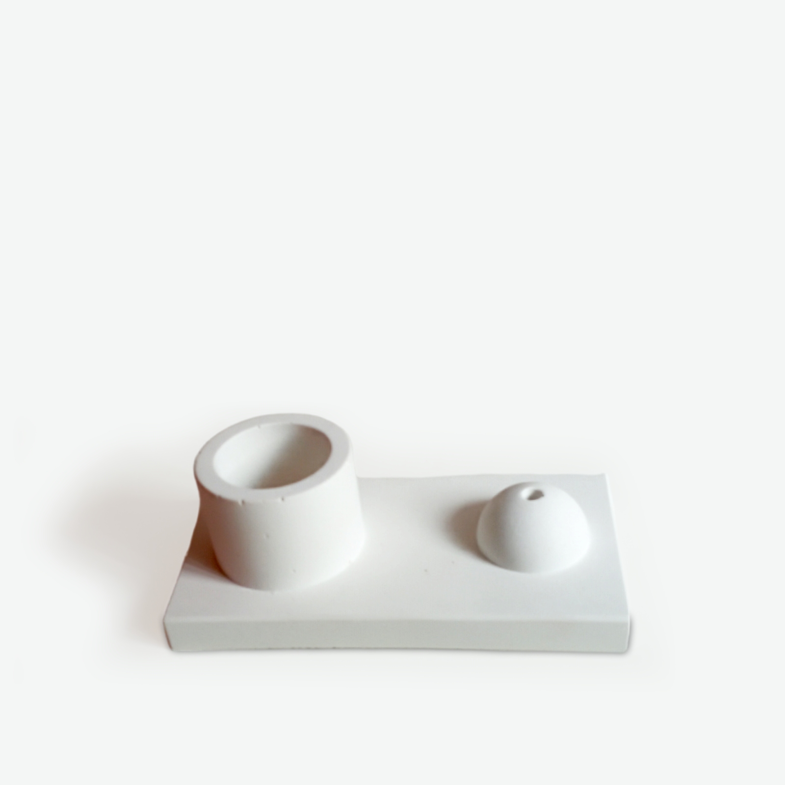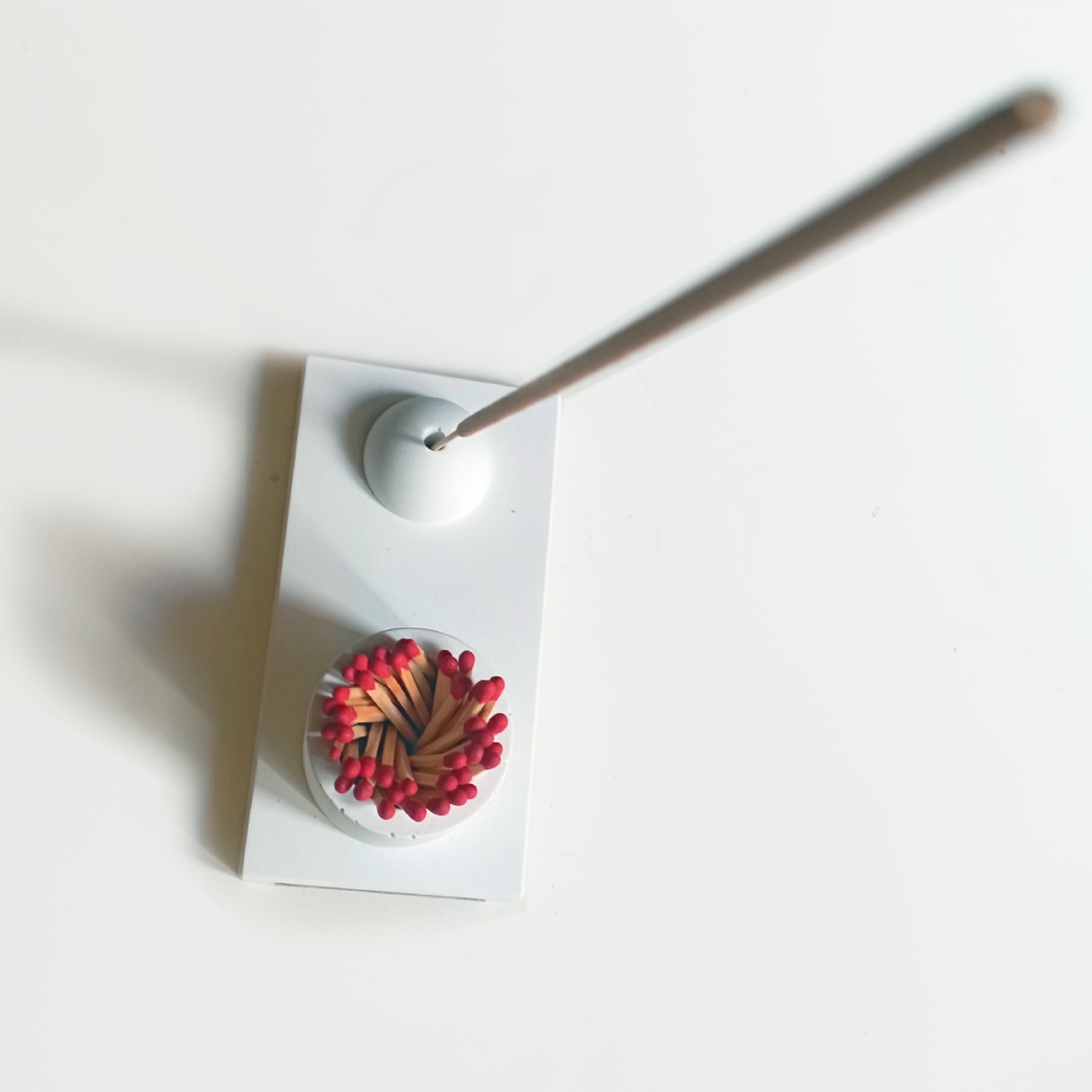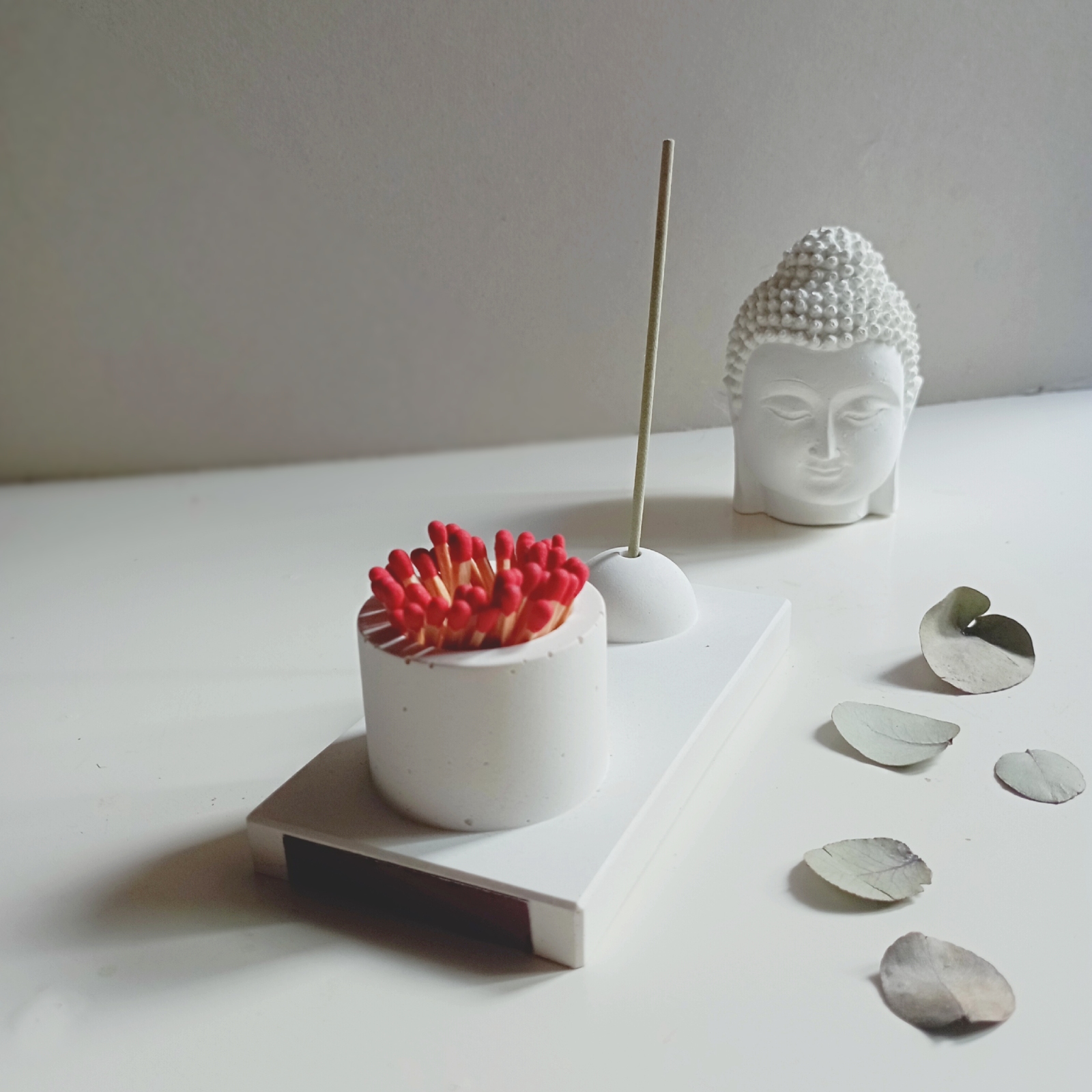 Tσιμεντένια βάση για αρωματικό στικ με έντονα τα γραμμικά στοιχεία. Σχεδιαστικά ξεχωρίζει για το συνδυασμό γεωμετρικών σχημάτων, όπως το παραλληλόγραμμο της βάσης, στο σφαιρικό της θέσης στήριξης και το κυλινδρικό της απόθεσης. Στη μία μικρή πλευρά της βάσης, υπάρχει τραχιά χάρτινη επιφάνεια για να ανάβει η κεφαλή του σπίρτου. Ενα κομψό και πρακτικό αξεσουάρ, που ταιριάζει σε οποιοδήποτε στυλ διακόσμησης, ενώ το λευκό χρώμα προσδίδει μια αίσθηση φρεσκάδας και ηρεμίας. Συμπεριλαμβάνονται 40 σπίρτα ασφαλείας.