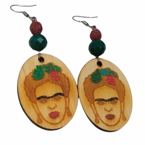 ξύλινα οβάλ σκουλαρίκια με τύπωμα Φρίντα ημιπολύτιμη λάβα σε μπορντό χρώμα και κρύσταλλο πράσινο σκούρο
