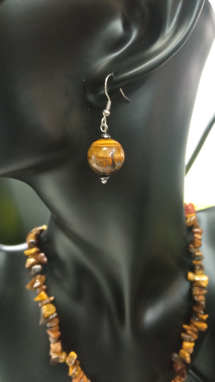Κρεμαστά σκουλαρίκια με ημιπολύτιμη πέτρα μάτι της τίγρης καφέ με νερά και πολυγωνικό αιματίτη ο γάντζος είναι από ατσάλι