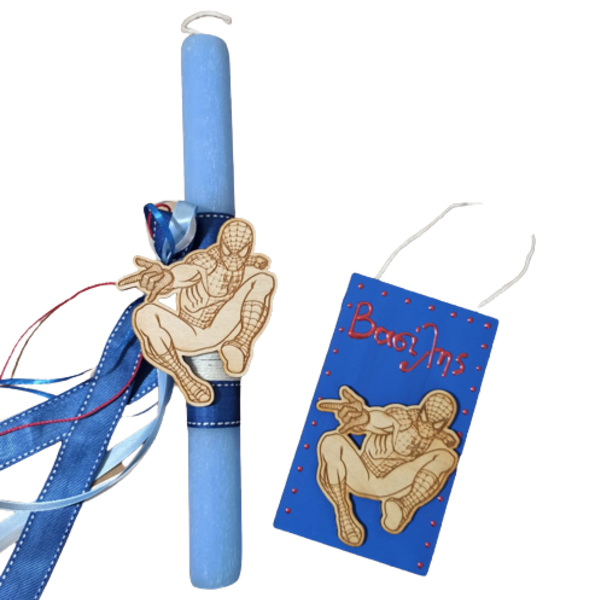 -ένα ξύλινο ταμπελάκι με όνομα παιδιού και φιγούρα spiderman για τη διακόσμηση του παιδικού δωματίου σε ασορτί χρώμα με τη λαμπάδα.