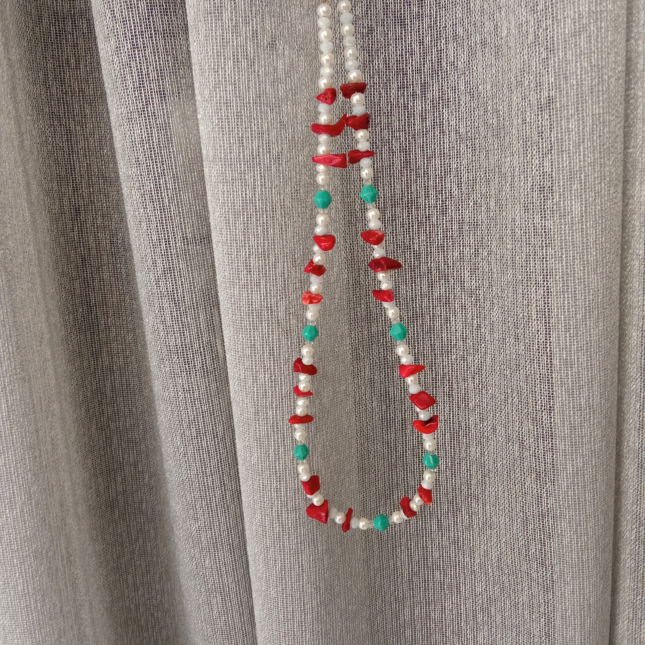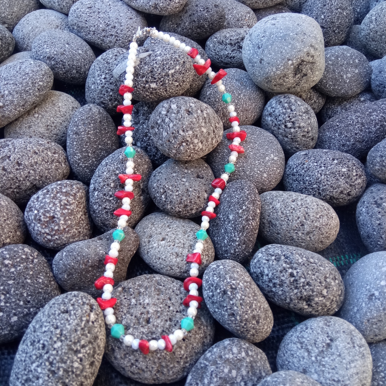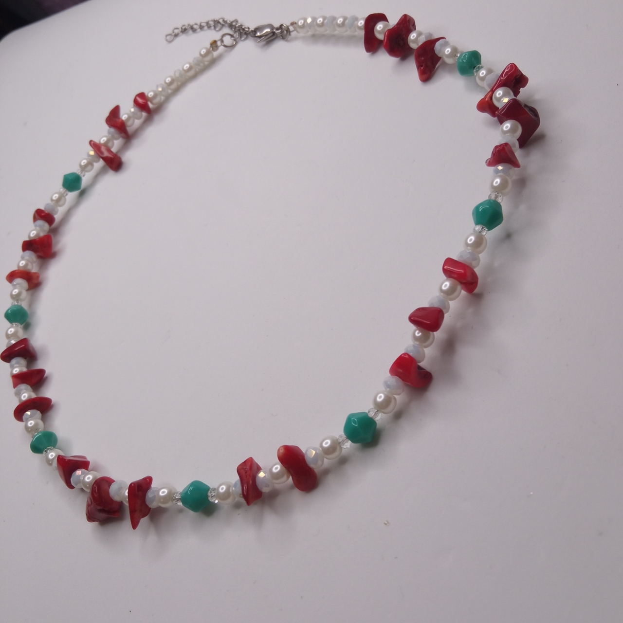 Κοντό κολιέ με λευκές πέρλες, ιριδίζοντα λευκά κρύσταλλα κόκκινα, ημιπολύτιμο τσιπς κούμπωμα από ατσάλι με αυξομείωση