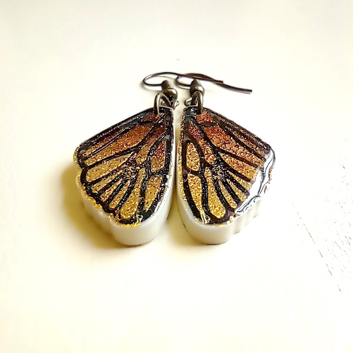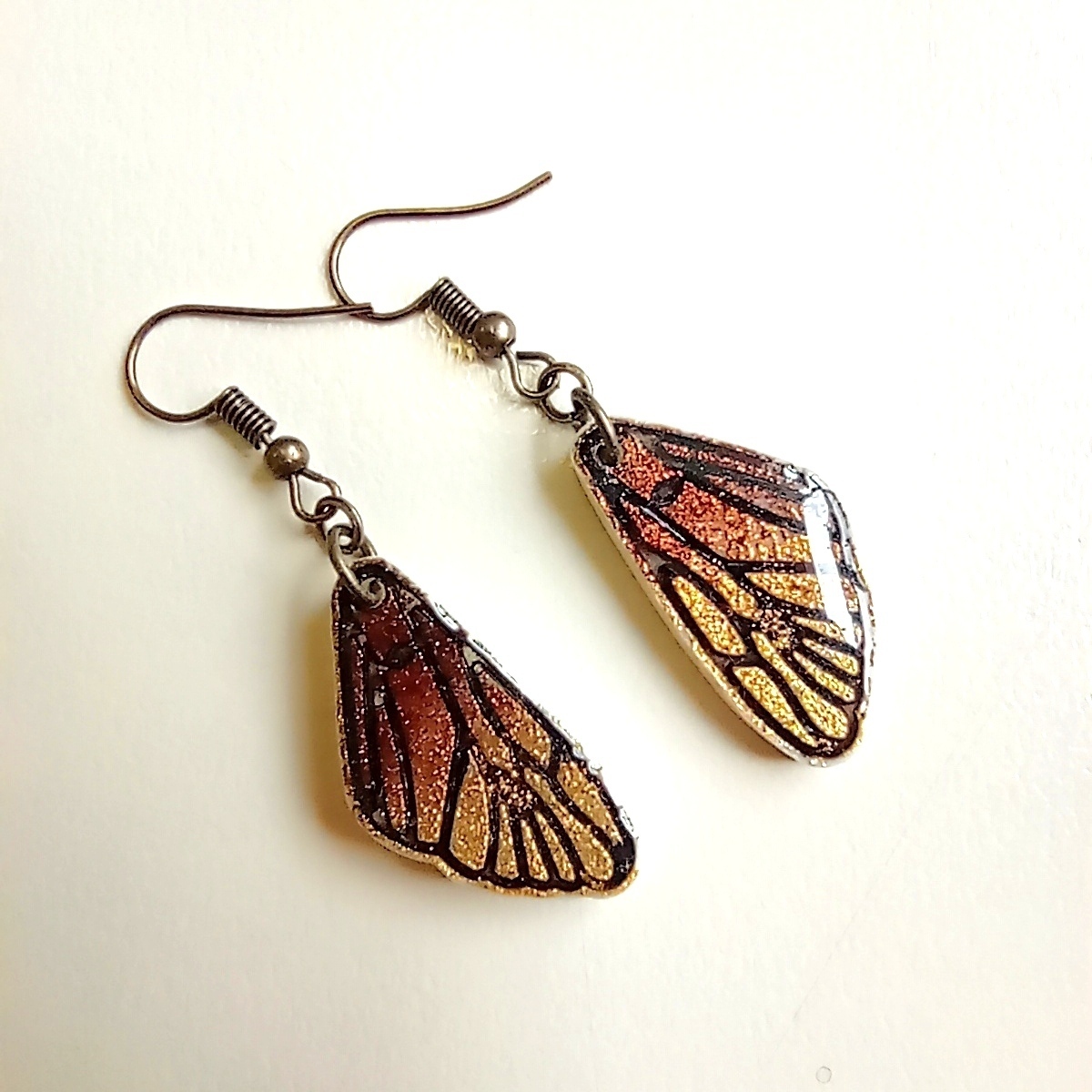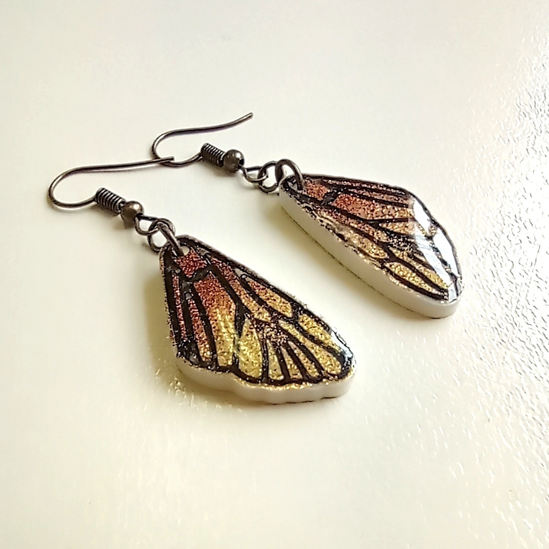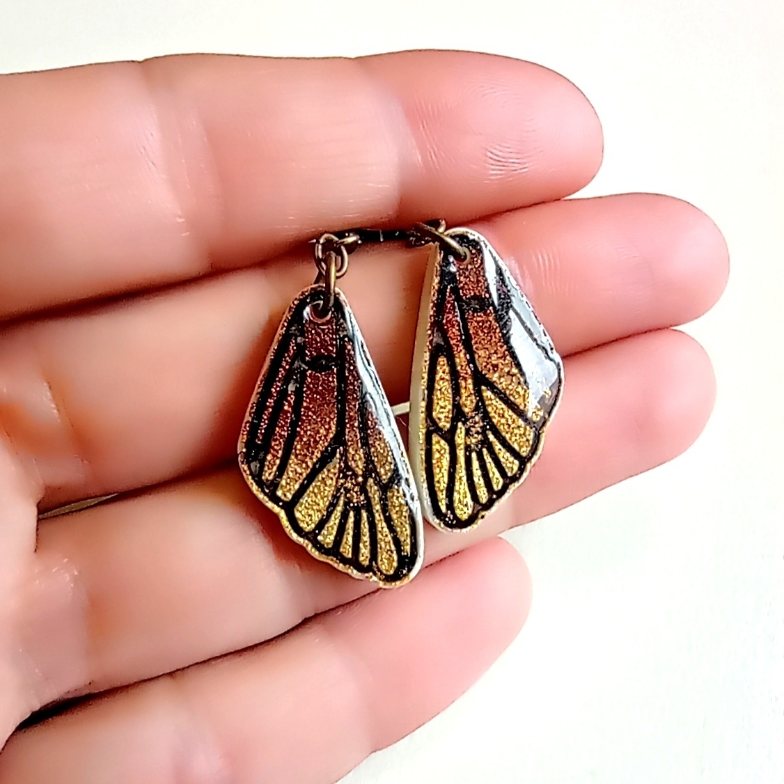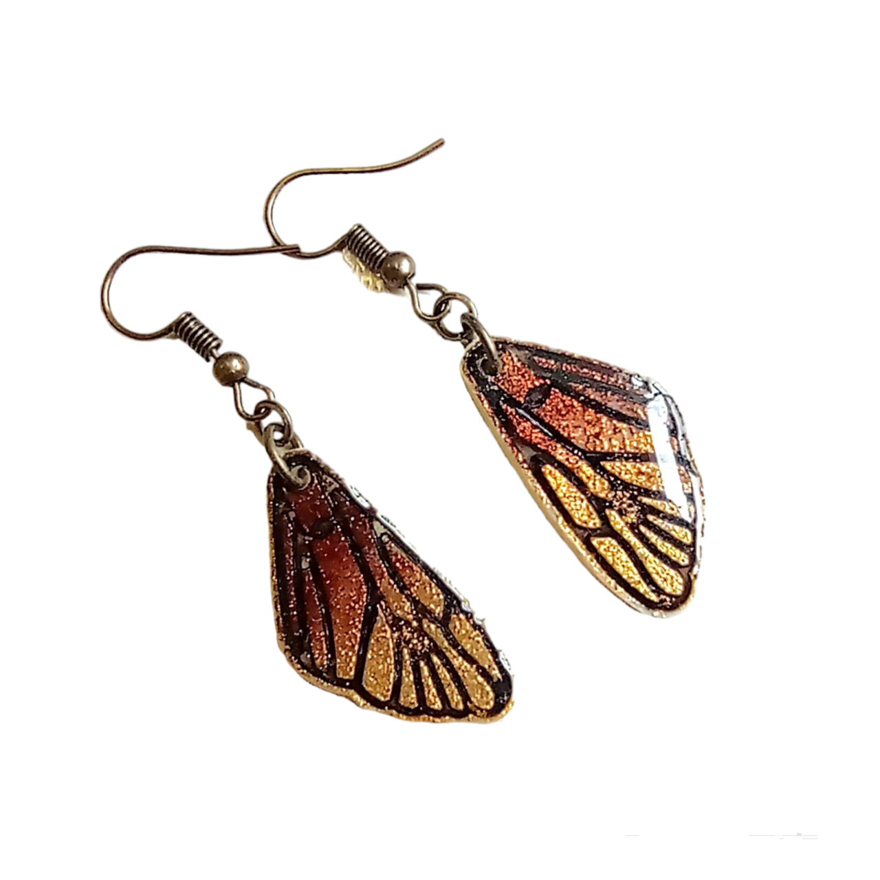 Σκουλαρίκια κρεμαστά από ρητίνη pu σε σχήμα φτερών πεταλούδας. Βαμμένα στο χέρι με μεταλλικά χρώματα σε χρυσό καφέ και επικάλυψη υγρού γυαλιού.