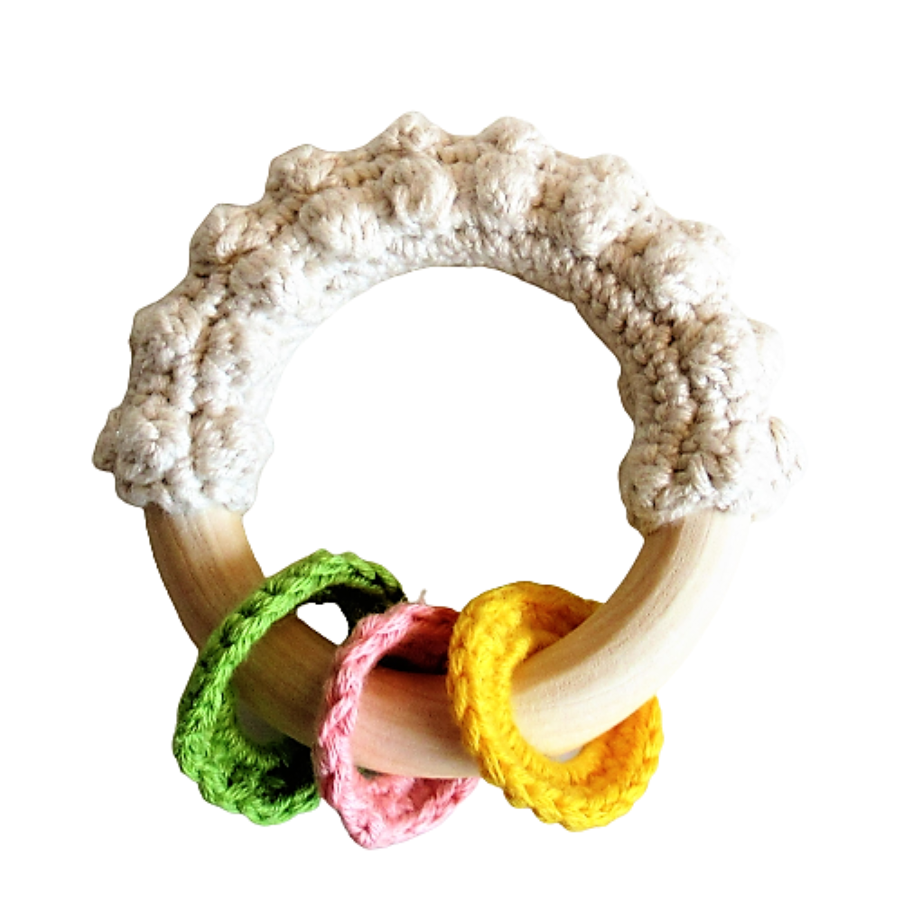 Οικολογικός κρίκος οδοντοφυΐας, με ξύλο σφένδαμου και βιολογικό βαμβάκι που θα ανακουφίσει τα φουσκωμένα ούλα των μωρών μας με ασφάλεια. Η πλέξη βατόμουρο δίνει μια ανάγλυφη επιφάνεια πολύ βολική για να πιέζει πάνω της τα φουσκωμένα ούλα του. Στα μωράκια αρέσει να κρατούν κάτι ελαφρύ στα χεράκια τους και να το βάζουν στο στόμα τους και τα χρωματιστά πλεκτά κρικάκια θα τραβήξουν την προσοχή τους.