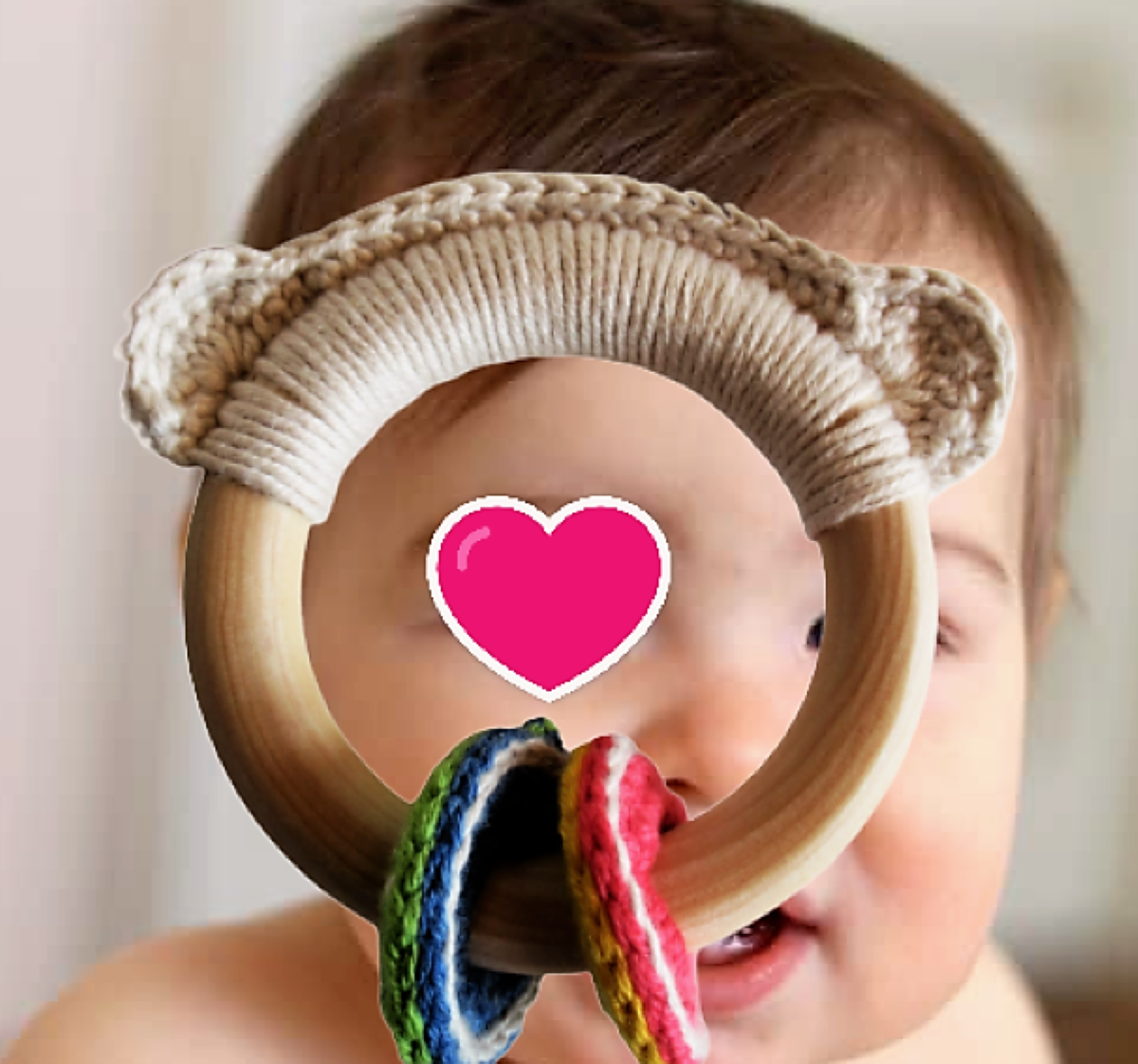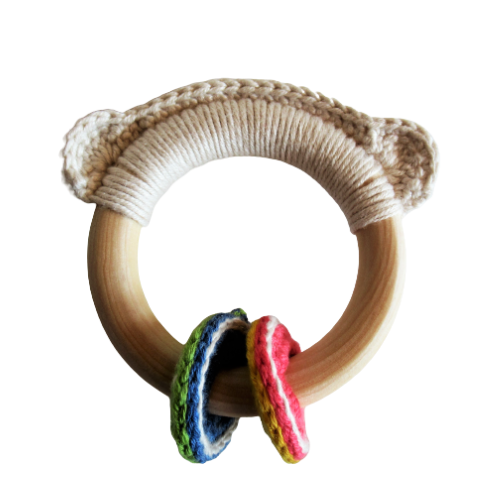 Οικολογικός κρίκος οδοντοφυΐας, με ξύλο σφένδαμου διαμέτρου 7 εκ και βιολογικό βαμβάκι που θα ανακουφίσει τα φουσκωμένα ούλα των μωρών μας με ασφάλεια. Στα μωράκια αρέσει να κρατούν κάτι ελαφρύ στα χεράκια τους και να το βάζουν στο στόμα τους. ‘Εχει ανάγλυφες επιφάνειες που θα θελήσει να περιεργαστεί και να μασουλήσει όπως τα αυτάκια και τα χρωματιστά πλεκτά κρικάκια.