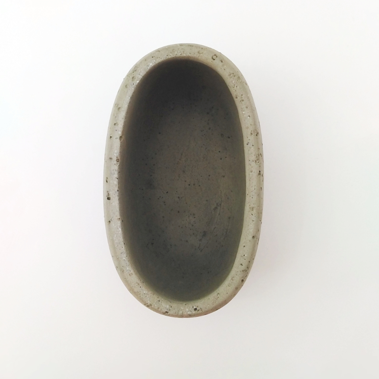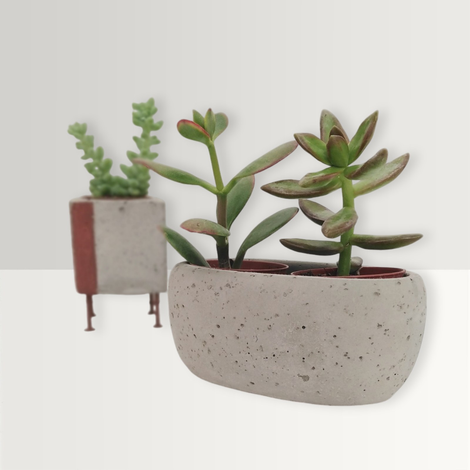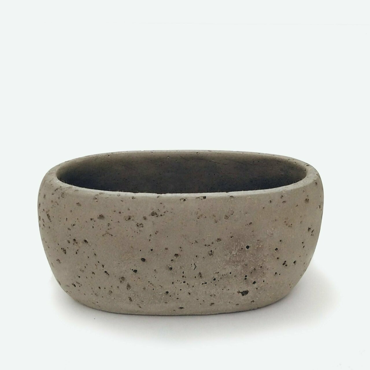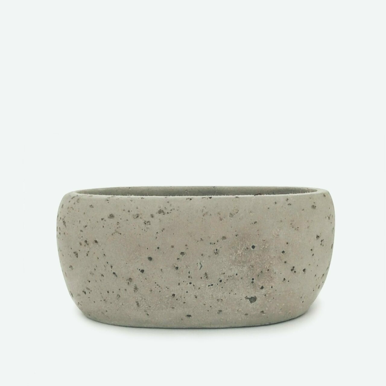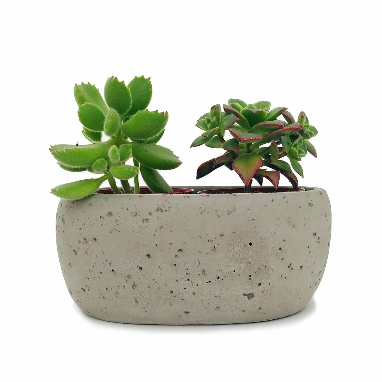 Μικρό κασπώ κατασκευασμένο από γκρι σκυρόδεμα, που ξεχωρίζει για τα ρουστίκ χαρακτηριστικά του. Έχει οβάλ σχήμα, και είναι σχεδιασμένο να χωράει δύο γλαστράκια διαμέτρου 5.5 εκ. Στο εσωτερικό έχει εφαρμοστεί βερνίκι αδιαβροχοποίησης ενώ η κάτω πλευρά είναι καλυμμένη με φύλλο φελλού για σταθερότητα και προστασία. Αναδείξτε τα αγαπημένα σας παχύφυτα και κακτάκια με το ξεχωριστό τσιμεντένιο κασπώ.