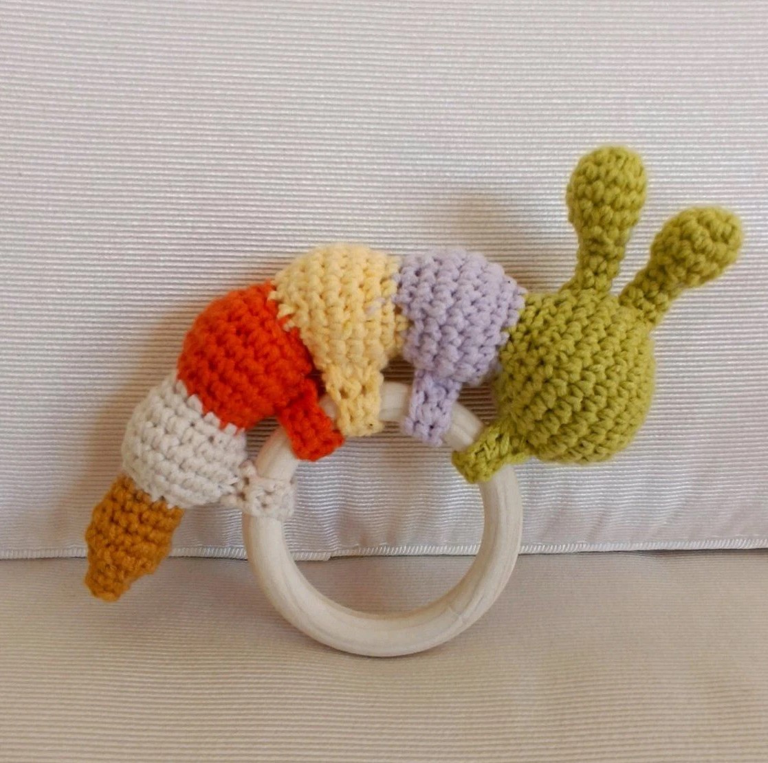 Οικολογικός κρίκος οδοντοφυΐας, για μωράκια και κουδουνίστρα μαζί! Είναι μια πολύχρωμη, χαριτωμένη κάμπια πιασμένη σε ξύλινο κρίκο από σφένδαμο, διαμέτρου 7 εκ και πλεγμένη με βιολογικό βαμβάκι που θα ανακουφίσει τα φουσκωμένα ούλα των μωρών μας με ασφάλεια. Στα μωράκια αρέσει να κρατούν κάτι ελαφρύ στα χεράκια τους και να το βάζουν στο στόμα τους. ‘Εχει ανάγλυφες επιφάνειες που θα θελήσει να περιεργαστεί και να μασουλήσει .