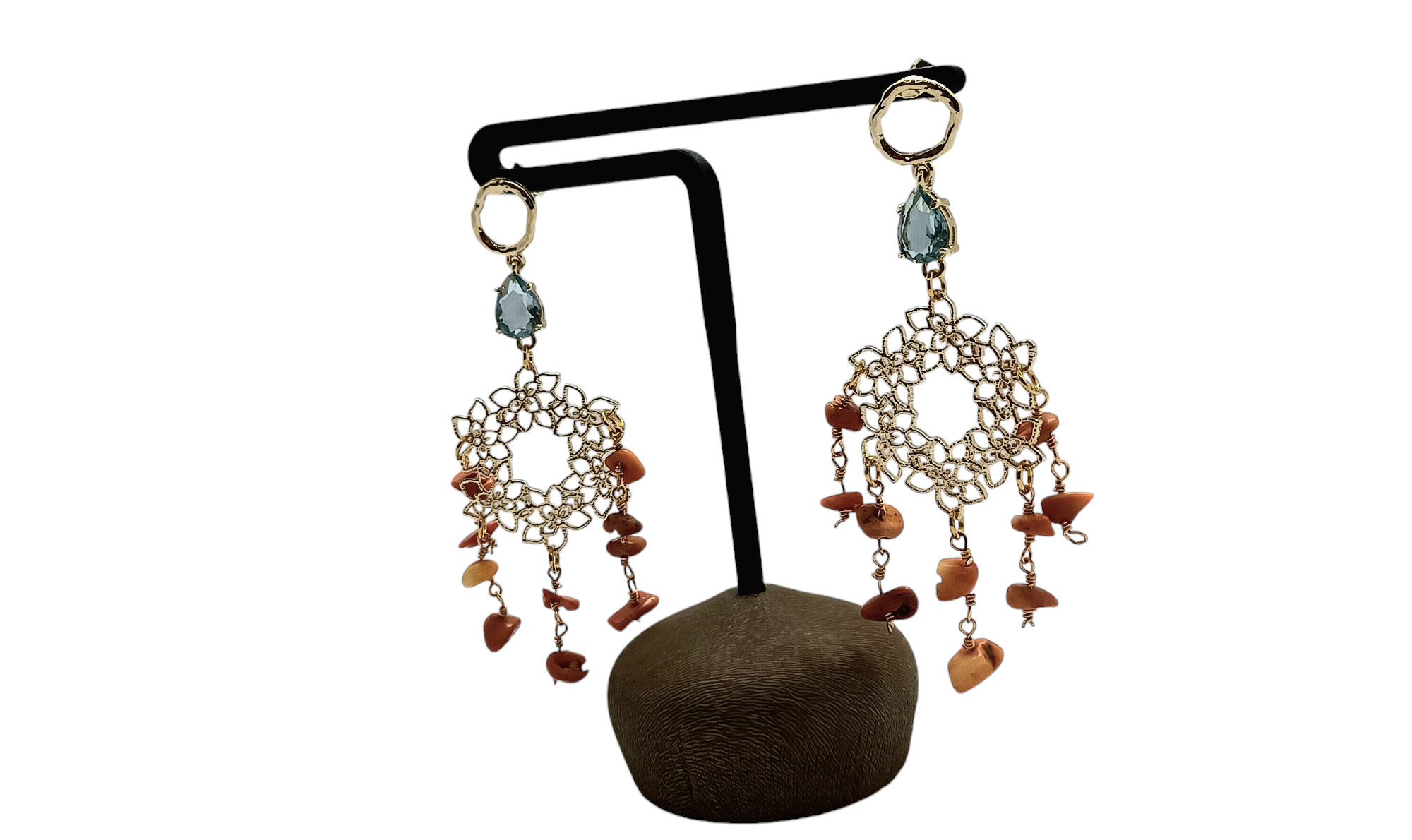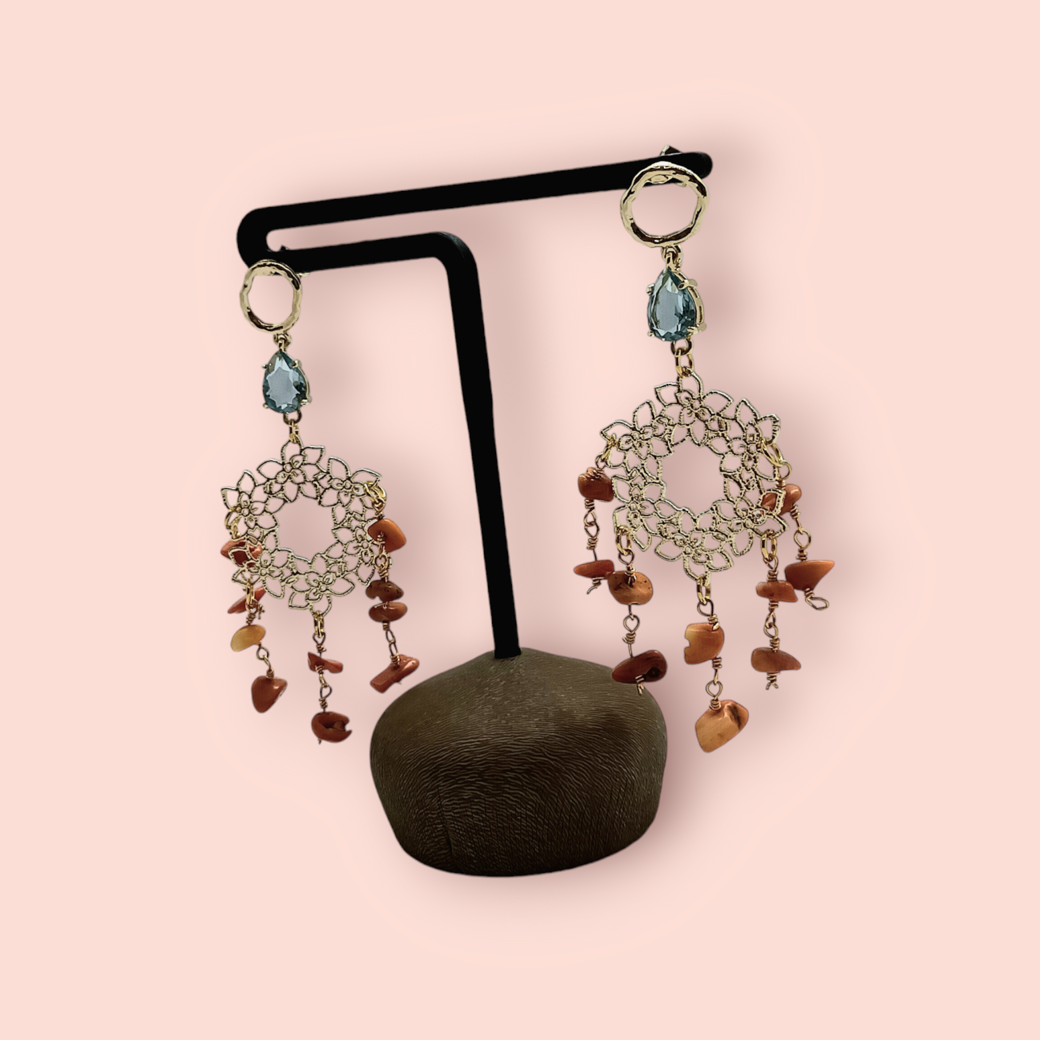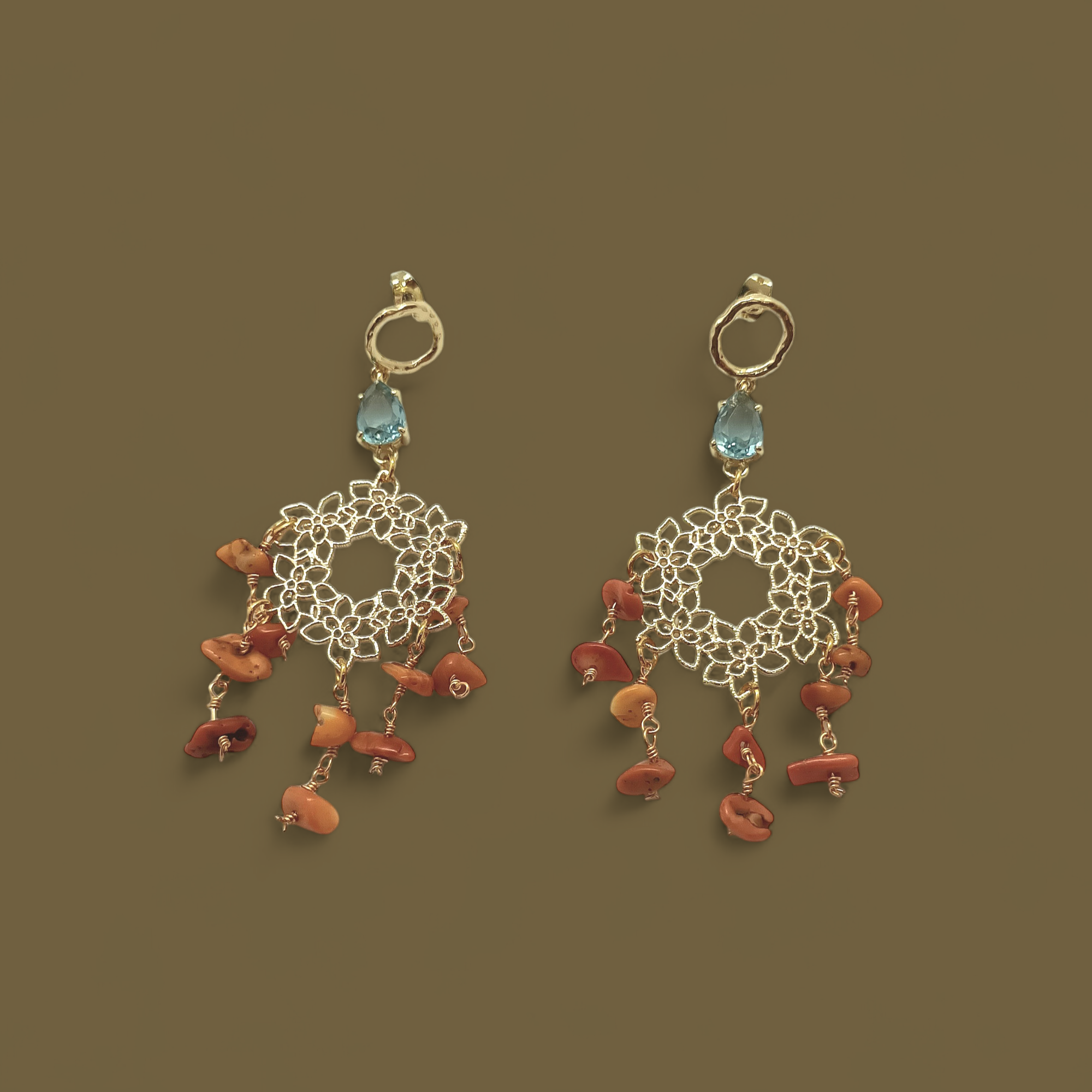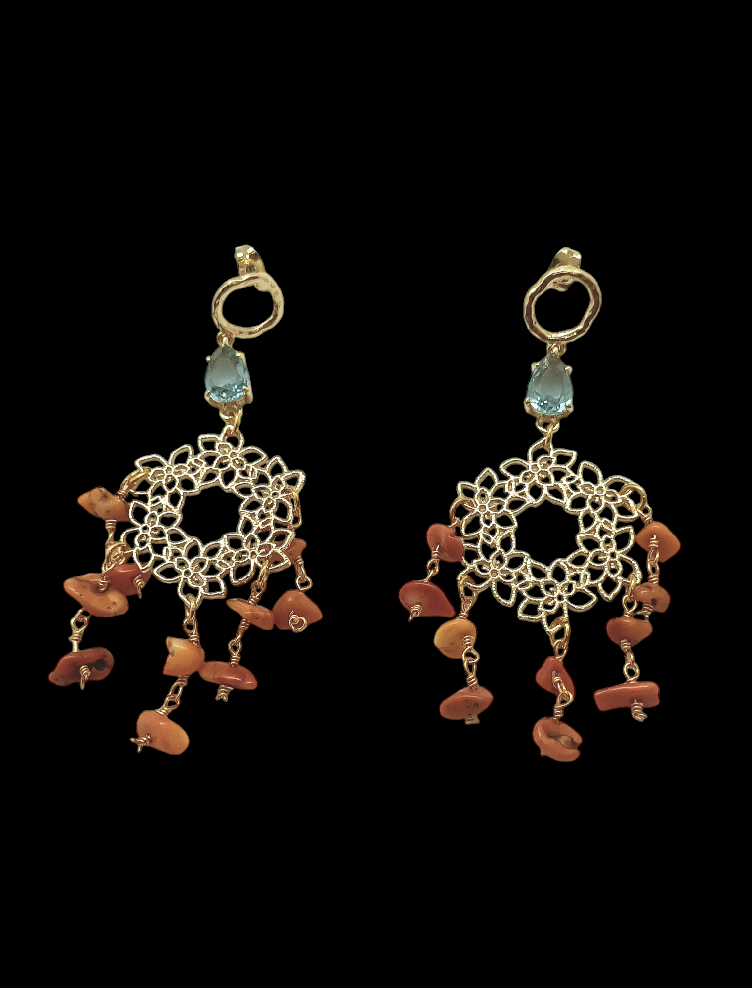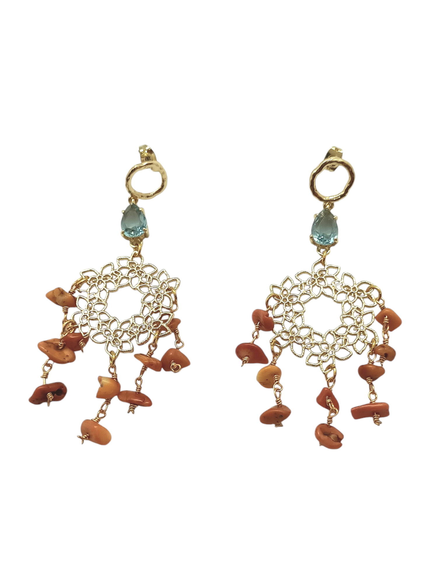 Χειροποίητα κρεμαστά μακριά σκουλαρίκια με στρογγυλό μεταλλικό διάτρητο στοιχείο που κρέμονται ροζάριο κοράλλι