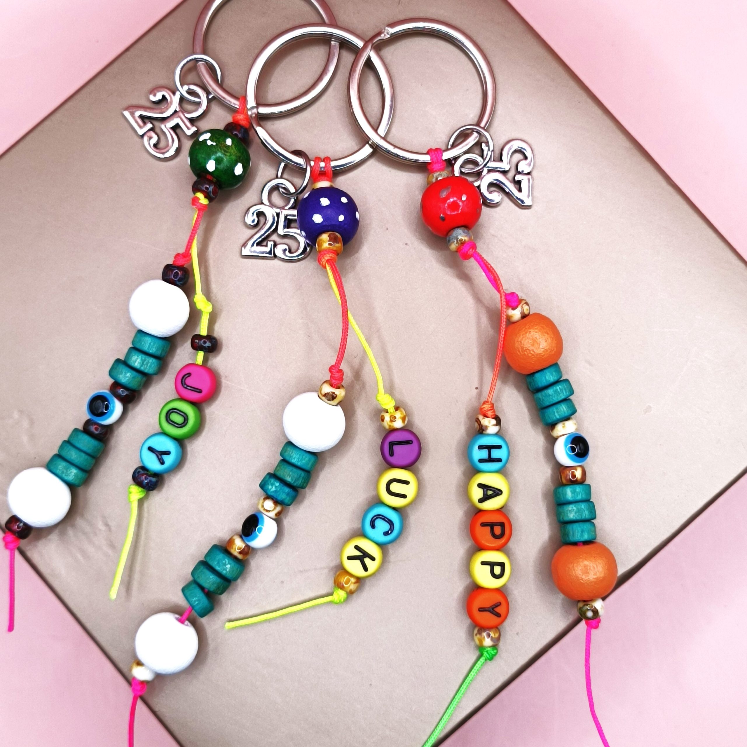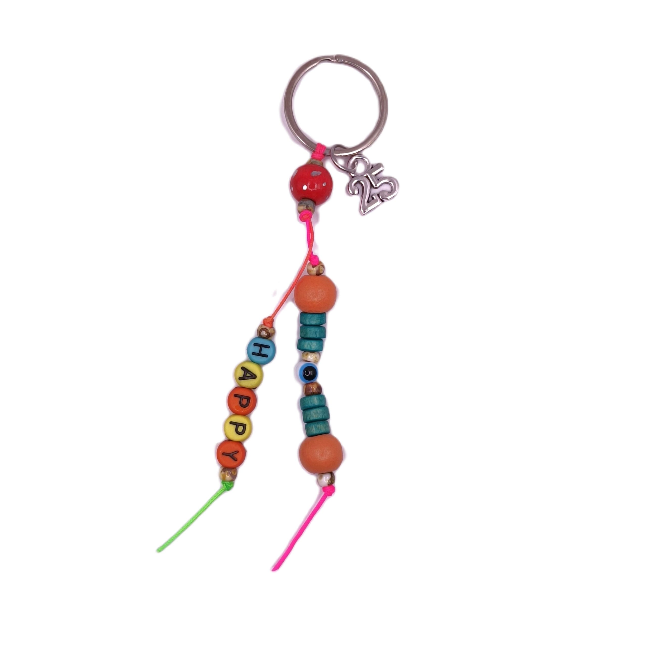 Μπρελόκ γουράκι με πολύχρωμες χάντρες και γράμματα Happy. Κρεμαστό μεταλλικό “25” και ματάκι mini.