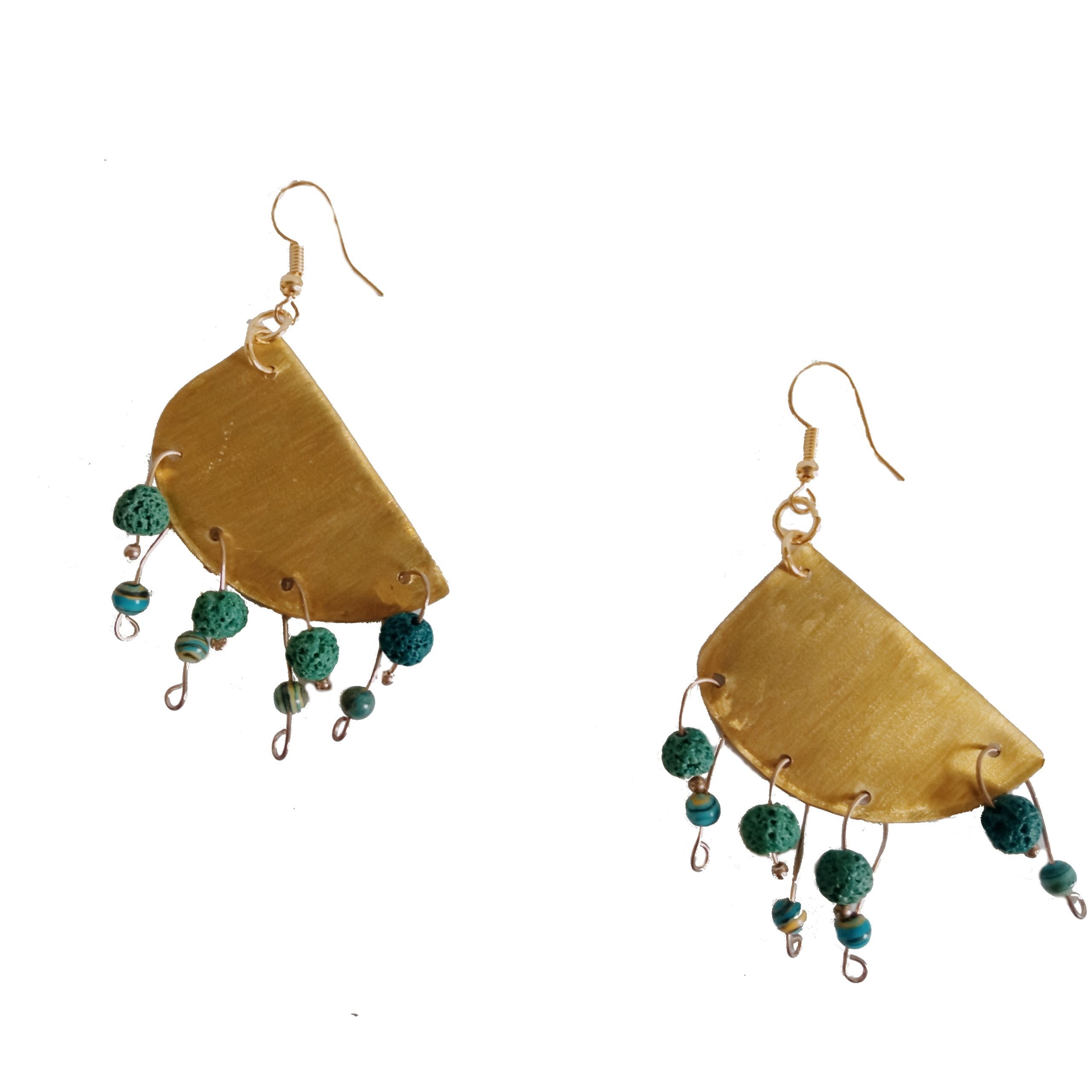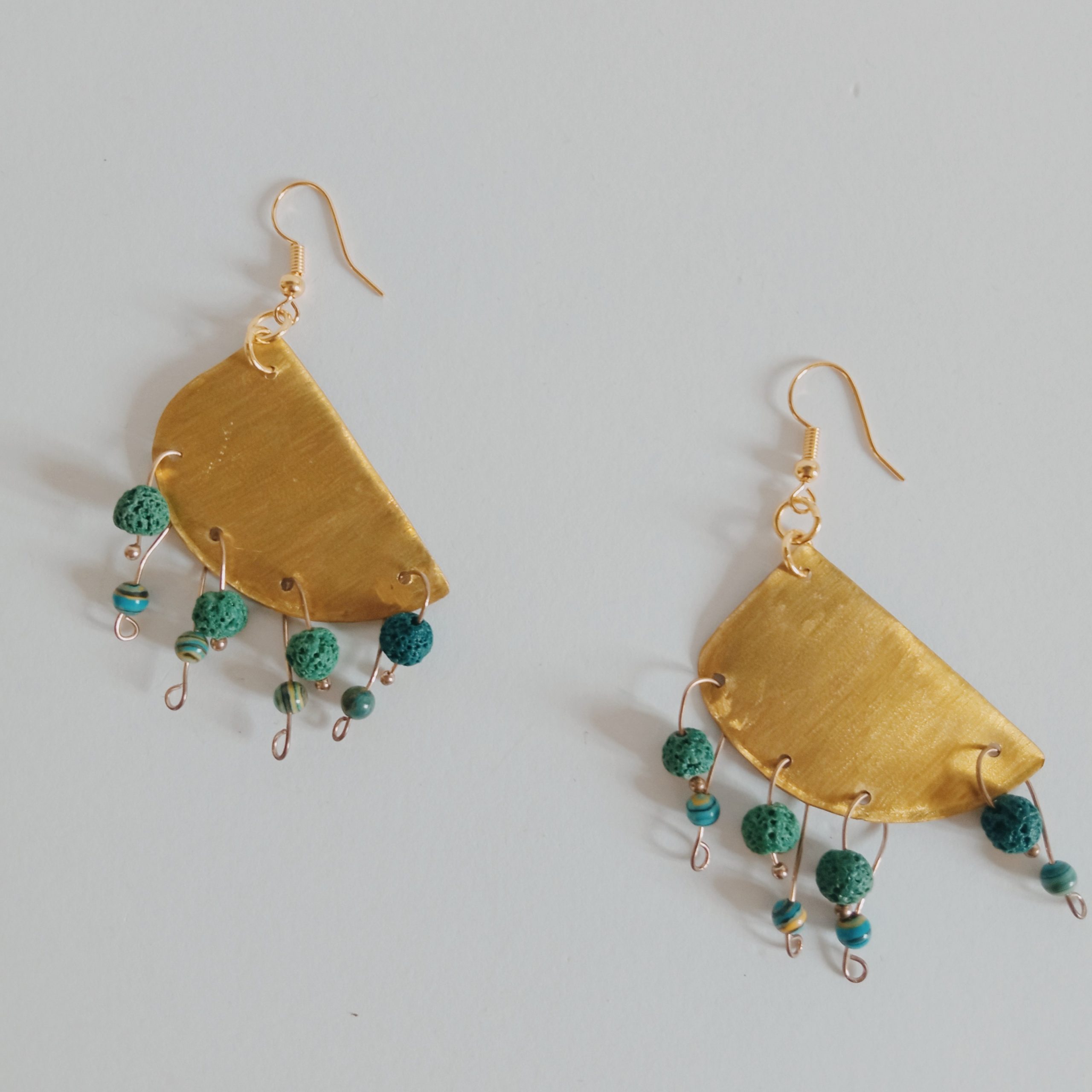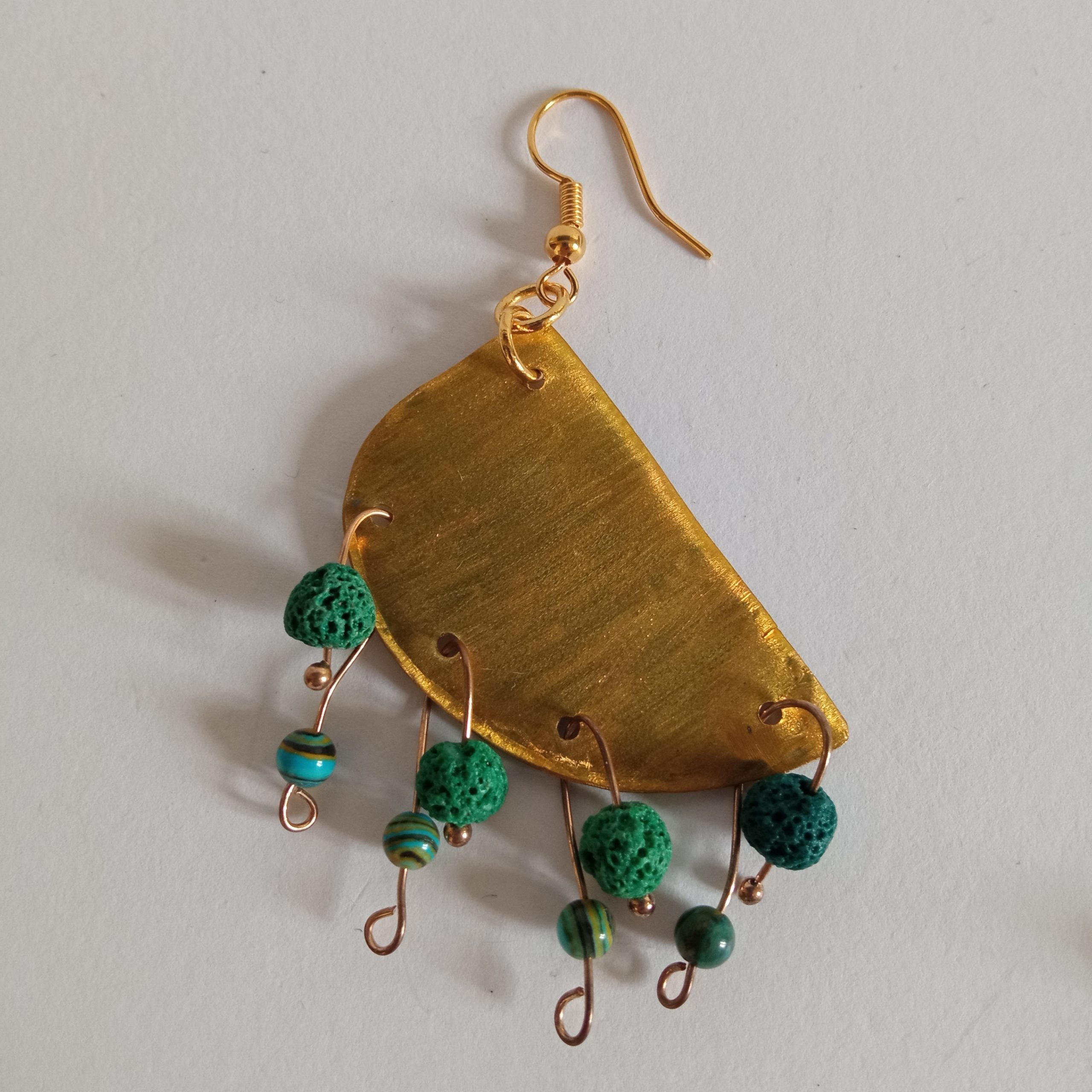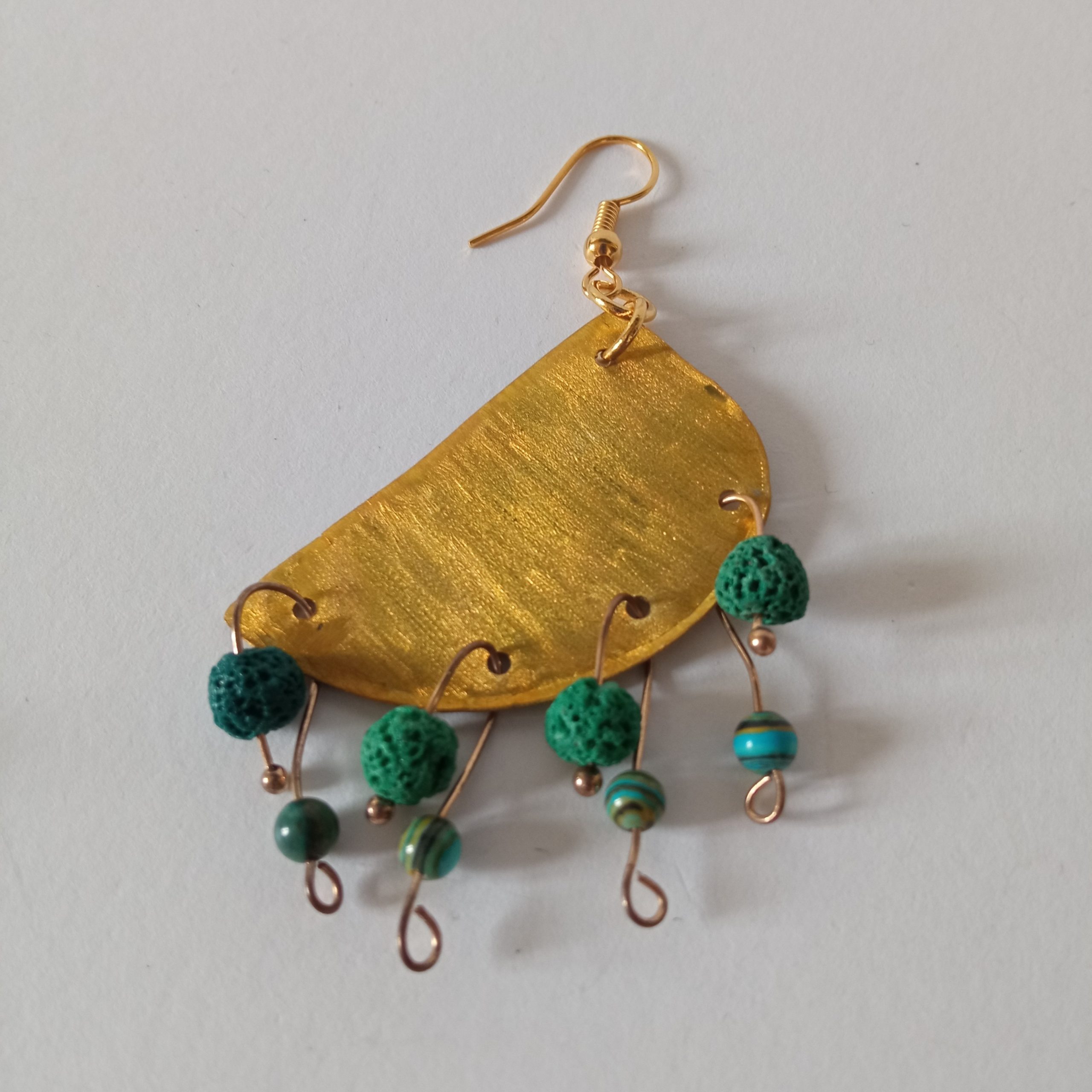 Χειροποίητα σκουλαρίκια κρεμαστά από ορείχαλκο με ημιπολύτιμες πέτρες λάβα και μαλαχίτη, σε αποχρώσεις του πράσινου και του γαλάζιου. Μοναδικό ζευγάρι.