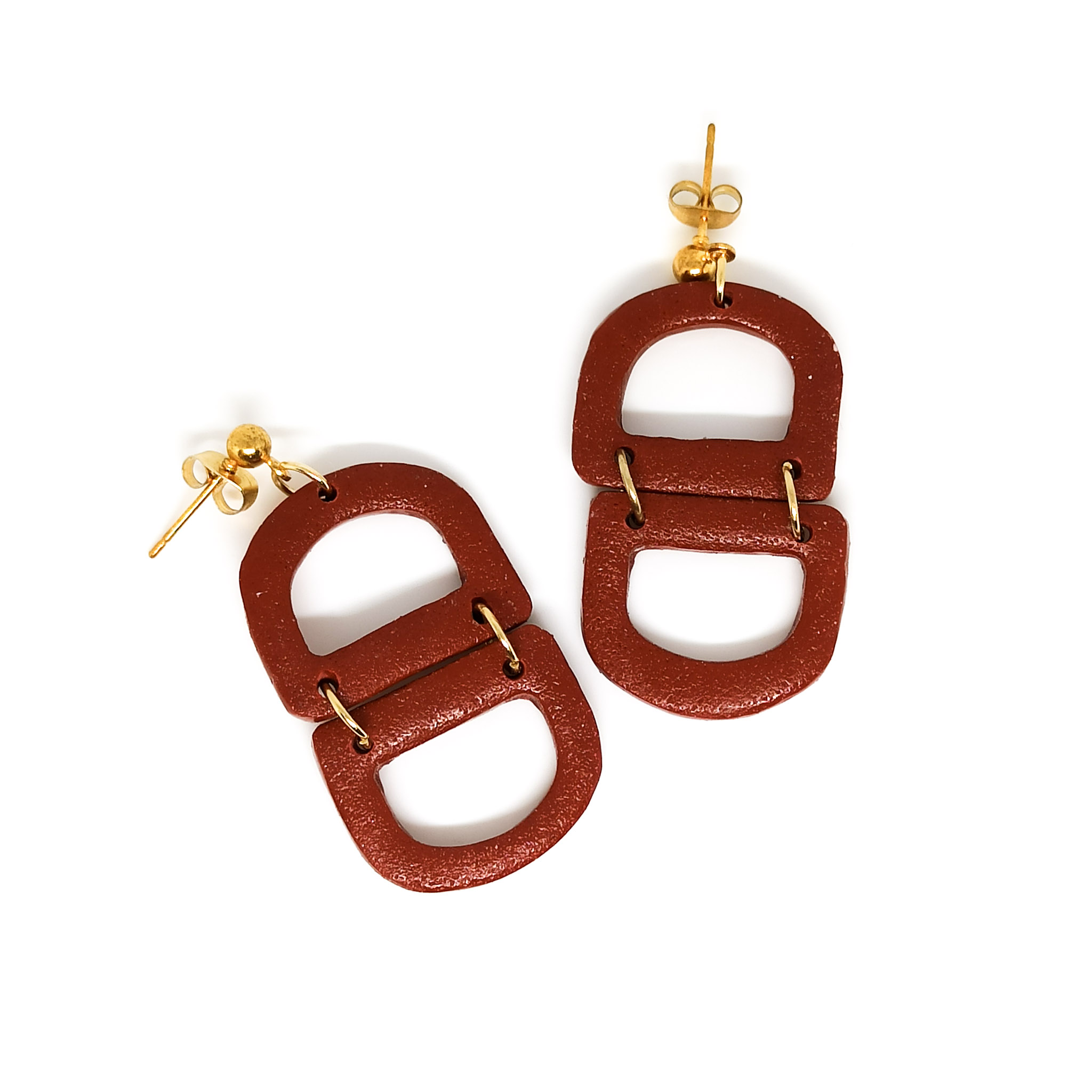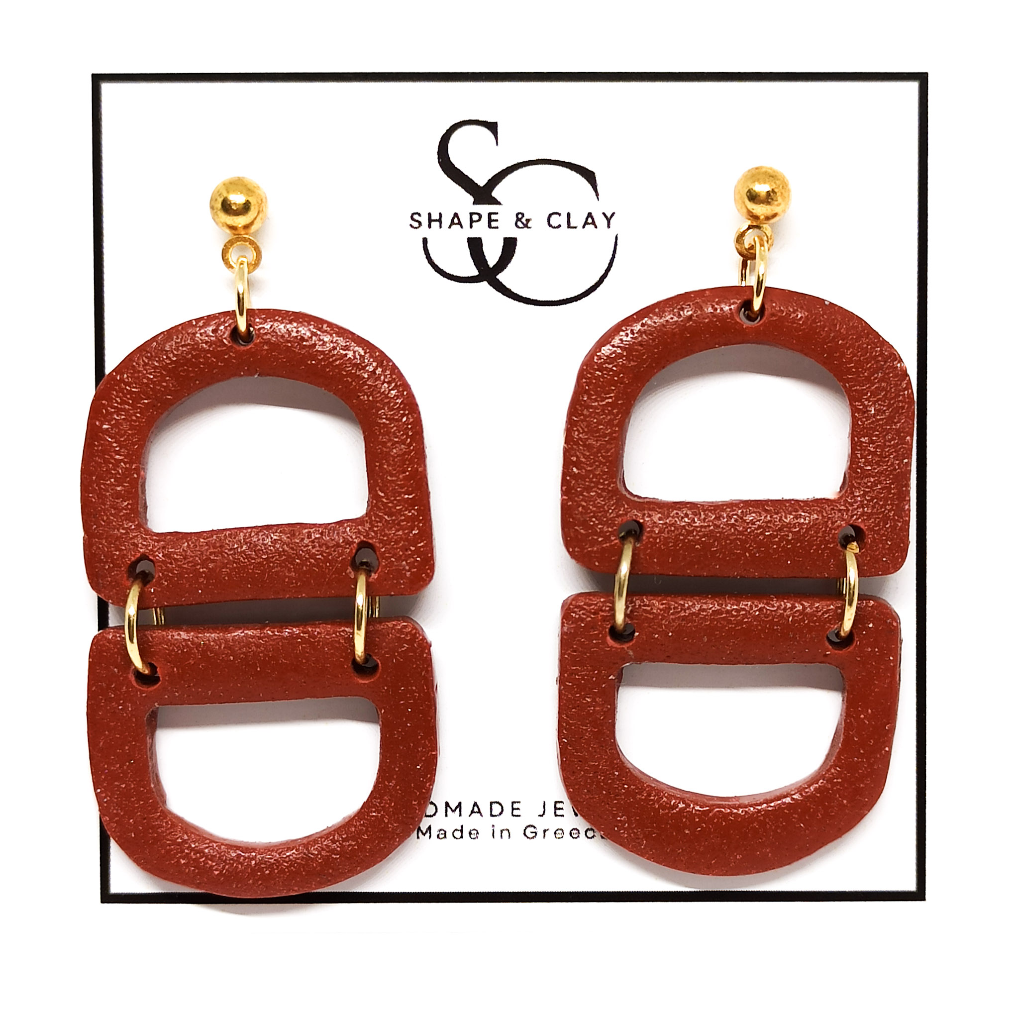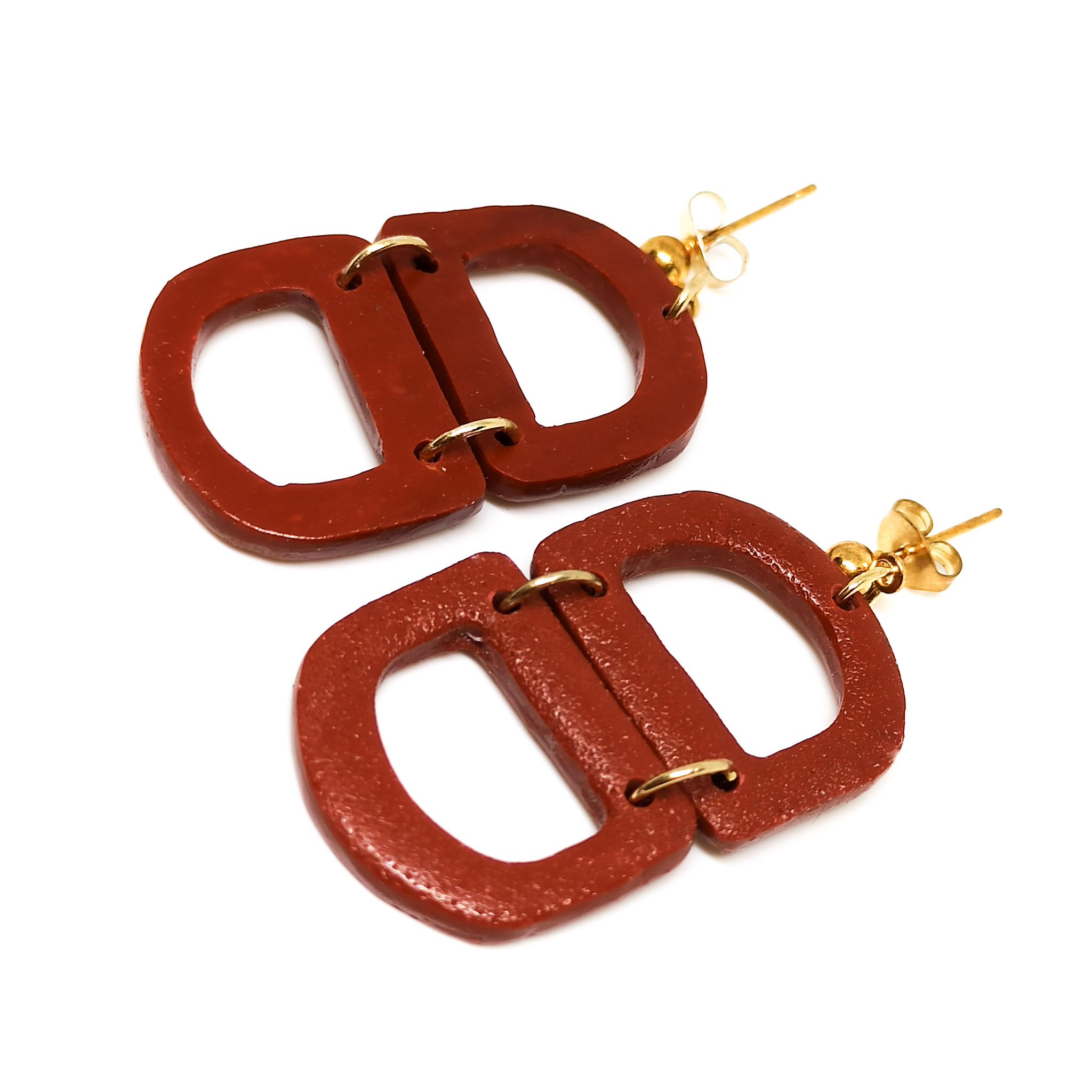 Χειροποίητα σκουλαρίκια κρεμαστά κατασκευασμένα από πολυμερικό πηλό σε σχήμα D. Προστατευμένα από gloss βερνίκι για προστασία και αντοχή. Τα μεταλλικά στοιχεία είναι από επιχρυσωμένο ανοξείδωτο υποαλλεργικό ατσάλι 304.