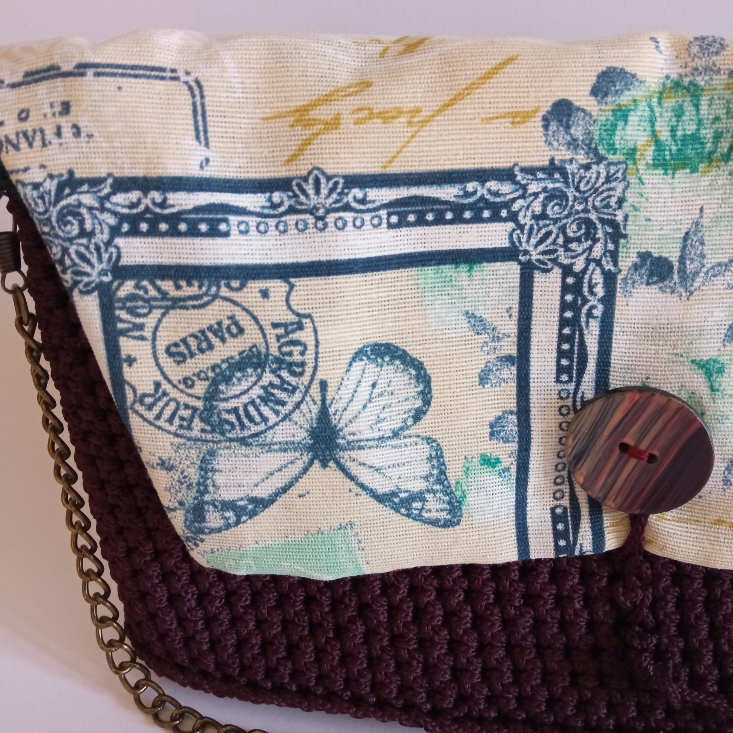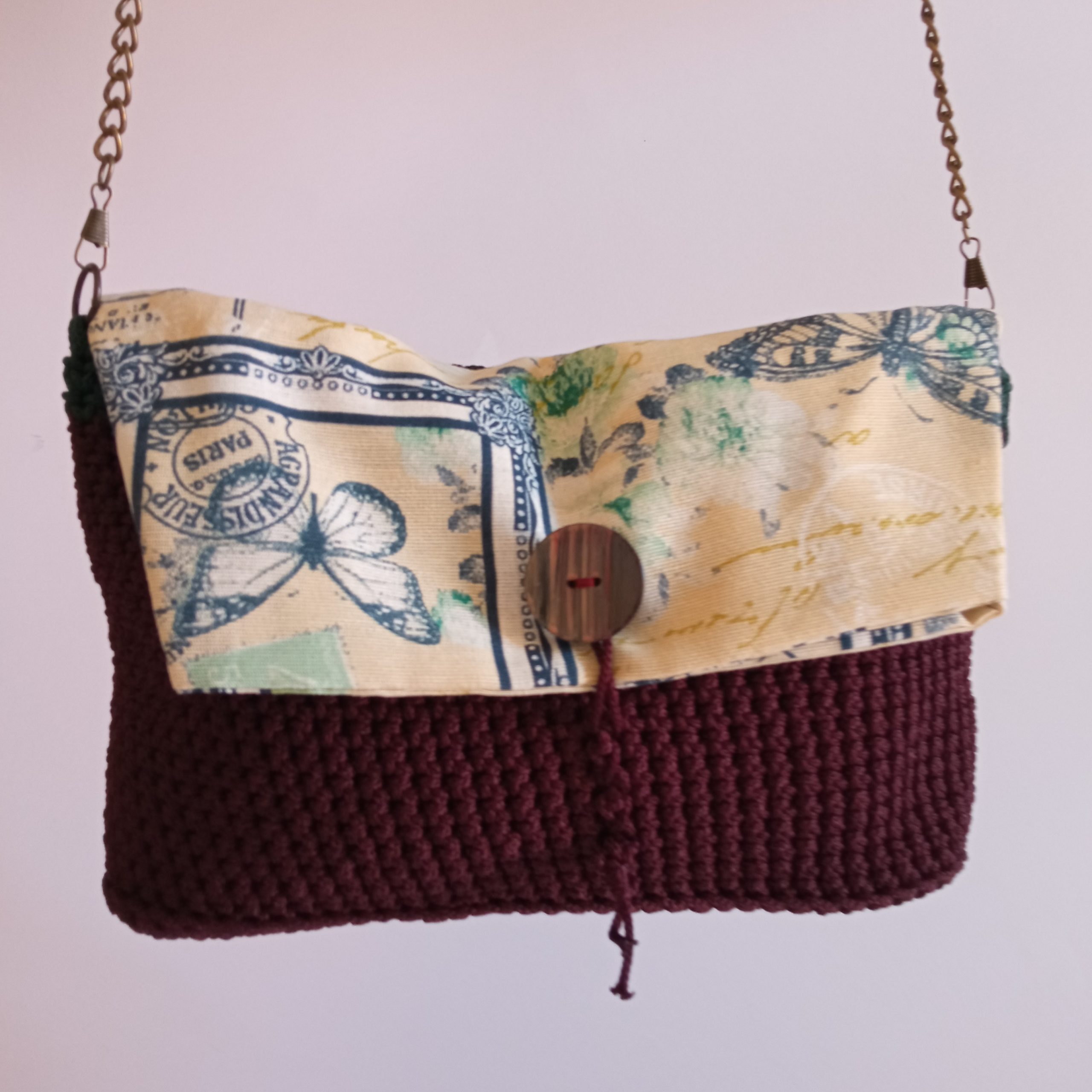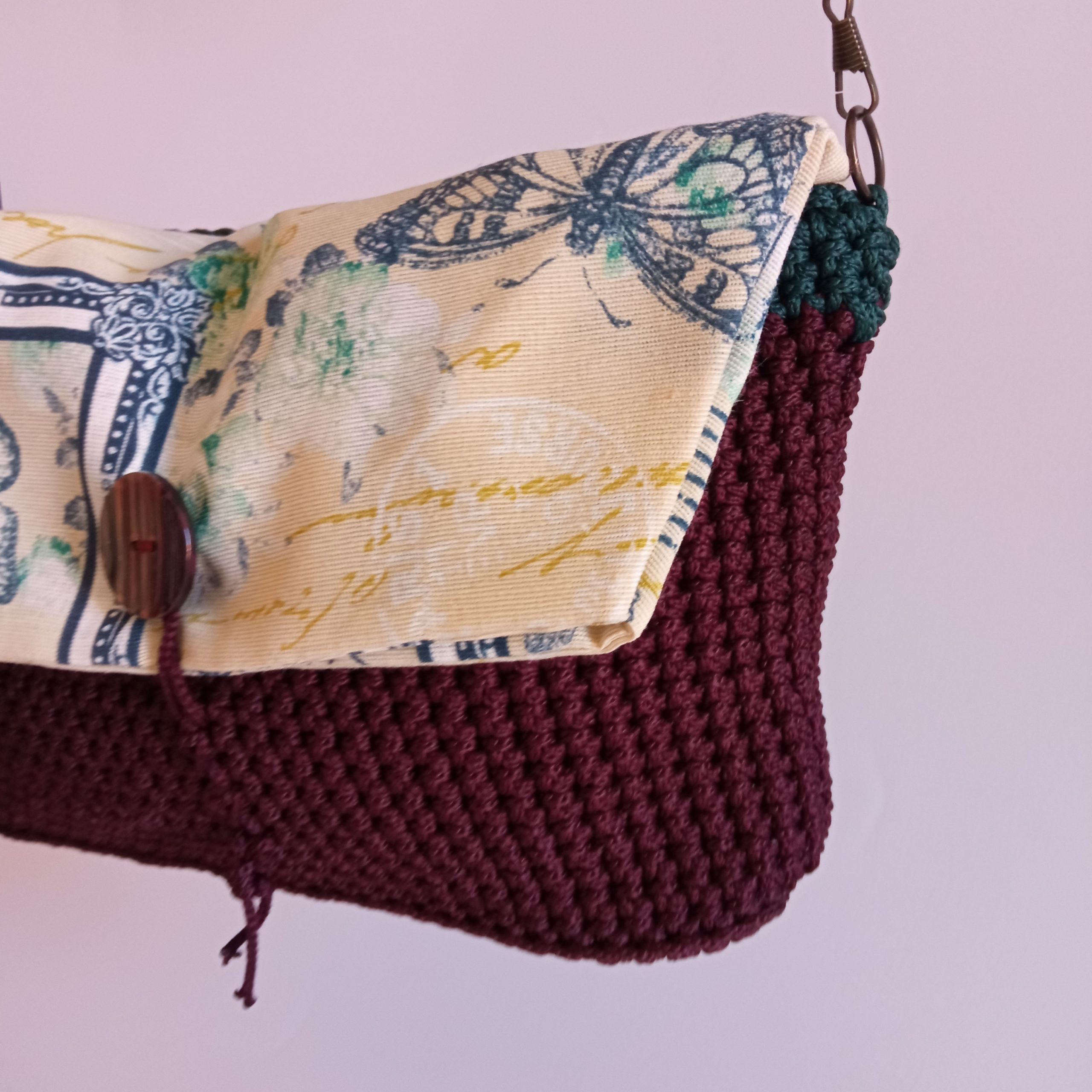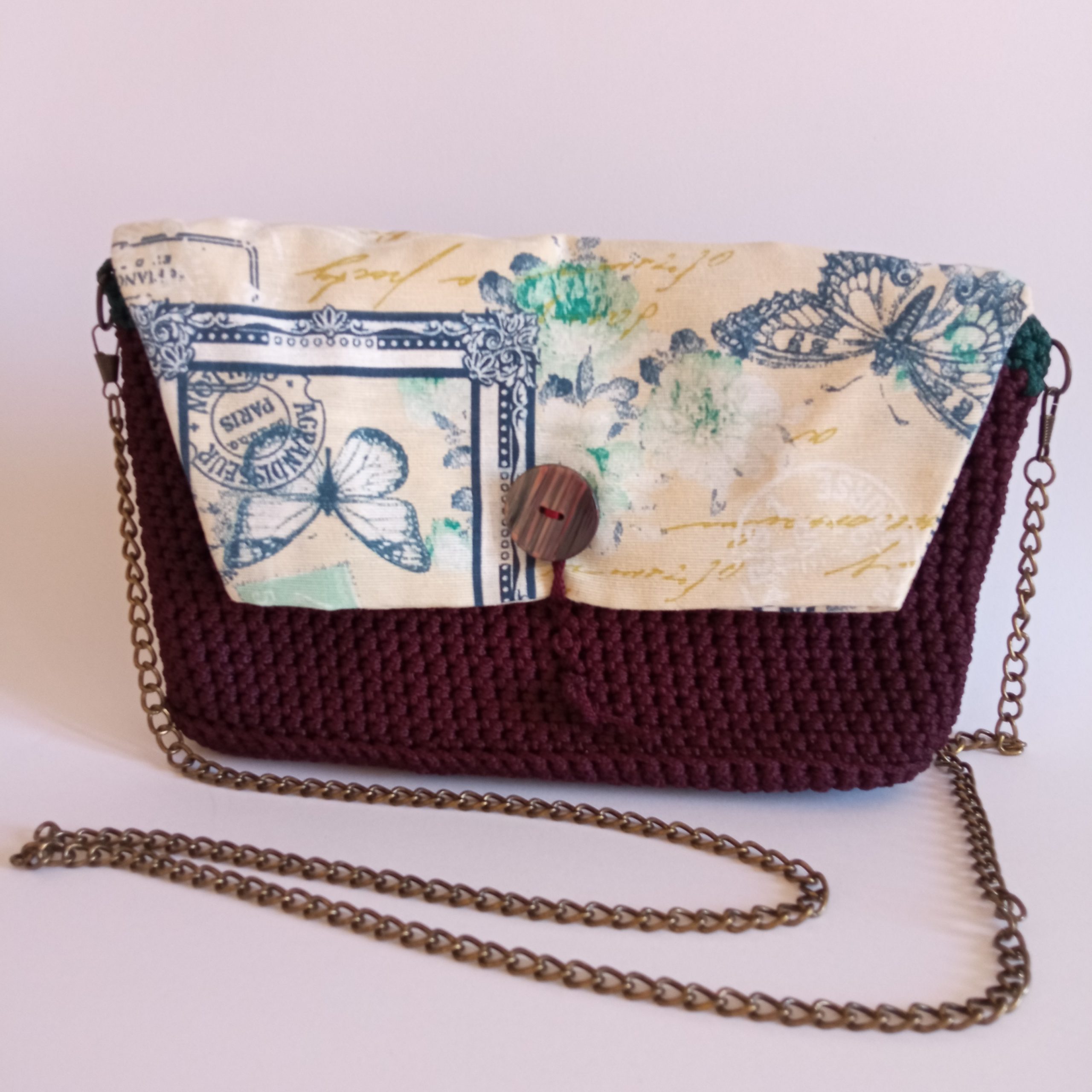 Χειροποίητη τσάντα φάκελος, ώμου ή χιαστί, πλεγμένη με βελονάκι με επένδυση ύφασμα. Τα βασικά της χρώματα είναι μπορντό σκούρο και πετρόλ. Η αλυσίδα της είναι μπρονζέ αντικέ, μπορεί να αφαιρεθεί πολύ εύκολα αν θελήσετε καθώς είναι με κλιπς. Ρομαντική, φλοράλ. Μοναδικό κομμάτι.
