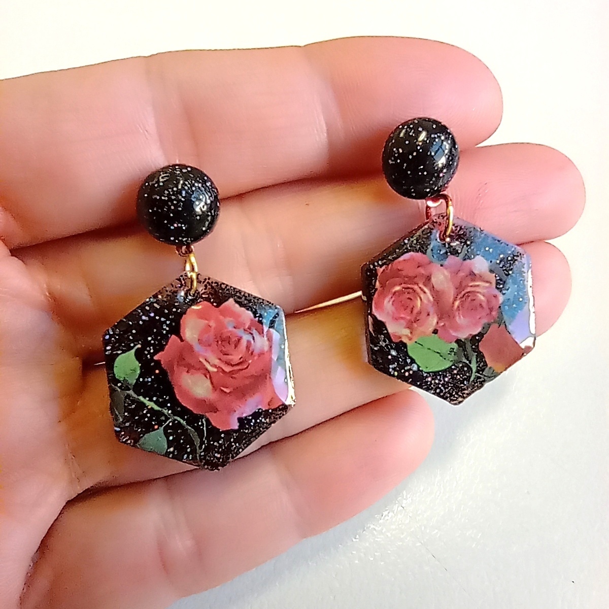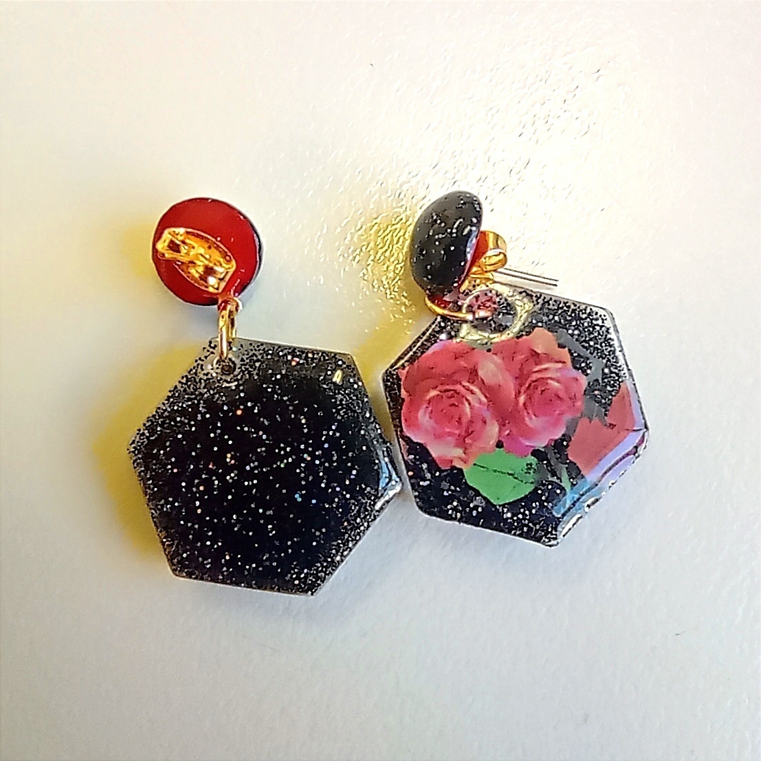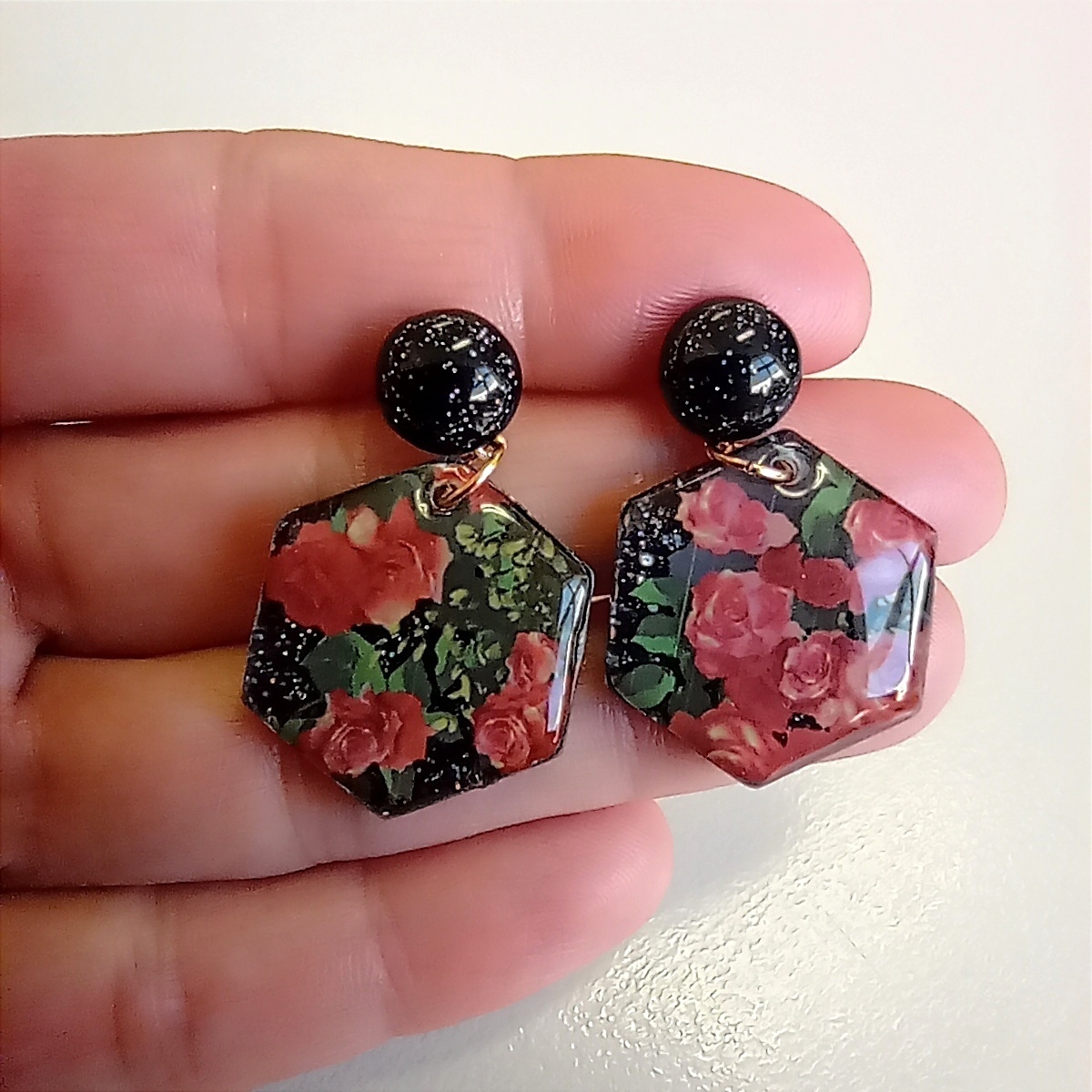 Σκουλαρίκια κρεμαστά από υγρό γυαλί με τριαντάφυλλα. Το μοτίβο μπορεί να διαφέρει ελαφρώς.