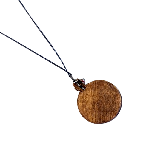 Χειροποίητο κολιέ κέντημα με βαμβακερές κλωστές, σε λευκό ύφασμα κεντήματος και χρωματιστές χάντρες σε ξύλινο μίνι τελάρο (διάμετρος 3εκ.).