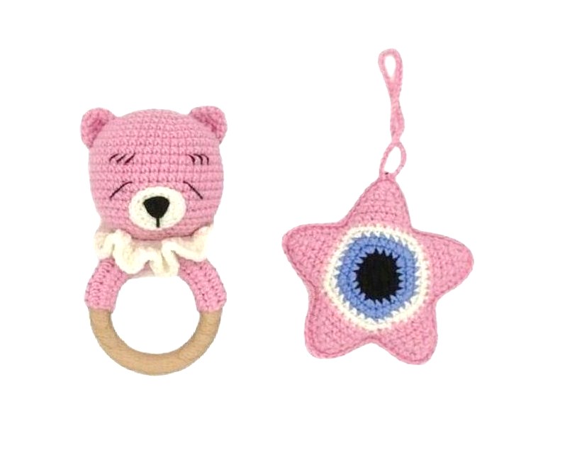 Σετ που αποτελείται από μια χειροποίητη πλεκτή κουδουνίστρα με μασητικό κρίκο και ένα ματάκι