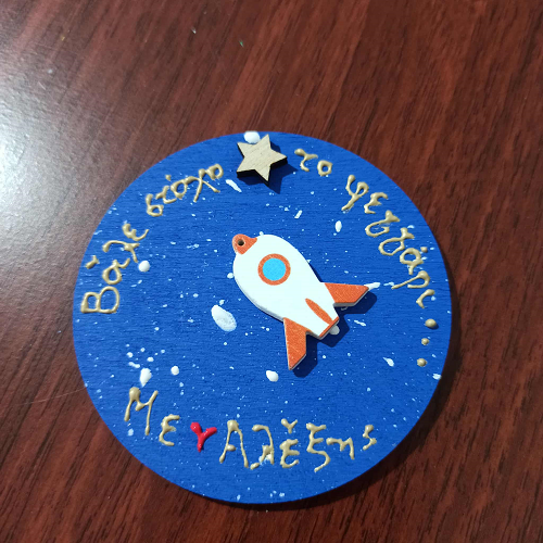 Μαγνητάκι σε ξύλινη βάση 7 cm στο χρώμα που θα επιλέξεις (δες στο πεδίο ΧΡΩΜΑ- αν επιλέξεις συνδυασμό χρωμάτων γράψε μου ΟΠΩΣΔΗΠΟΤΕ στα σχόλια πόσα τμχ από κάθε χρώμα θα χρειαστείς) με αστεράκι στο πάνω μέρος και φόντο το διάστημα, αφιέρωση για τους φίλους ή συμμαθητές του παιδιού(επέλεξε στο πεδίο ΣΧΕΔΙΟ την αφιέρωση ή αν θες δικά σου λογάκια να μην είναι πάνω από 4-5 λεξούλες, μικρές ε? ) και το όνομά του παιδιού στο κάτω μέρος. (με <3 όνομα)…