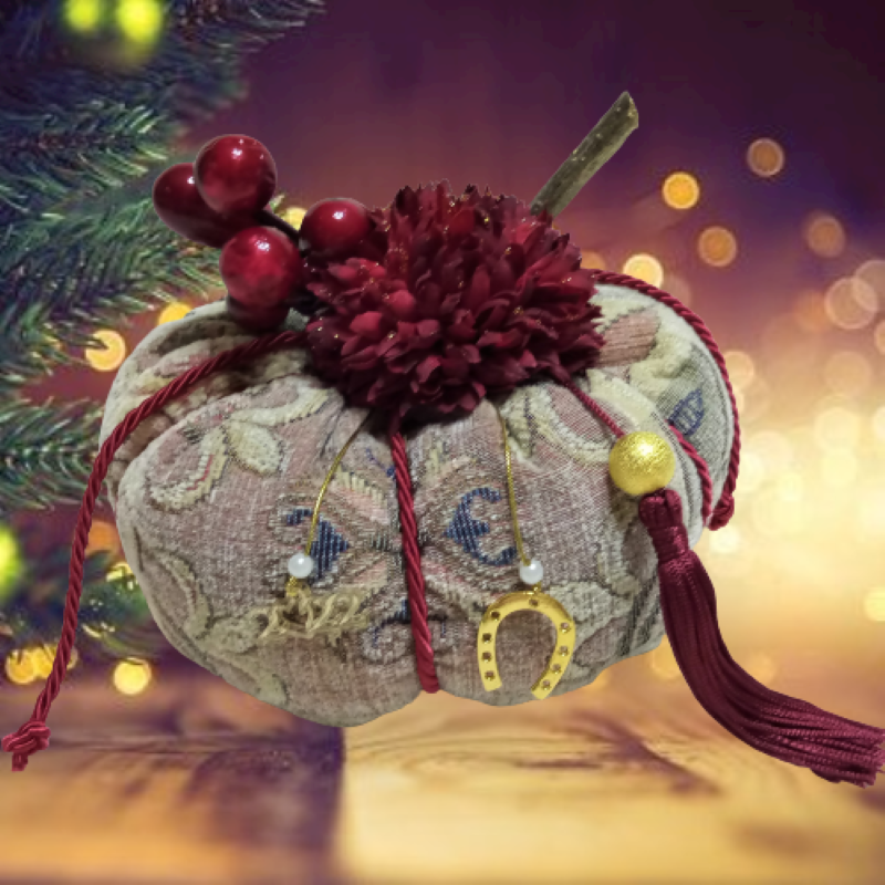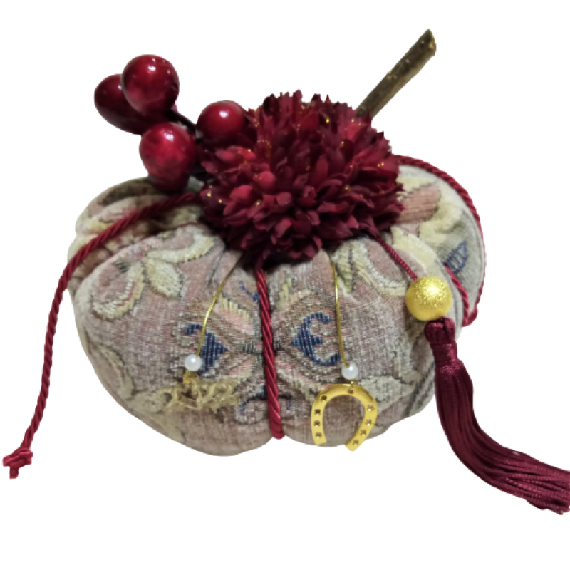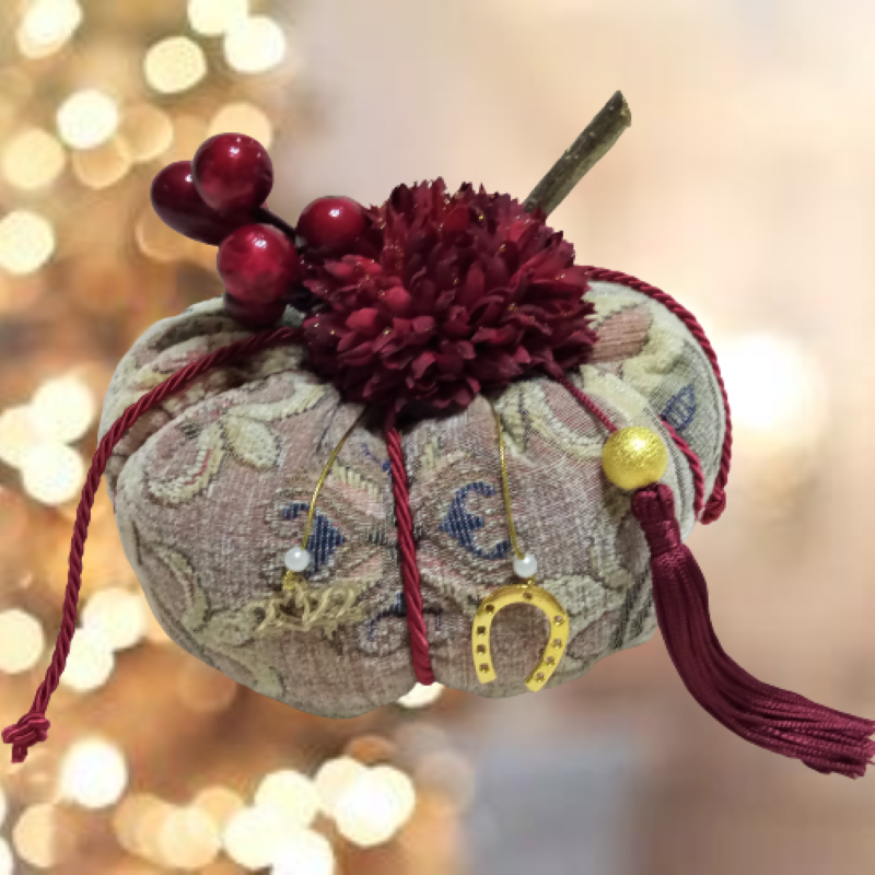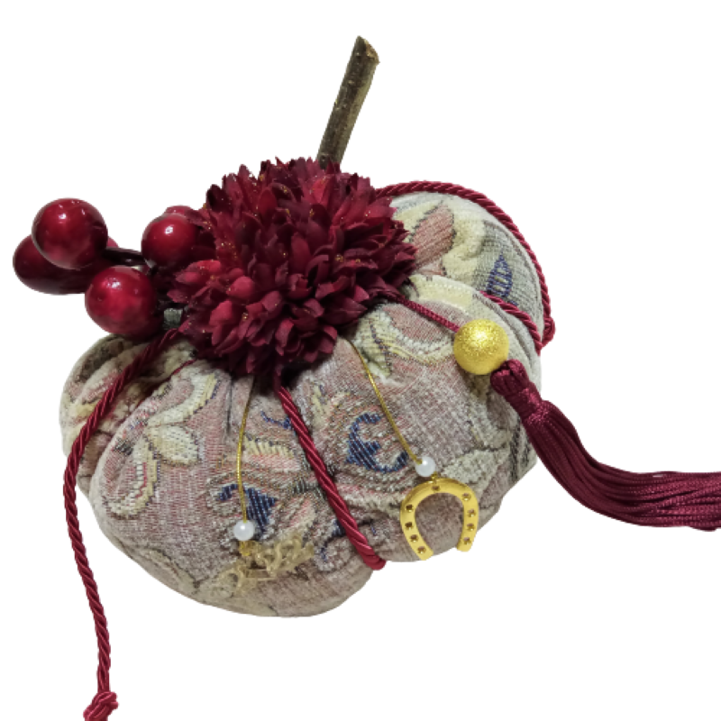 Μοναδική χειροποίητη κολοκύθα – Γούρι από μπροκάρ ύφασμα με μπορντό λουλούδι
