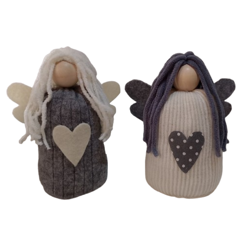 Σετ 2 τεμ. χειροποίητα αγγελάκια για να διακοσμήσετε γιορτινά το χώρο σας ή να τα δωρίσετε . Τα υλικά που χρησιμοποιήσαμε για την κατασκευή τους είναι πλεκτό ύφασμα, ξύλο, βελουτέ νήμα και τσόχα.Ύψος 20,5 εκ.