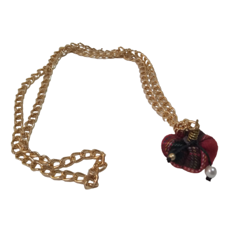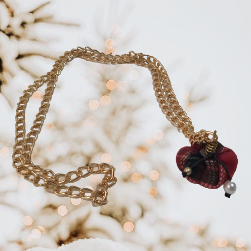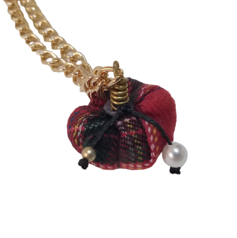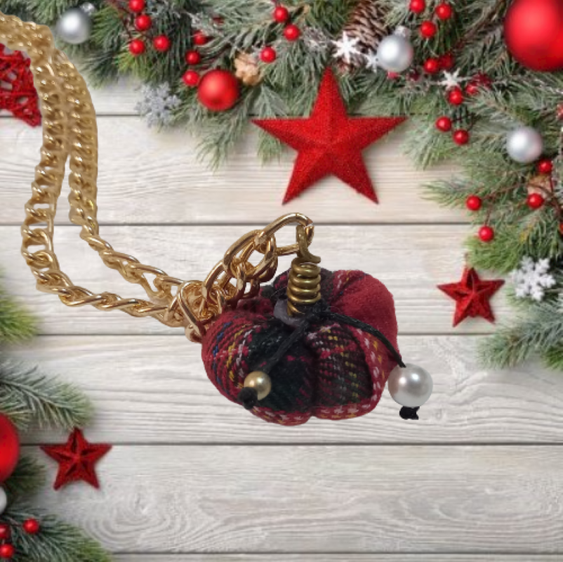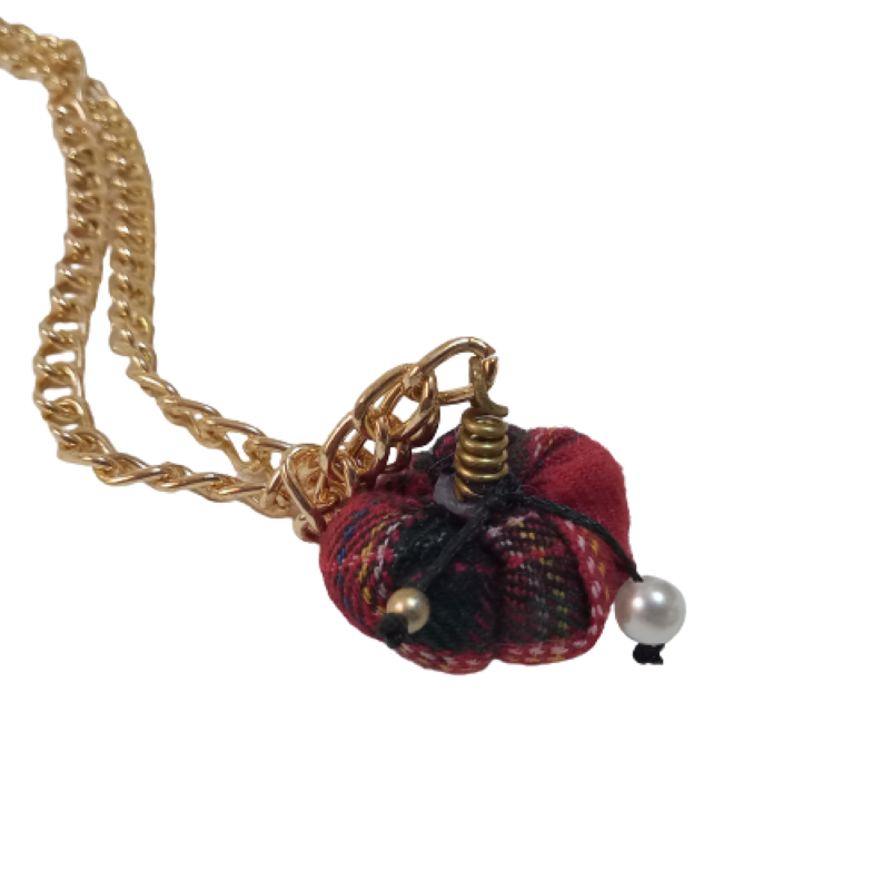 Μακρύ Χριστουγεννιάτικο κολιέ ( 41 εκ. ) με κεντρικό στοιχείο χειροποίητη mini κολοκύθα από ύφασμα κόκκινο καρό με κοτσάνι χειροποίητο από ορείχαλκο σε χοντρή μεταλλική αλυσίδα σε χρυσό χρώμα, περλίτσα και χρυσαφί χαντρούλα.