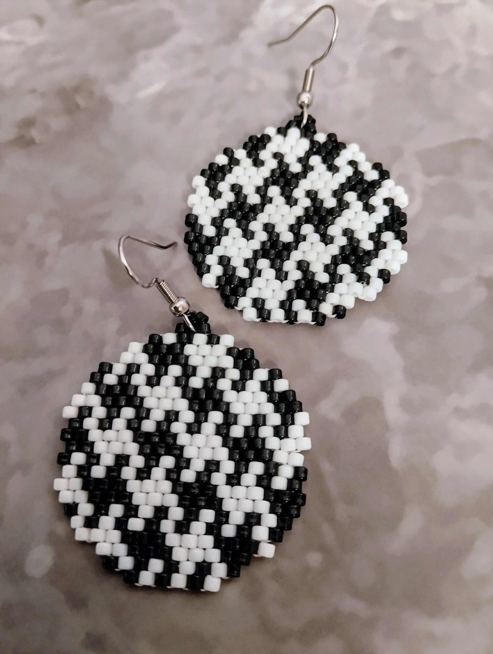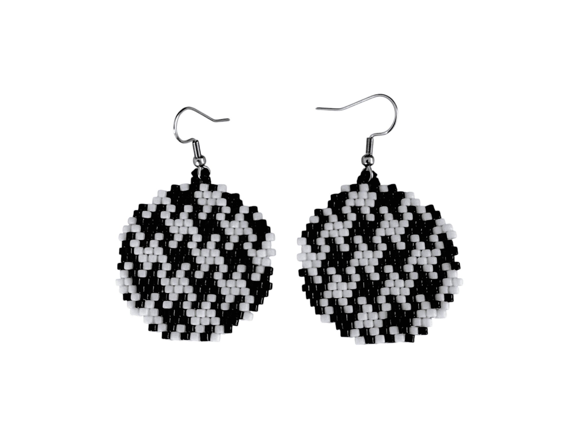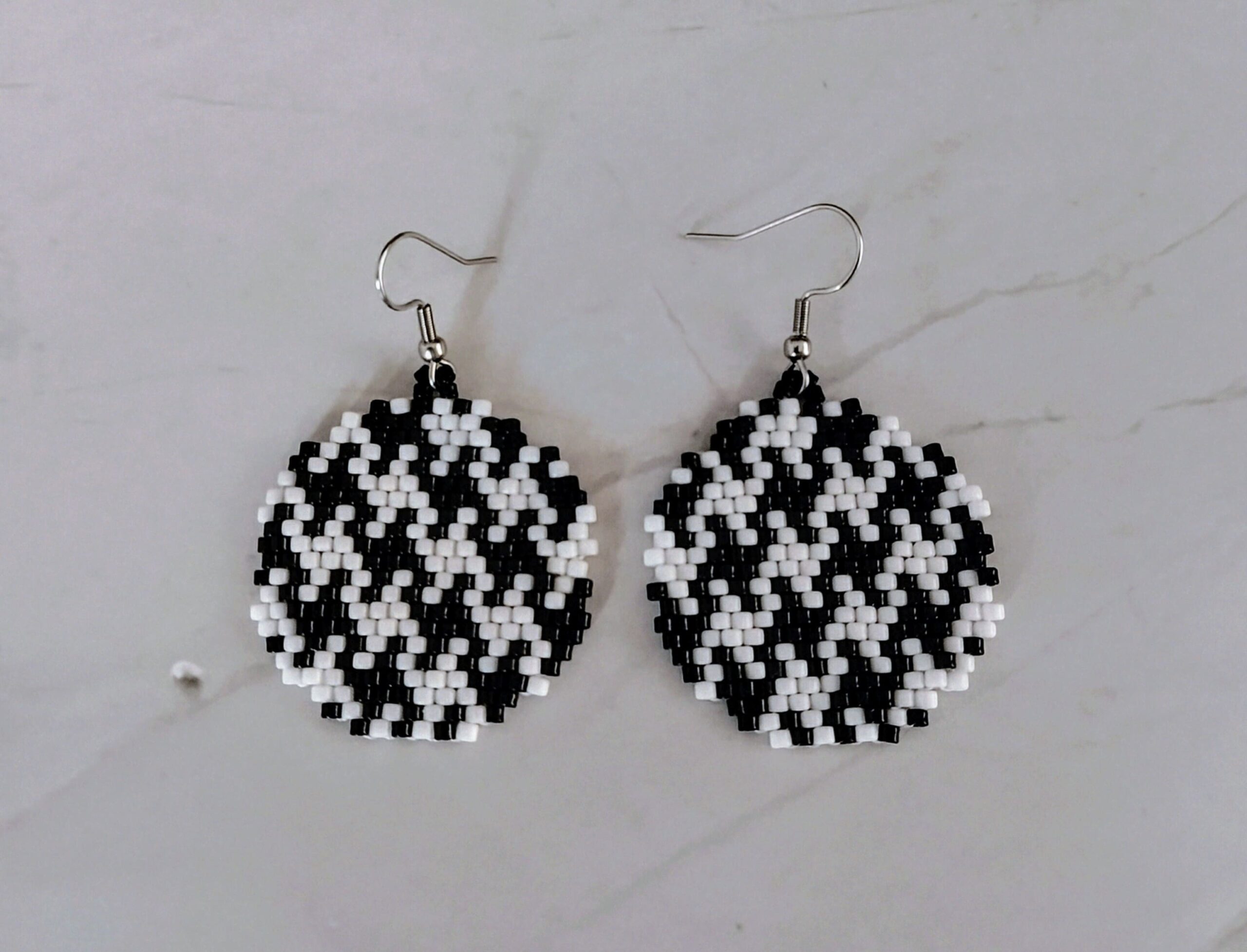 Ξεχωριστό και πανέμορφο αυτό το χειροποίητο σετ ατσάλινα σκουλαρίκια σε σχήμα στρογγυλό. Είναι ένα παιχνίδι μεταξύ του μαύρου και του άσπρου και είναι με χάντρες miyuki.