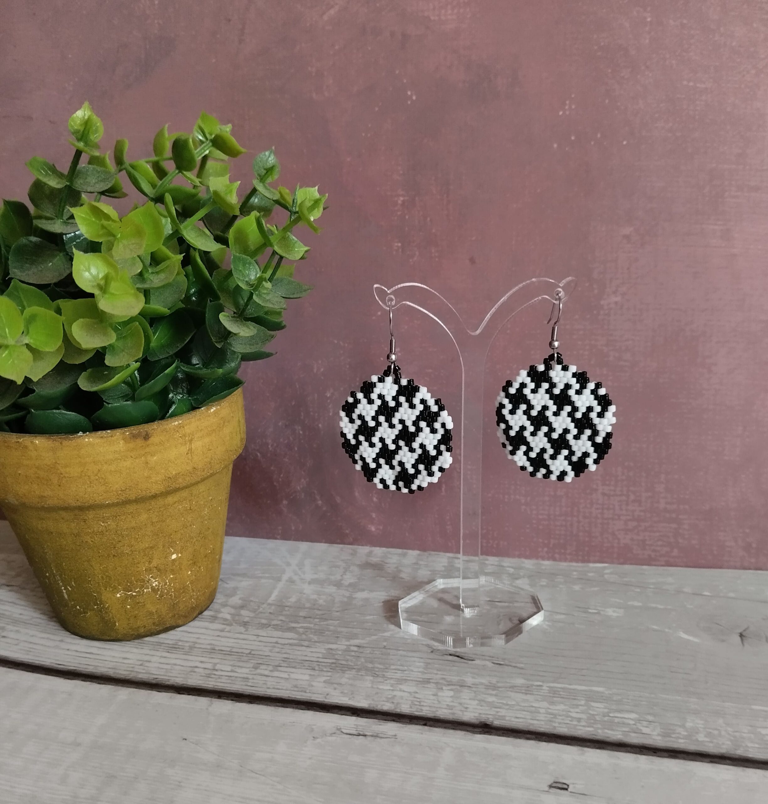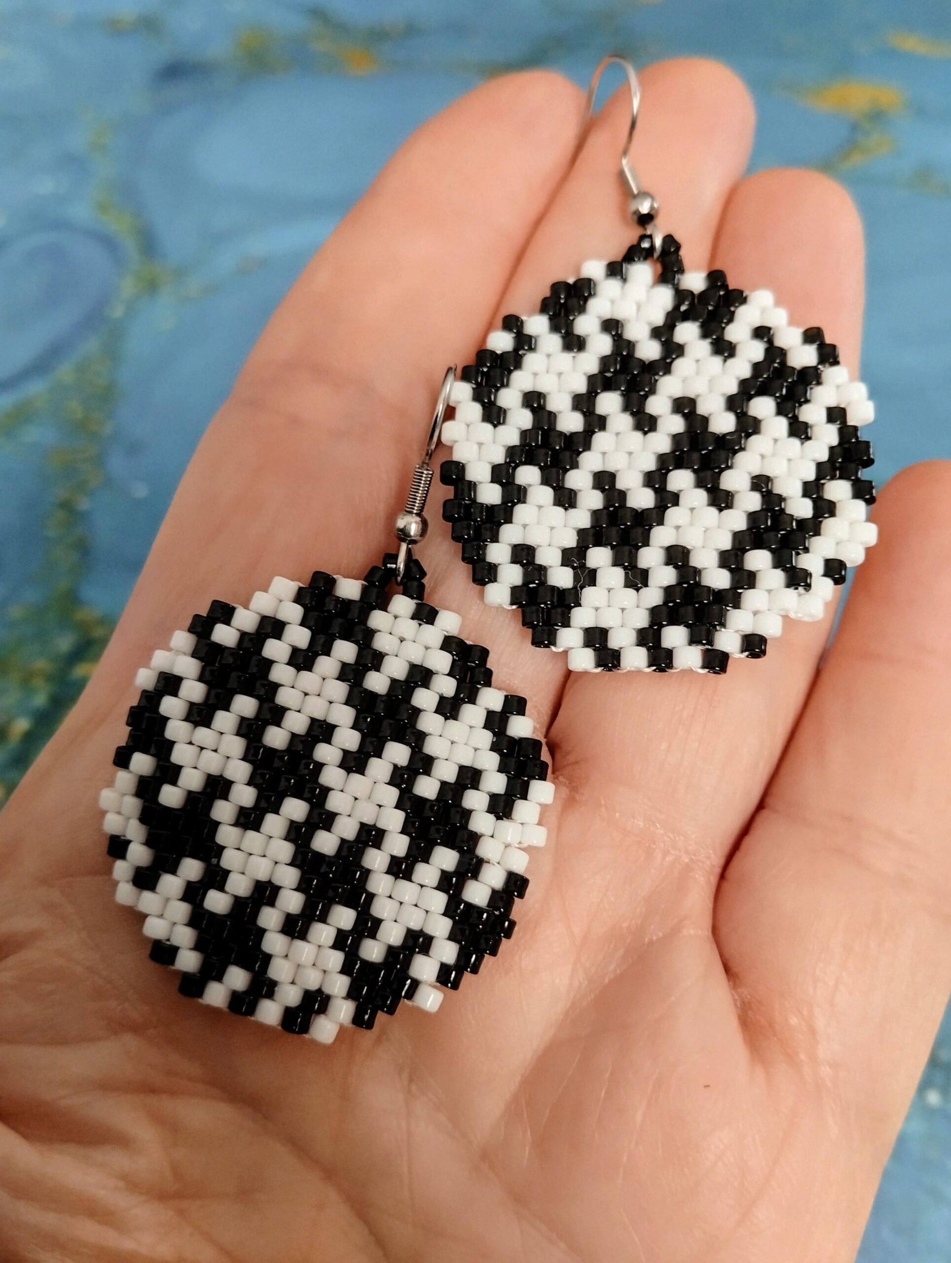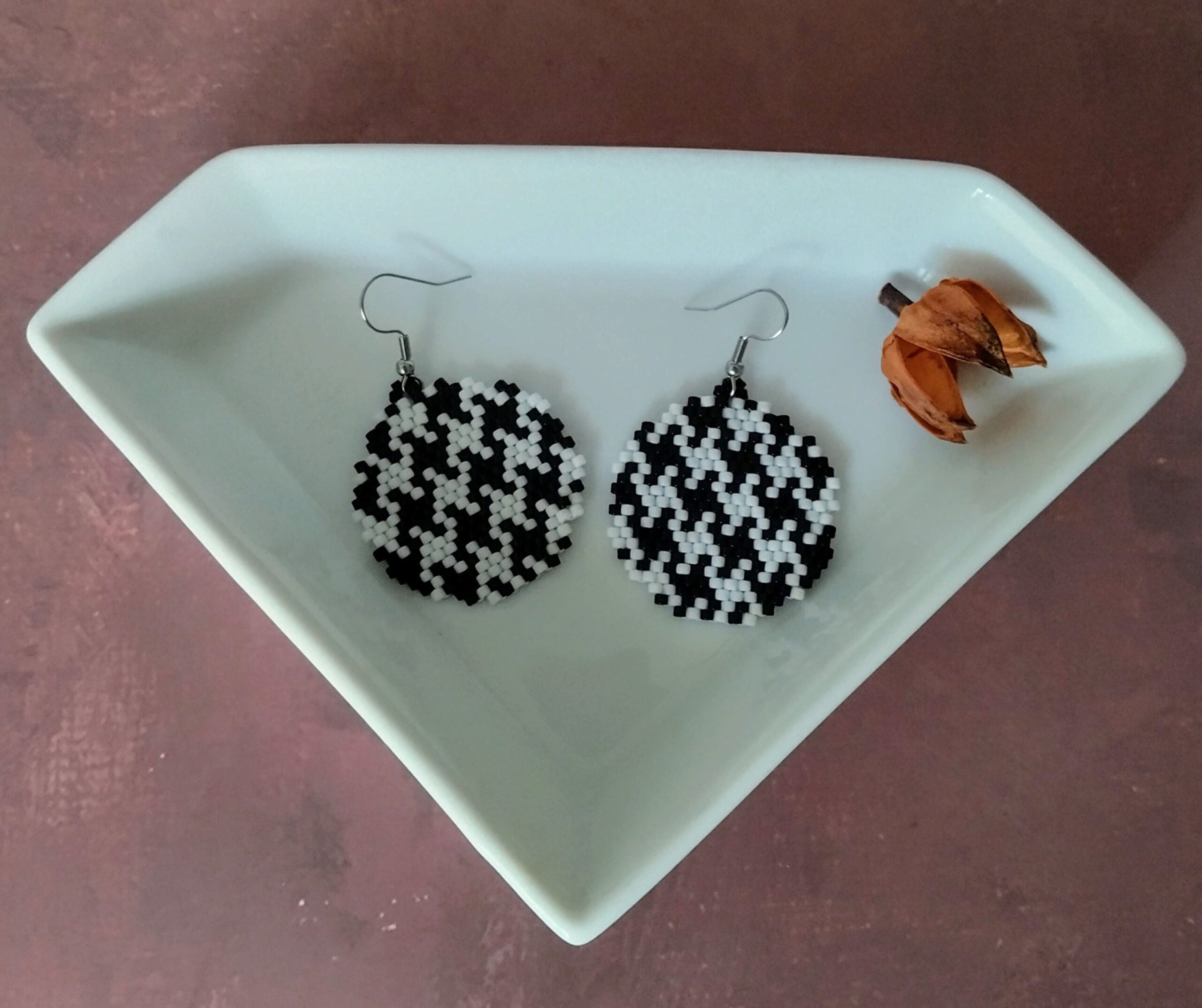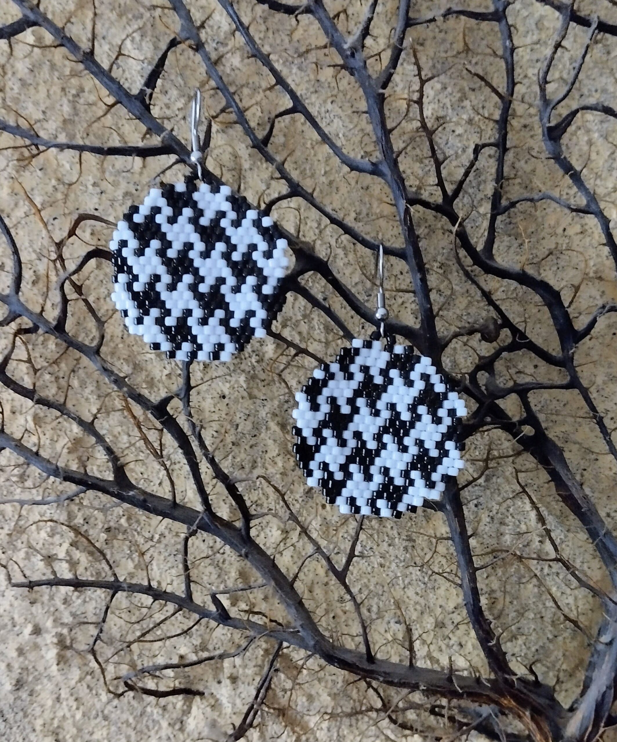 Ξεχωριστό και πανέμορφο αυτό το χειροποίητο σετ ατσάλινα σκουλαρίκια σε σχήμα στρογγυλό. Είναι ένα παιχνίδι μεταξύ του μαύρου και του άσπρου και είναι με χάντρες miyuki.