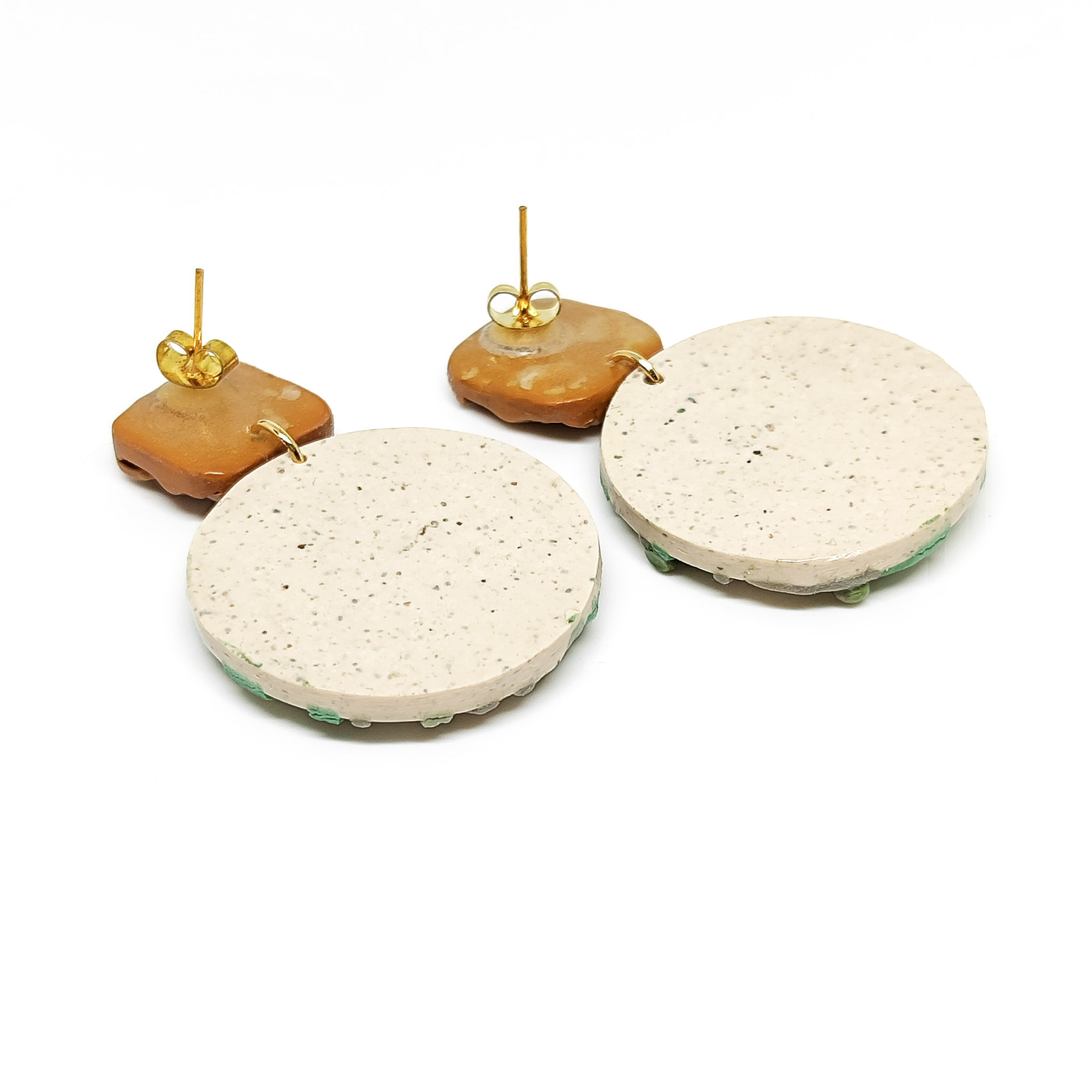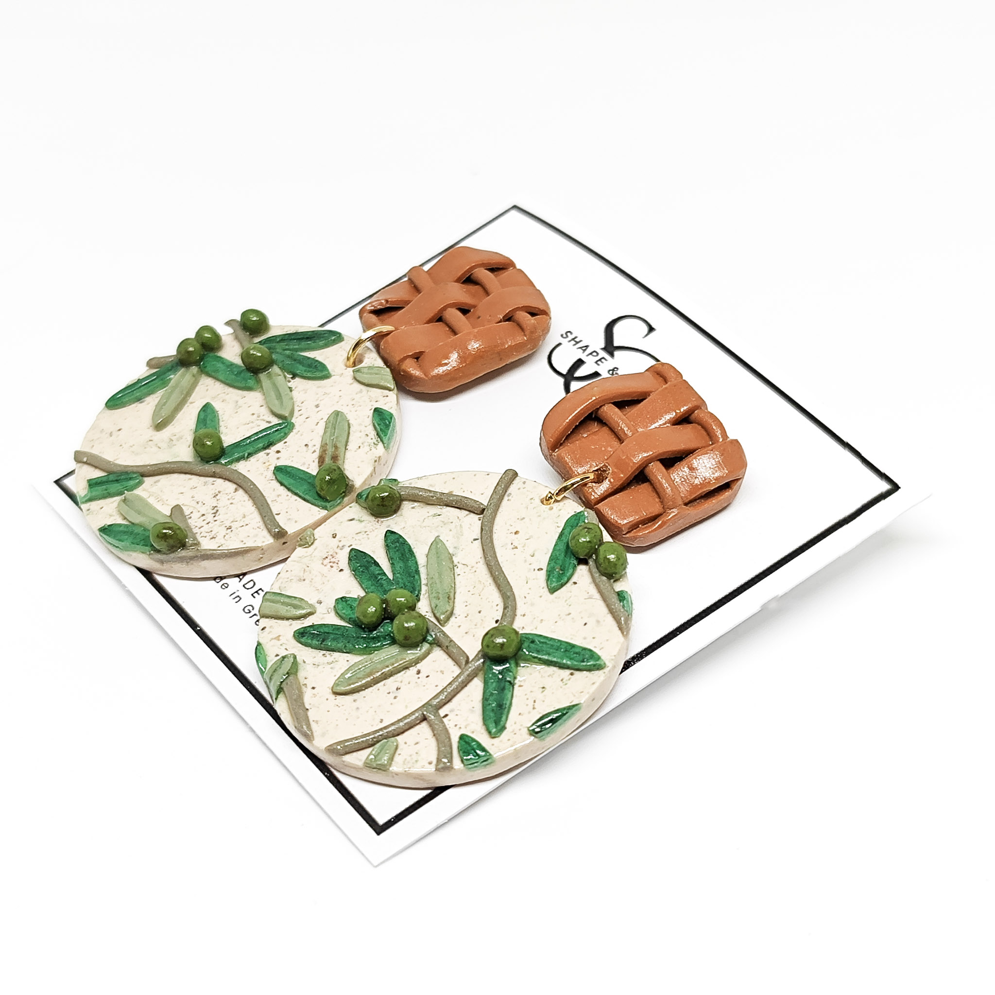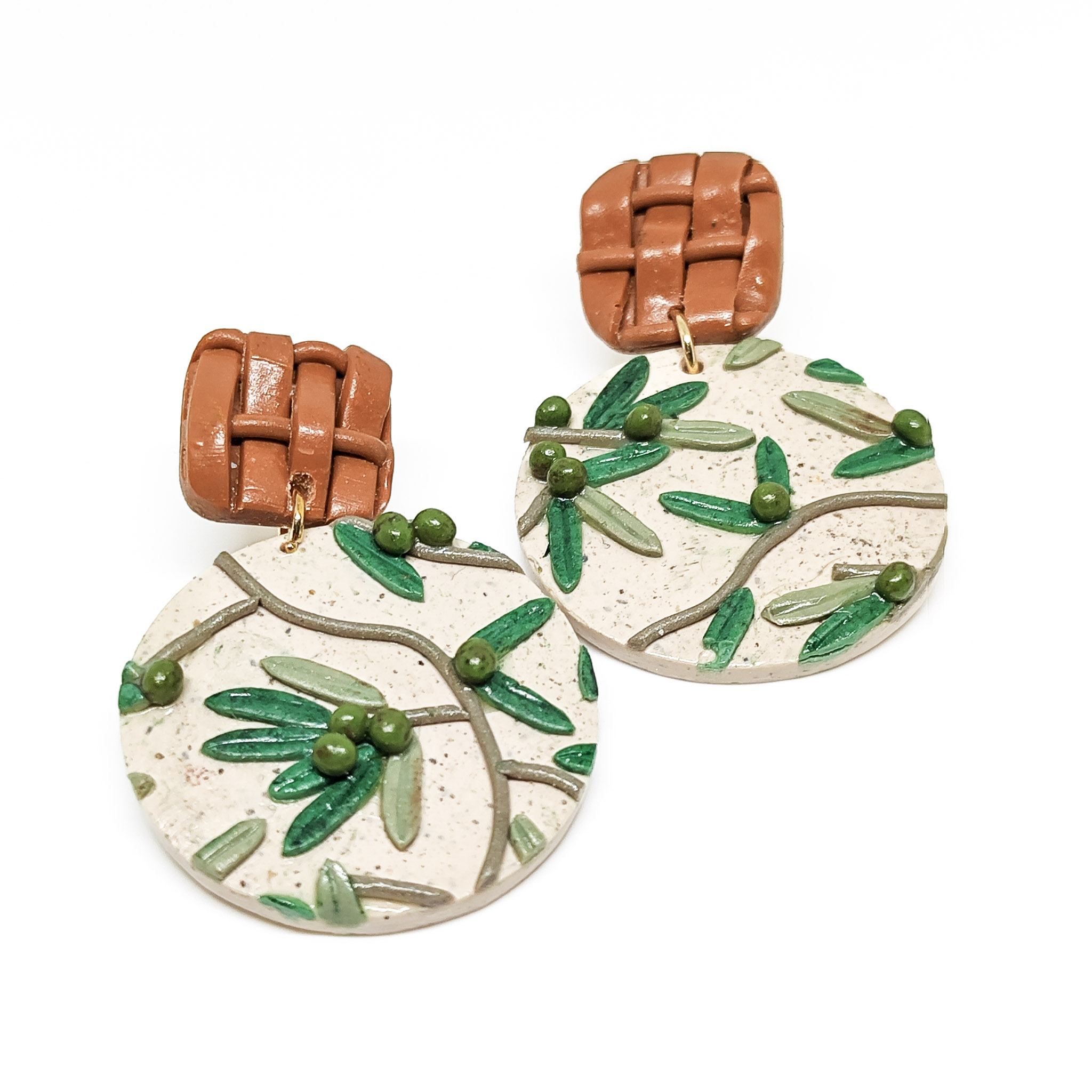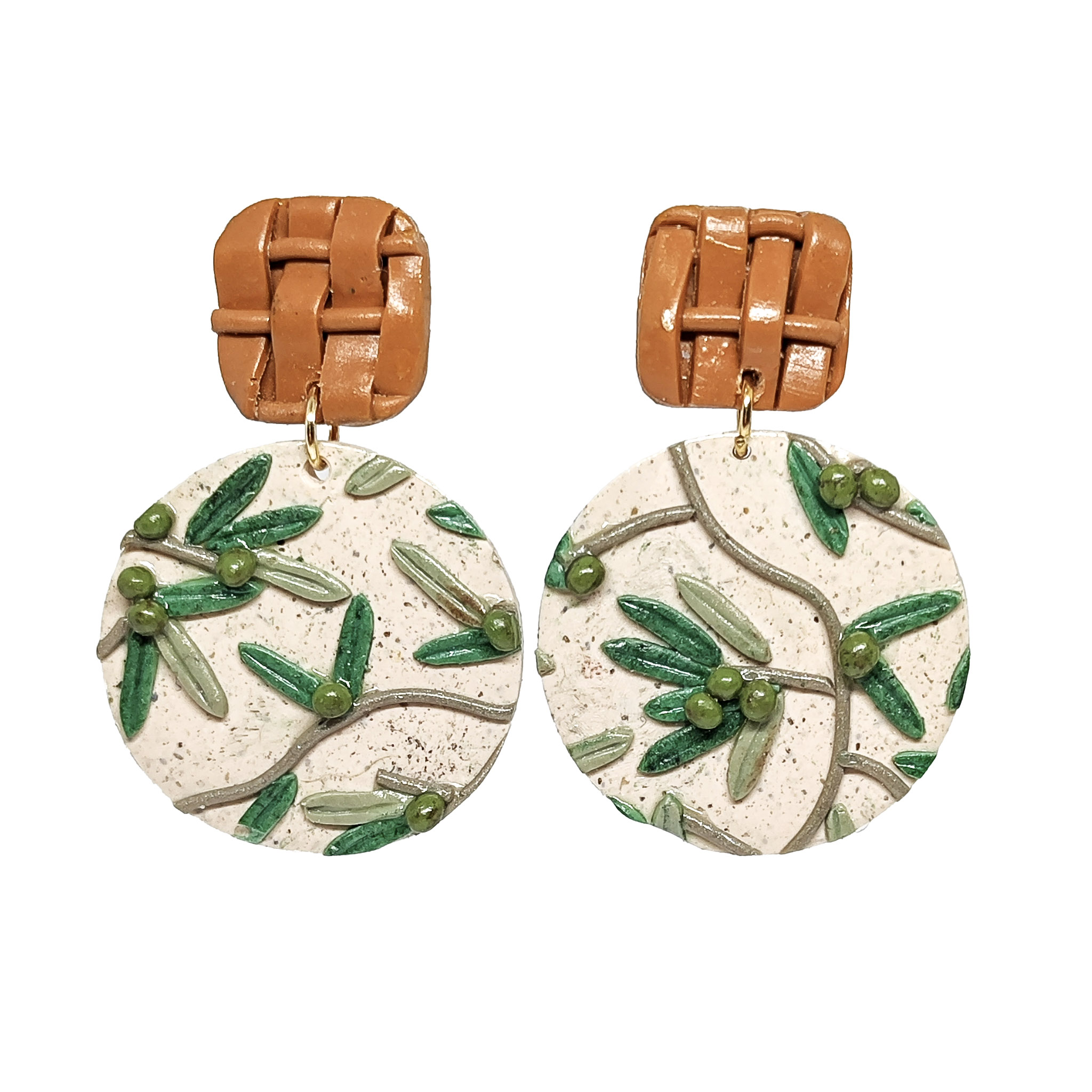 Χειροποίητα σκουλαρίκια καρφωτά κατασκευασμένα από πολυμερικό πηλό και με σχέδιο ψάθα και κλαδιά από ελιάς. Προστατευμένα από gloss βερνίκι για προστασία και αντοχή. Τα μεταλλικά στοιχεία είναι από επιχρυσωμένο ανοξείδωτο υποαλλεργικό ατσάλι 304.