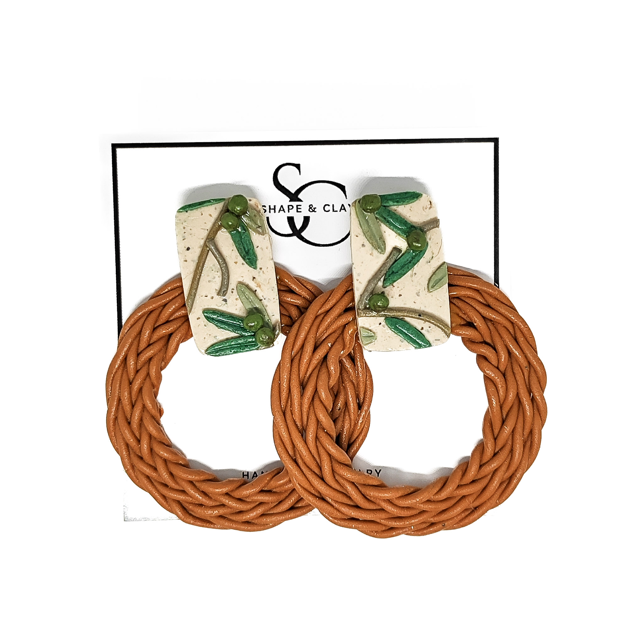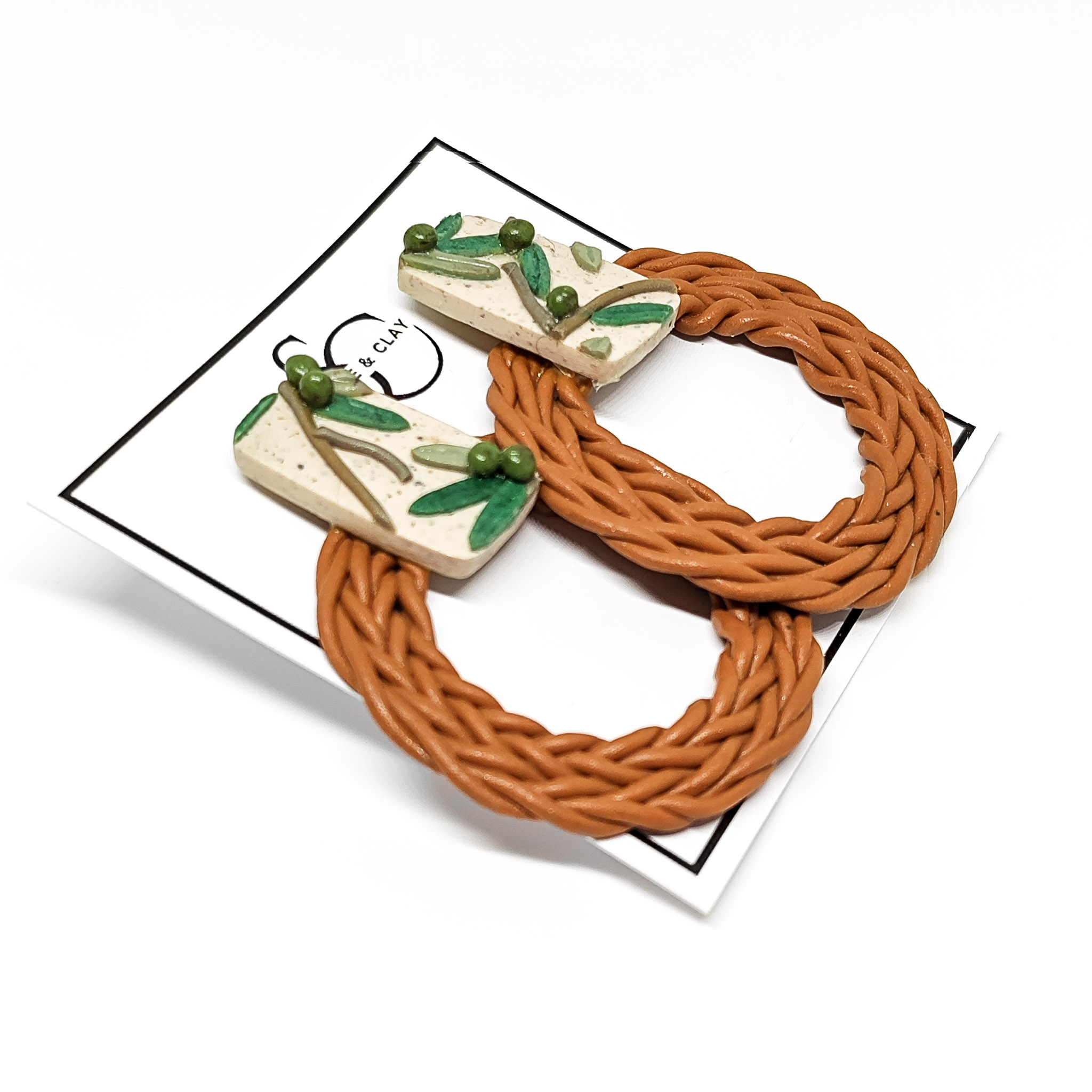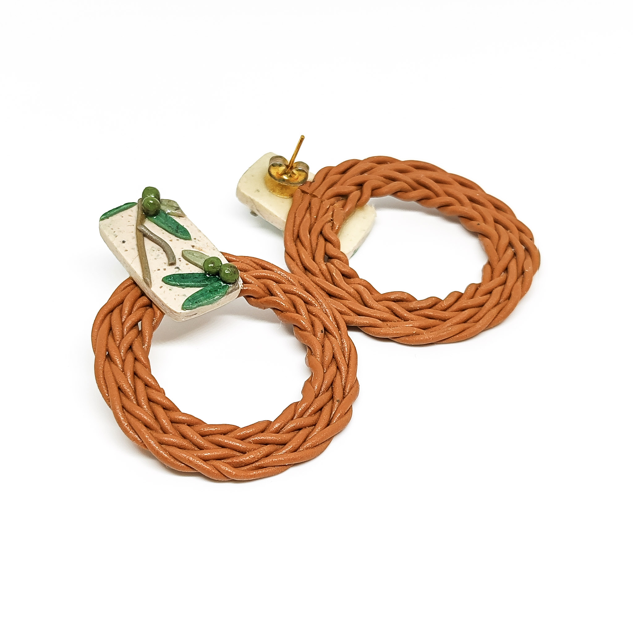 Χειροποίητα σκουλαρίκια καρφωτά κατασκευασμένα από πολυμερικό πηλό και με σχέδιο ψάθα και κλαδιά από ελιάς. Προστατευμένα από gloss βερνίκι για προστασία και αντοχή. Τα μεταλλικά στοιχεία είναι από επιχρυσωμένο ανοξείδωτο υποαλλεργικό ατσάλι 304.