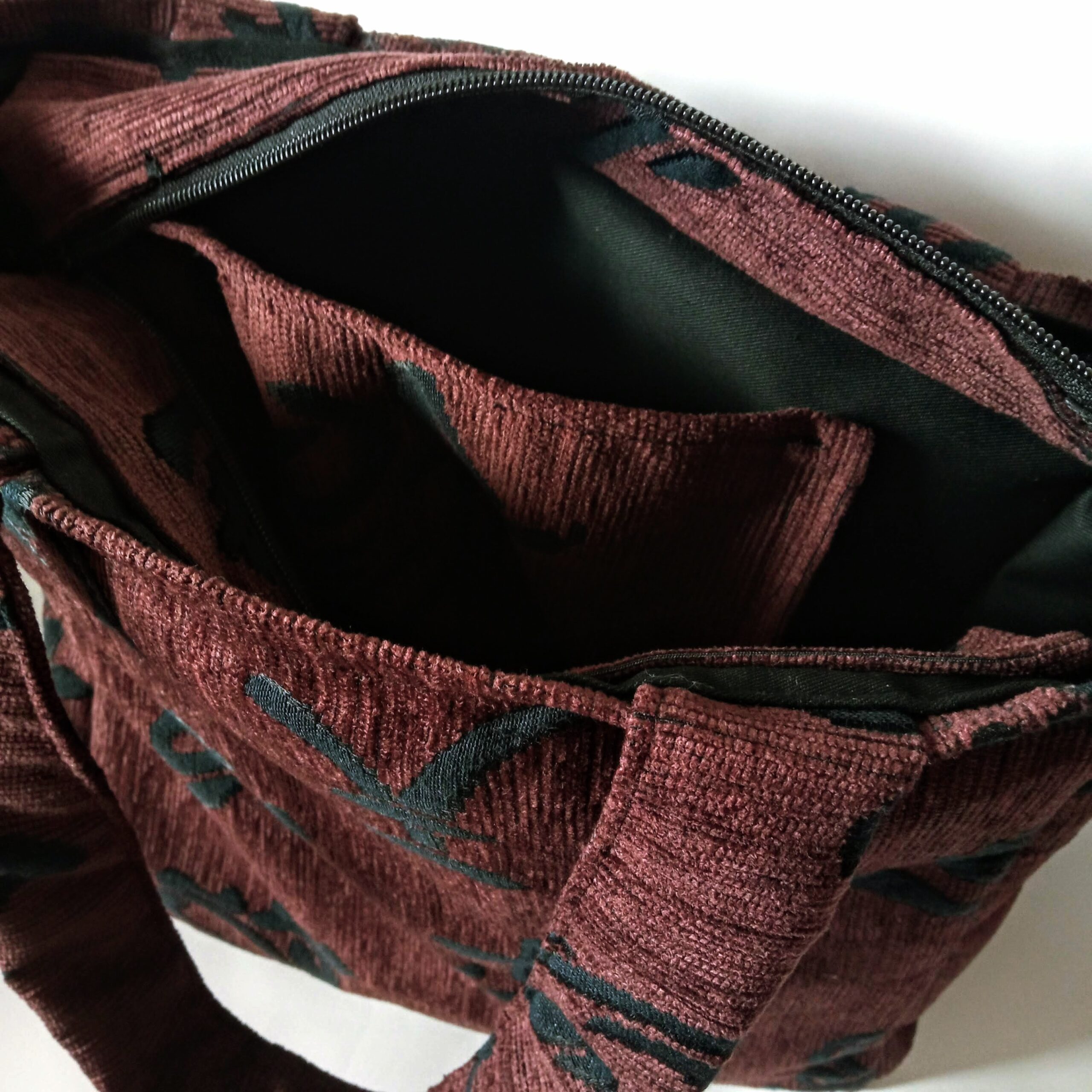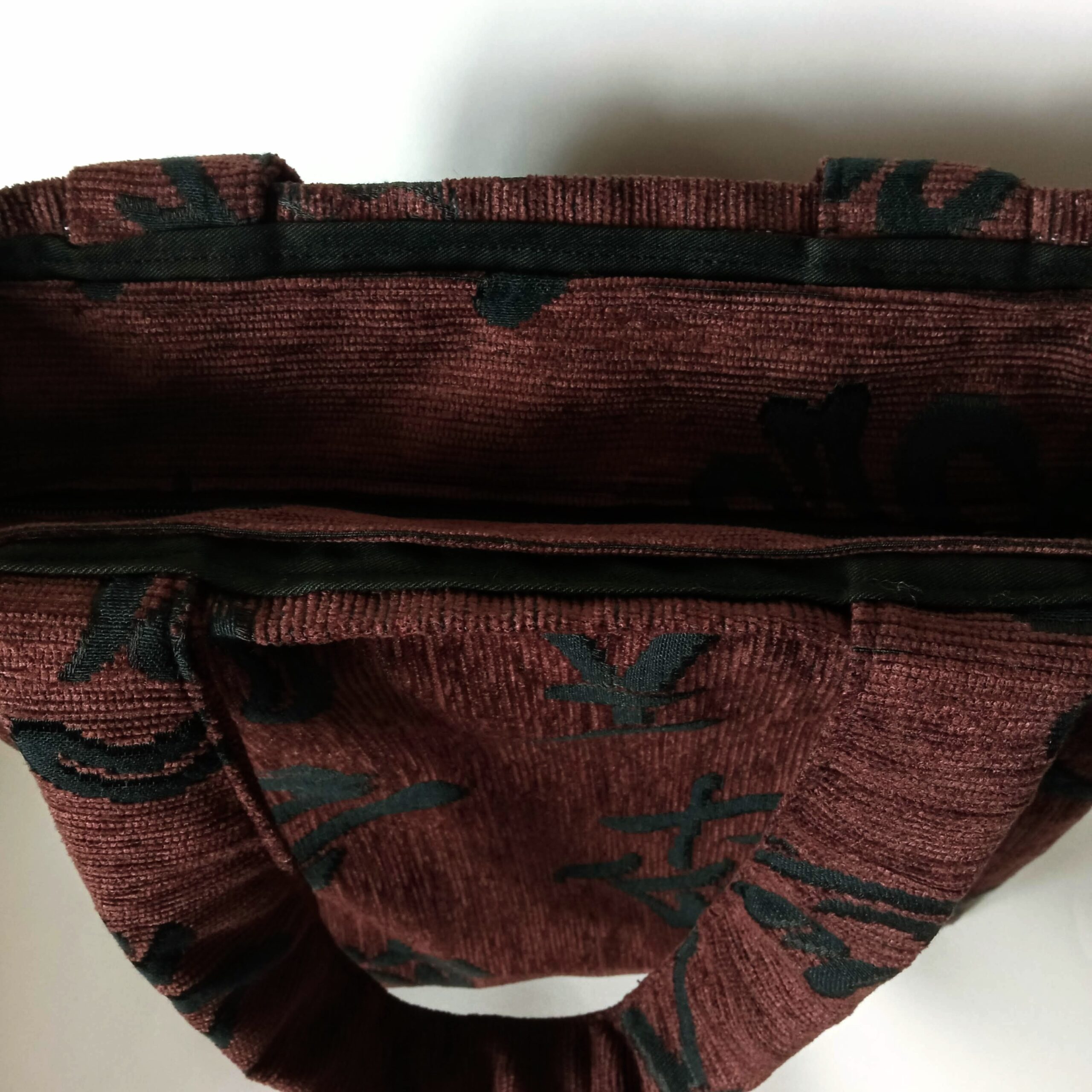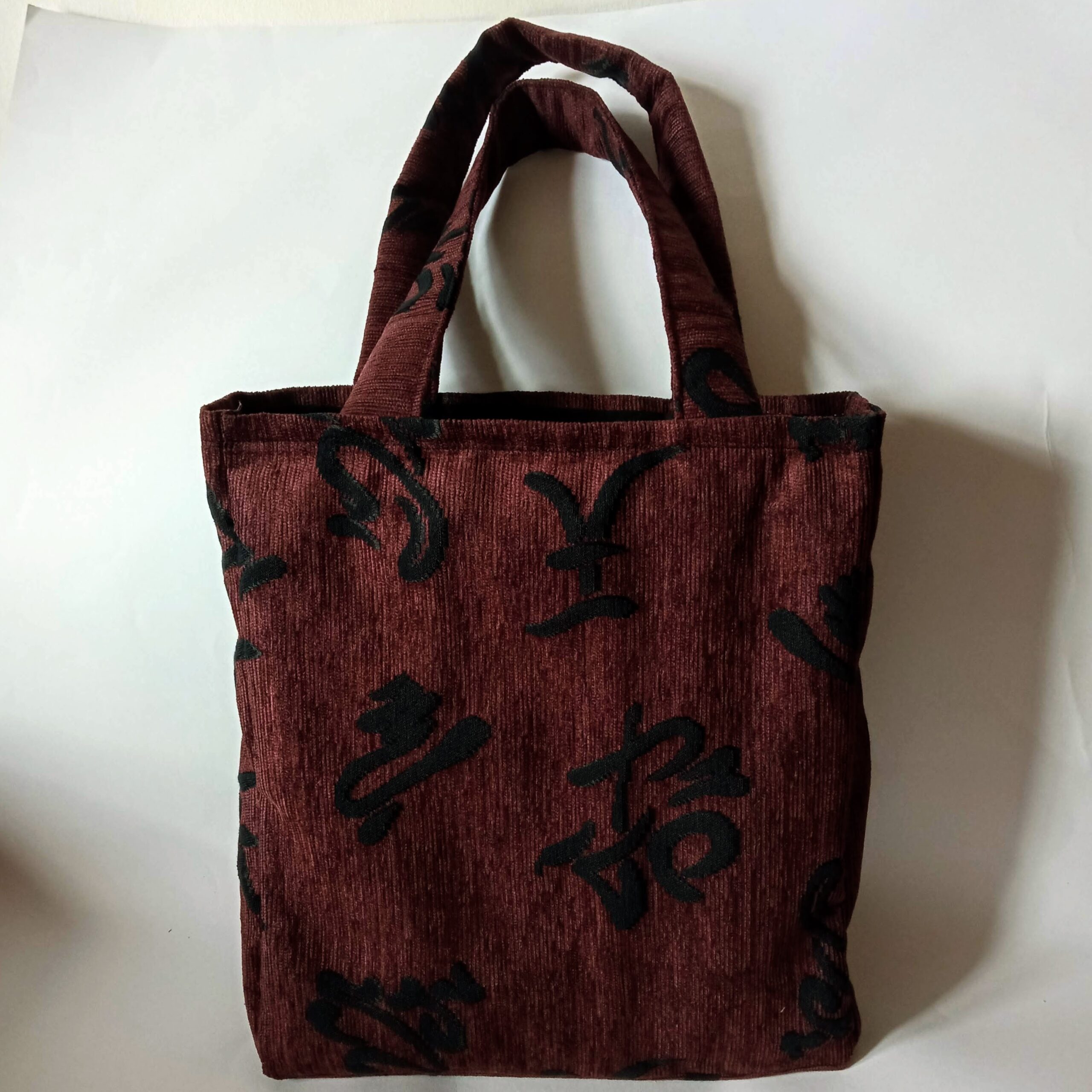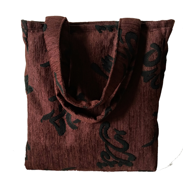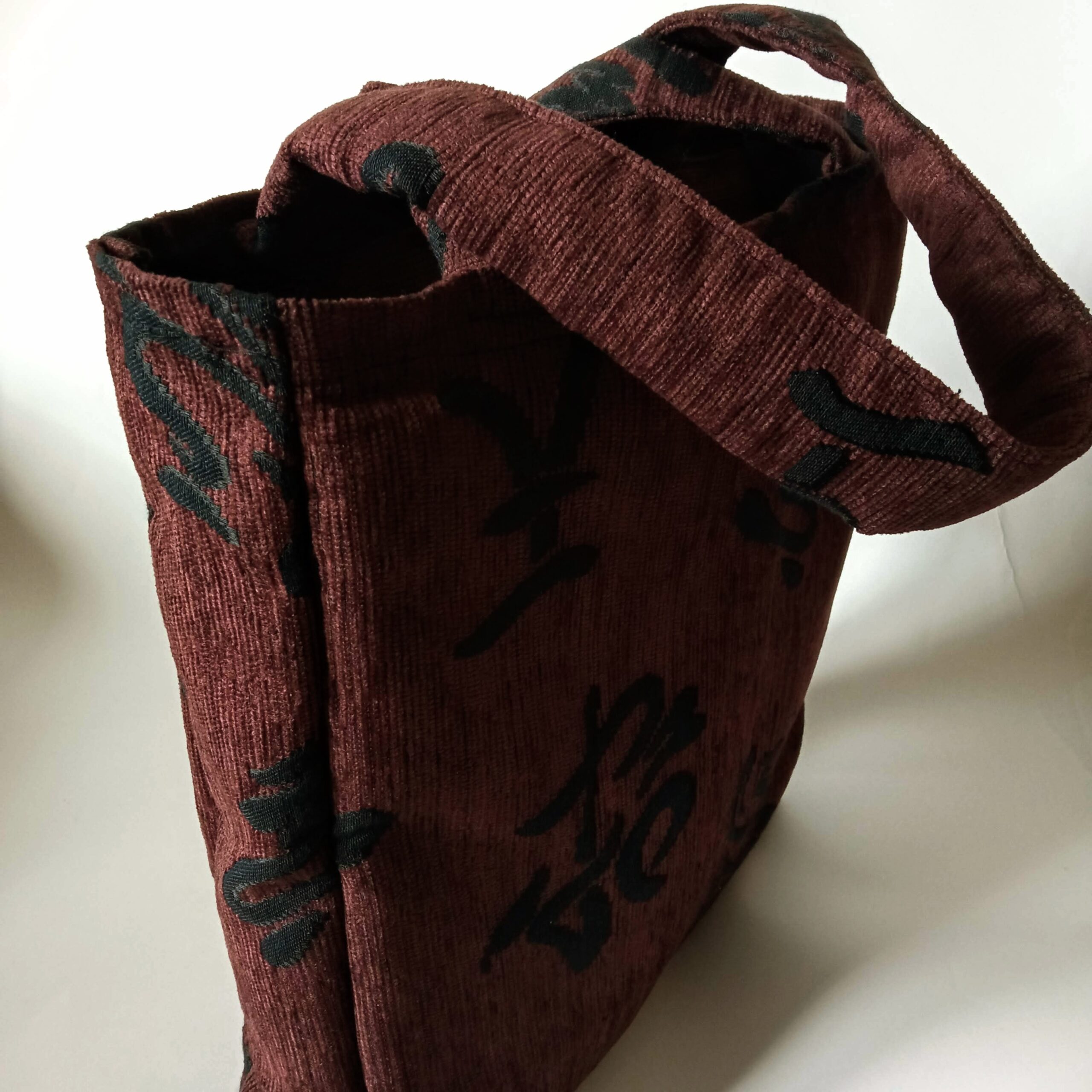 Χειροποίητη τσάντα tote ώμου, από ύφασμα σενίλ, σε καφέ σκούρο με μαύρα ιδεογράμματα. Εσωτερικά είναι φοδραρισμένη με μαύρο ύφασμα καπαρντίνα και επενδυμένη με βάτα στο μπροστινό και στο πίσω μέρος της. Στο κάτω μέρος της έχει σκληρή επένδυση ώστε να στέκεται καλύτερα. Διαθέτει εσωτερική τσέπη. Κλείνει με φερμουάρ. Τα λουριά της έχουν εσωτερική μαλακή επένδυση βάτα ώστε να μην ταλαιπωρούνται οι ώμοι από το βάρος των αντικειμένων.