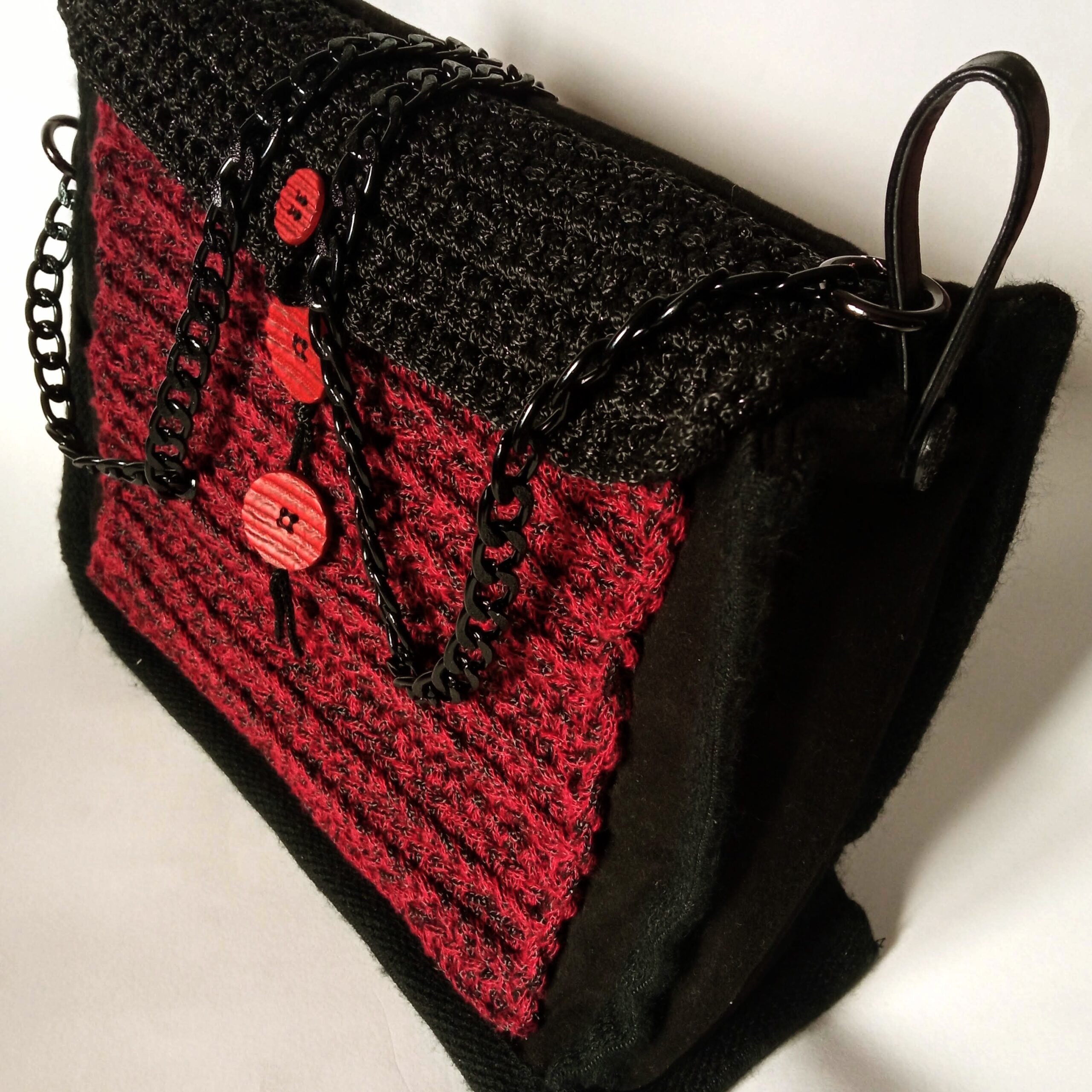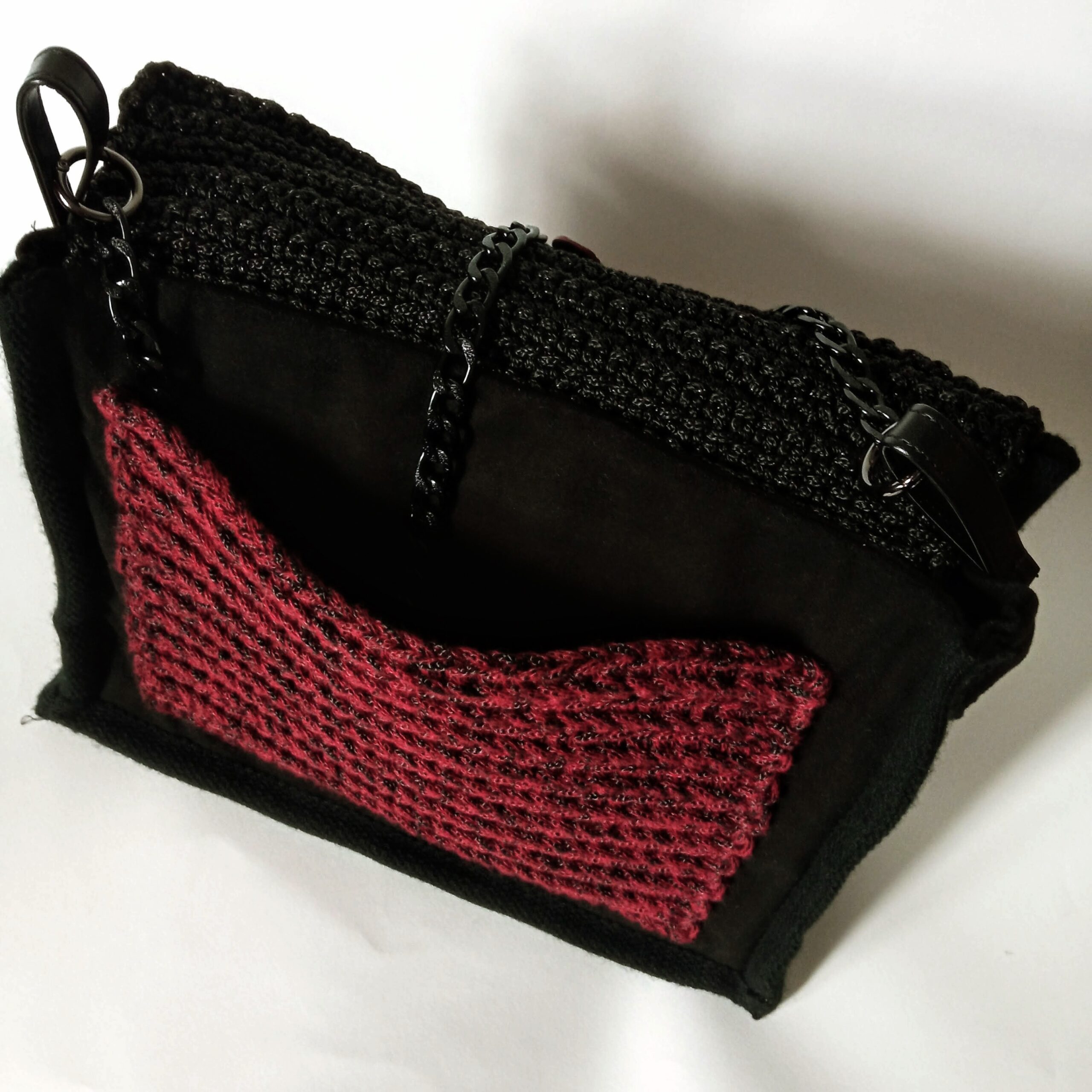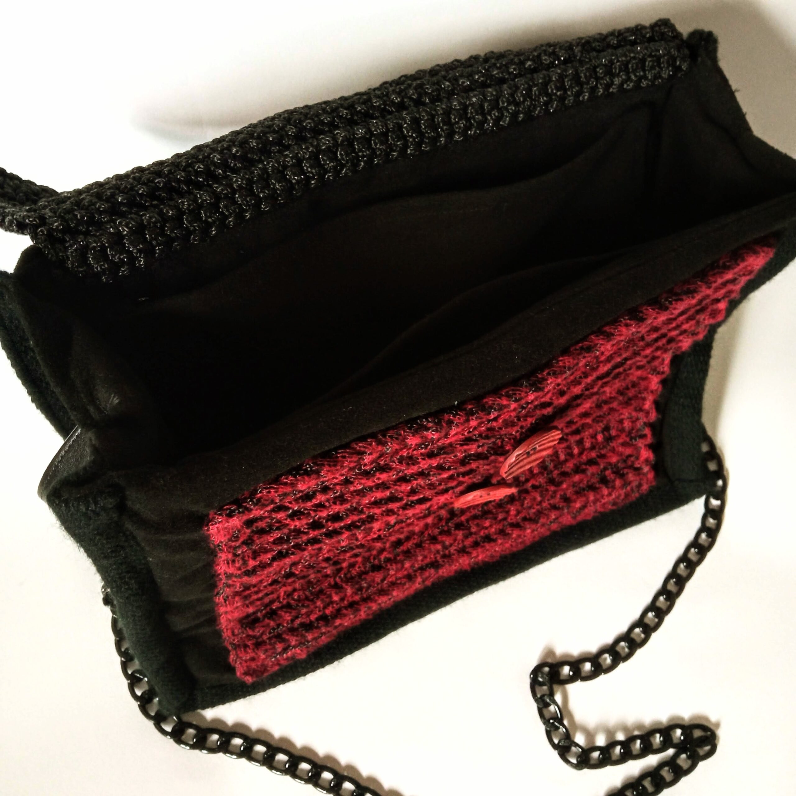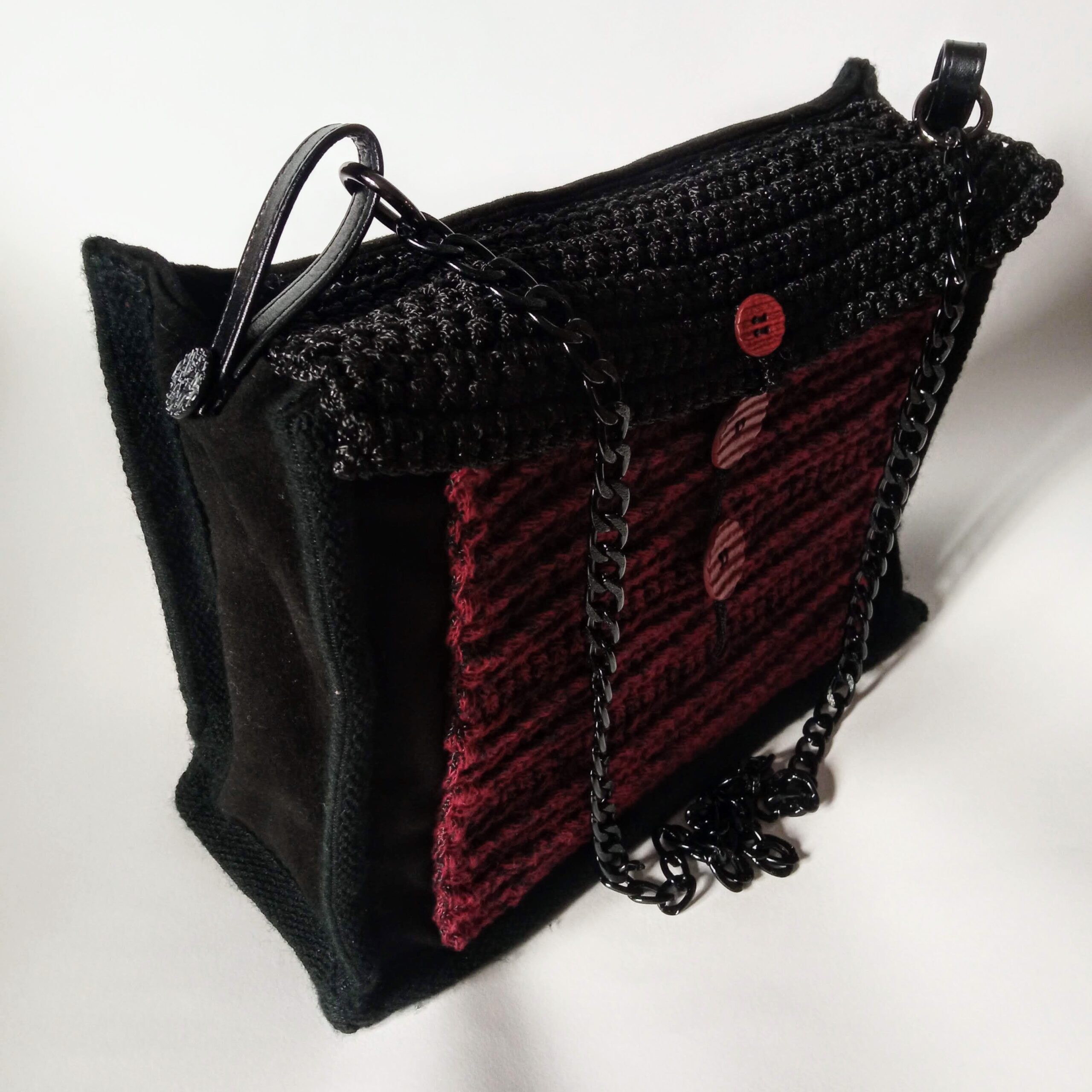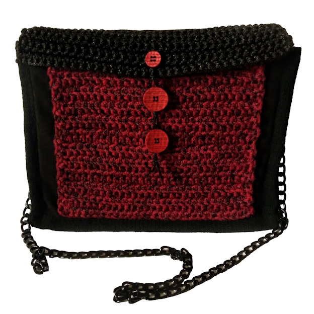 Χειροποίητη τσάντα, από μαύρο ύφασμα βελούδο και εξωτερικά κομμάτια σε κόκκινο-μαύρο πλεγμένα με βελονάκι. Το καπάκι της είναι σε μαύρο χρώμα με διακριτικές μεταλιζέ λεπτομέρειες. Διαθέτει δύο εσωτερικές τσέπες (τρεις θέσεις εσωτερικά) και μια στην πίσω πλευρά εξωτερικά. Κλείνει με κουμπιά. Φοριέται στον ώμο ή χιαστί. Η αλυσίδα της μαύρη πλακέ σαγρέ. Εσωτερικά είναι επενδυμένη με σκληρή επένδυση για να “στέκεται” καλύτερα.