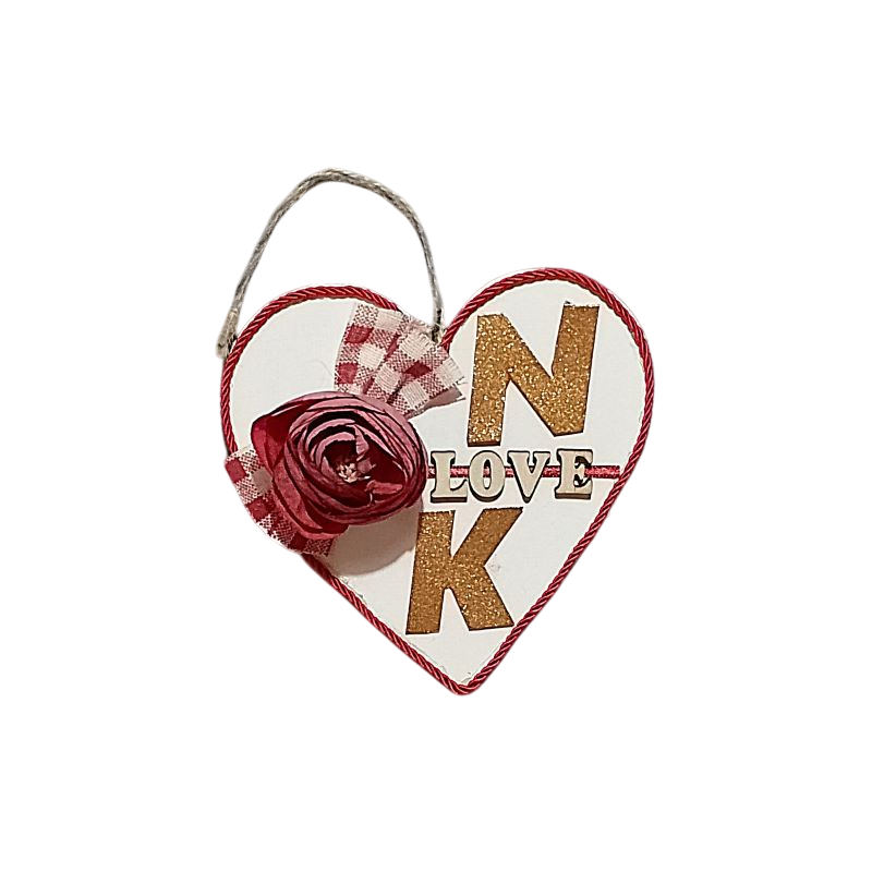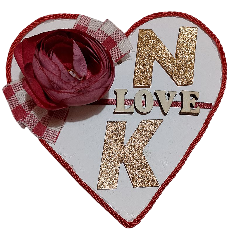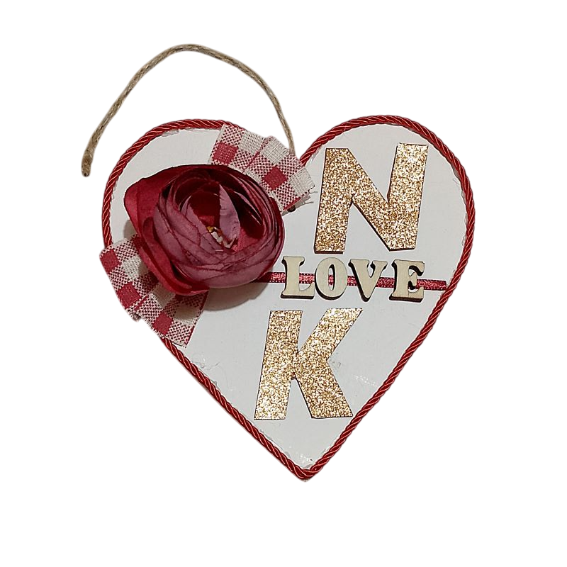 Έχει διάσταση 15 εκ. και την στολίζει κόκκινη καρό κορδέλα με υφασμάτινο λουλούδι και ξύλινα γράμματα ” L O V E “.