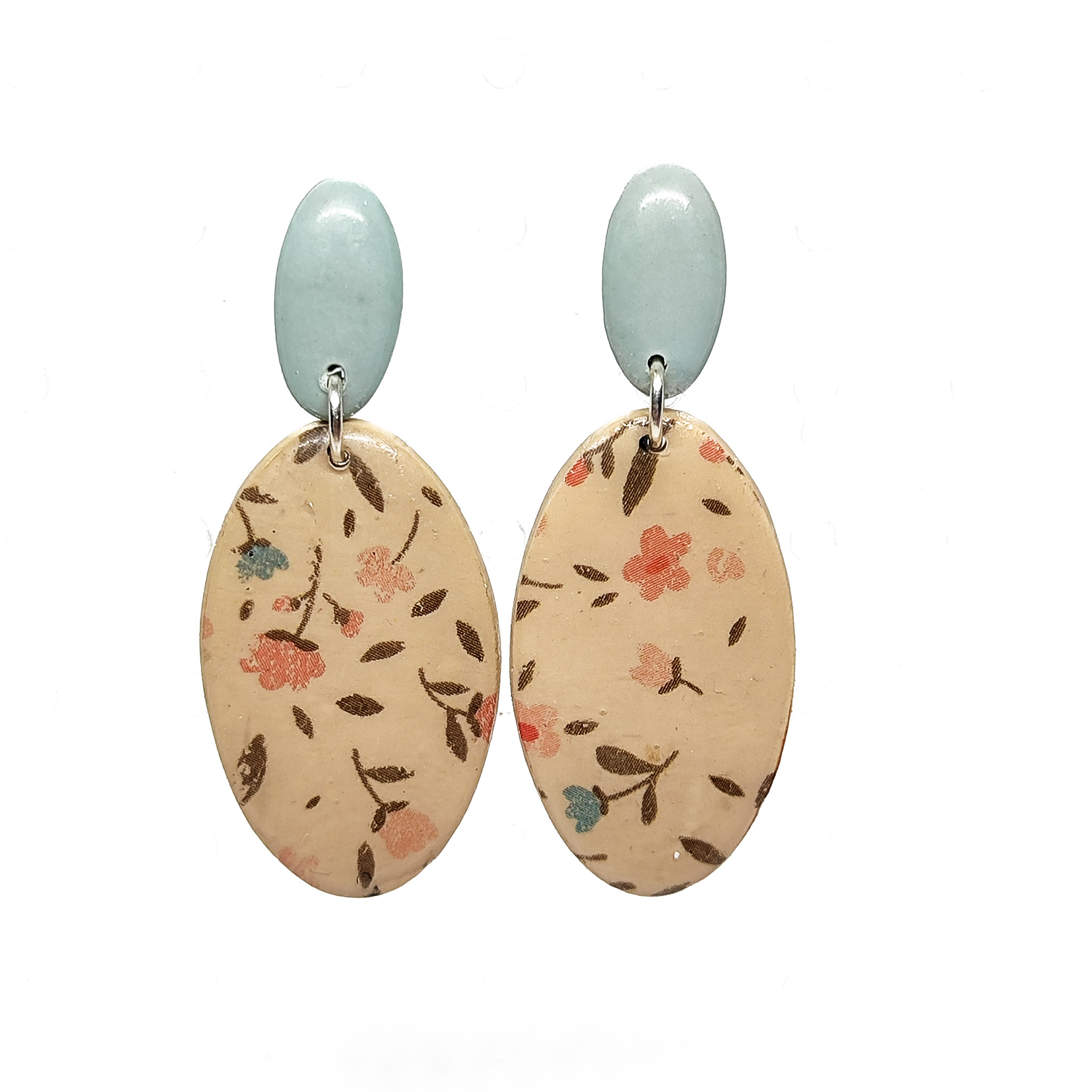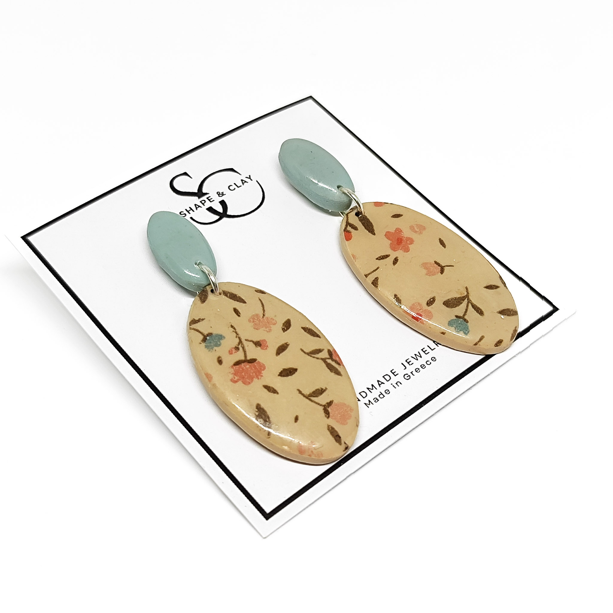 Χειροποίητα σκουλαρίκια κρεμαστά κατασκευασμένα από πολυμερικό πηλό και με σχέδιο λουλούδια. Προστατευμένα από gloss βερνίκι και ρητίνη για προστασία και αντοχή. Τα μεταλλικά στοιχεία είναι από ανοξείδωτο υποαλλεργικό ατσάλι 304.