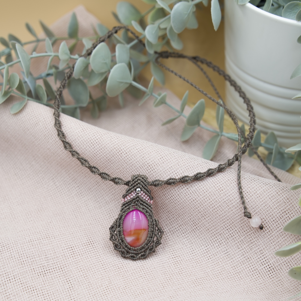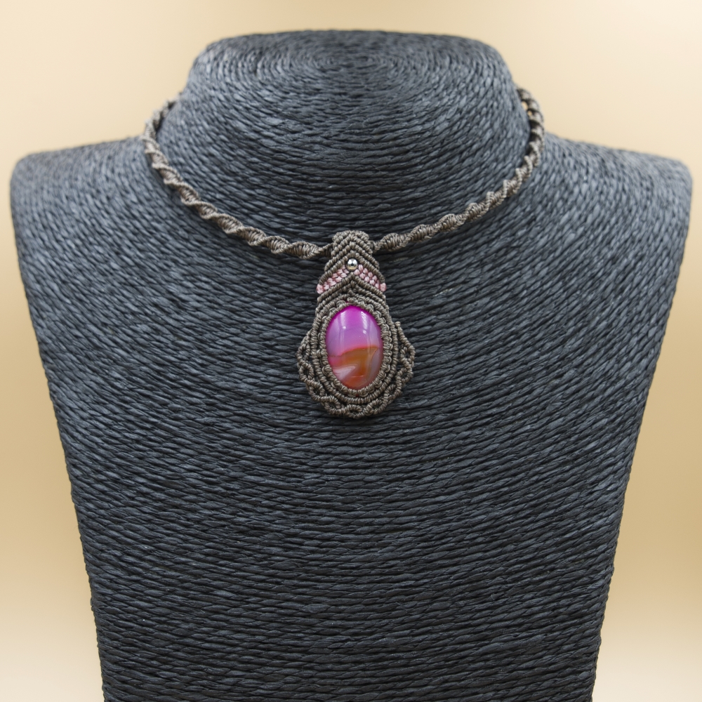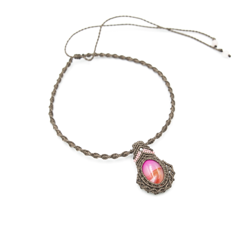 Kολιέ macrame με ημιπολύτιμη πέτρα, φούξια αχάτη