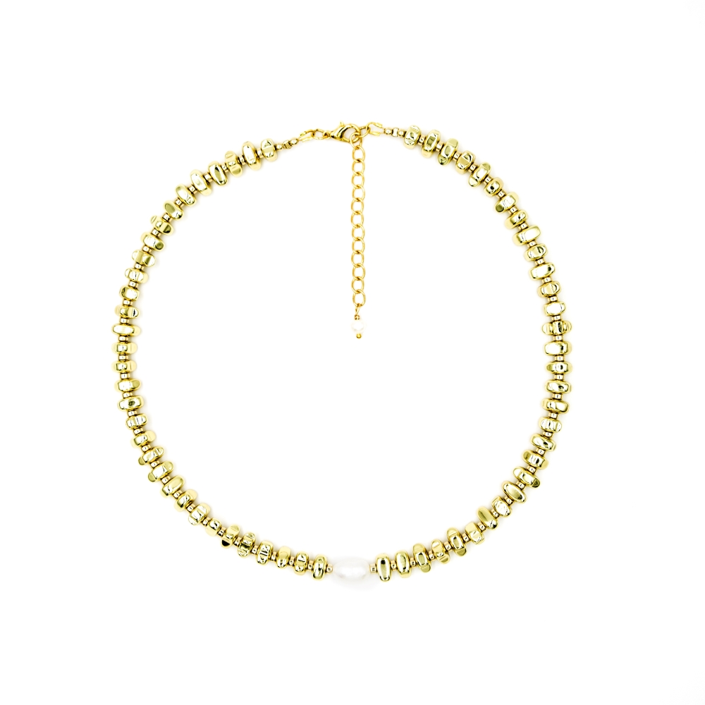 Πλούσιο κοντό κολιέ , με επιχρυσωμένα 14Κ ακανόνιστους αιματίτες και ένα φυσικό μαργαριτάρι (1cm) στην μέση. Οι χάντρες είναι περασμένες από ατσαλόσυρμα. Στο τελείωμα της επέκτασης έχει ένα μικρό μαργαριτάρι.