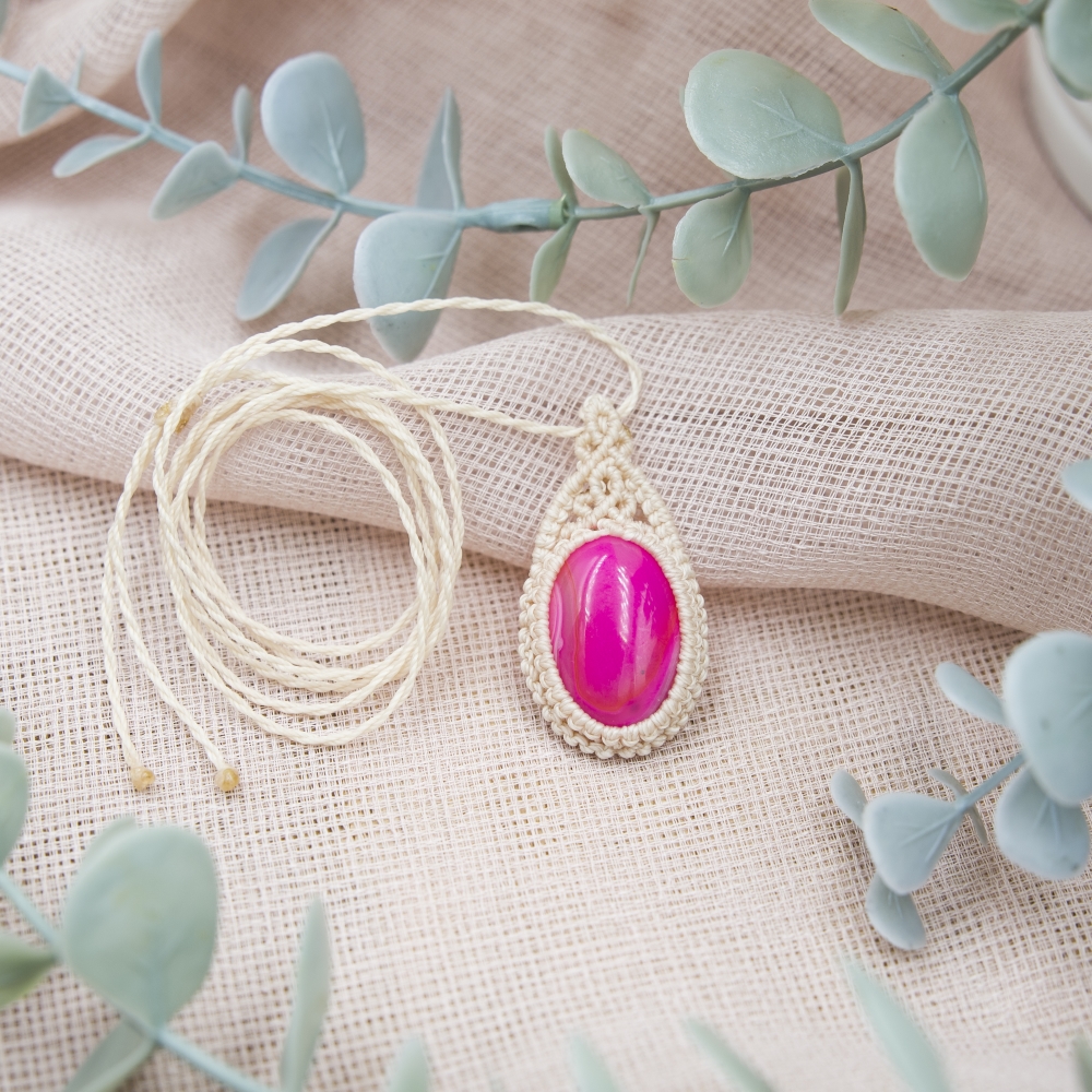 Απλό κολιέ με φυσική πέτρα από φούξια αχάτη ( 25 Χ 18 χλ.), πλεγμένο με κερωμένο κορδόνι υψηλής ποιότητας μπεζ χρώματος.