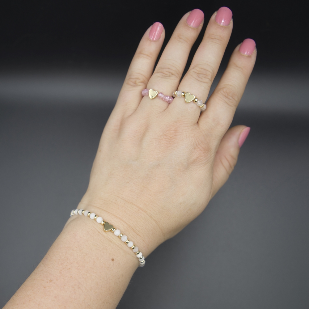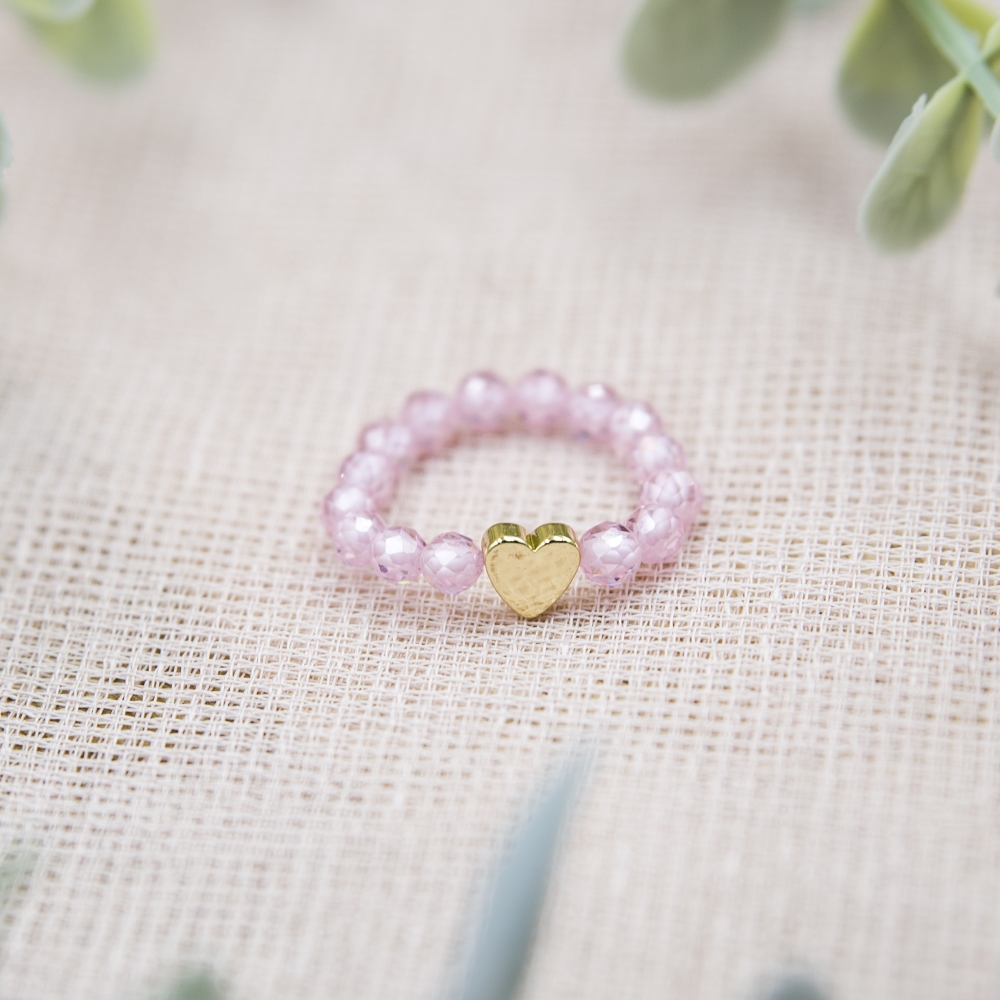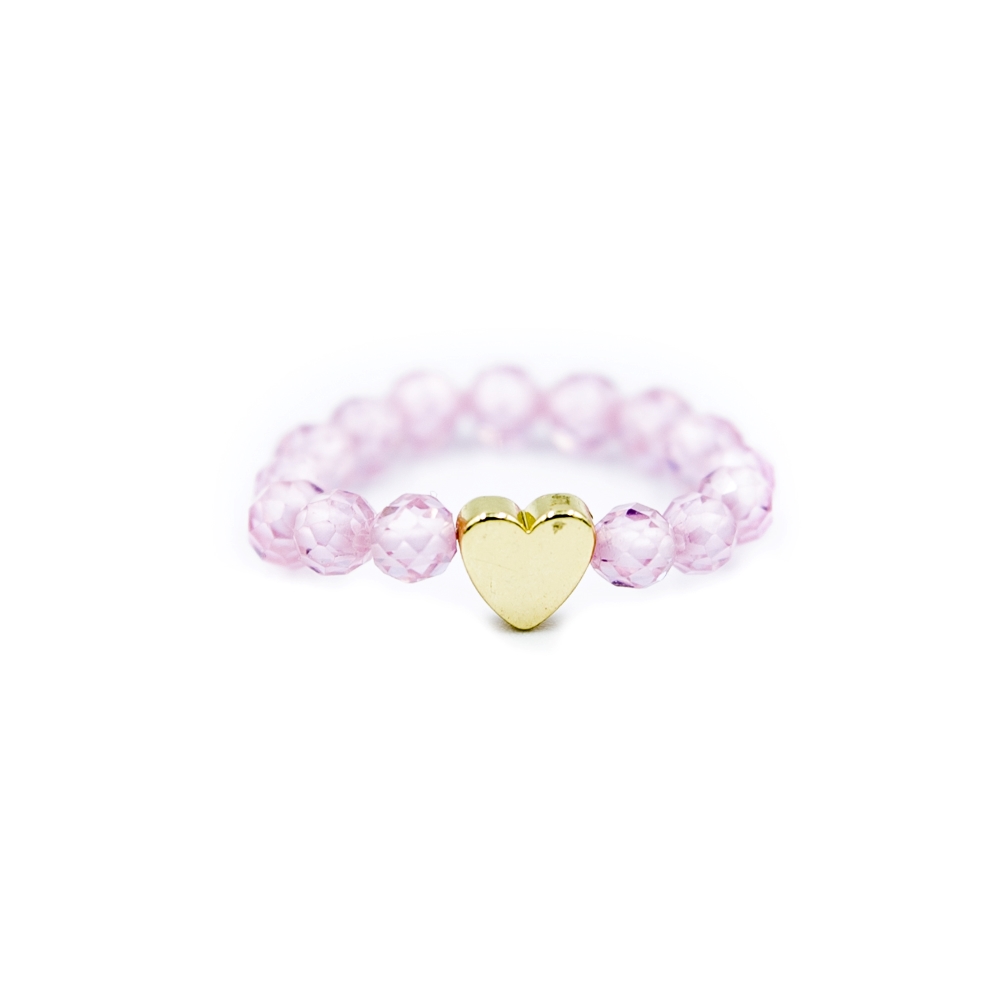 Λαμπερό δαχτυλίδι με χάντρες ημιπολύτιμων λίθων ροζ ζιρκόνιο 4mm, και μία επιχρυσωμένη καρδιά από αιματίτη στην μέση 7mm. σε ελαστικό νήμα, που μπορούν να χρησιμοποιηθούν ως αντιαγχωτικά.