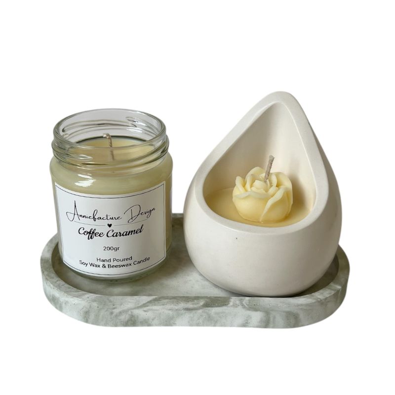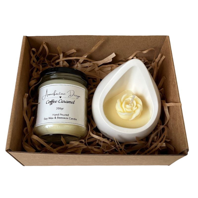 Ανακαλύψτε τη μαγεία του φωτός μέσα από το μοναδικό μας πακέτο δώρου, που περιλαμβάνει ένα κομψό γυάλινο βάζο με κερί 200 γραμμαρίων και ένα χειροποίητο τσιμεντένιο βάζο με κερί 75 γραμμαρίων το οποιο στην κορυφή του διαθέτει ένα πανέμορφο σχέδιο τριαντάφυλλου.Ο συνδυασμός των φυσικών υλικών και της διαχρονικής αισθητικής δημιουργεί ένα δώρο που αποπνέει ζεστασιά, στυλ και ποιότητα. Ιδανικό για να προσφέρετε σε αγαπημένα πρόσωπα ή να χαρίσετε στον εαυτό σας μια στιγμή χαλάρωσης και πολυτέλειας.