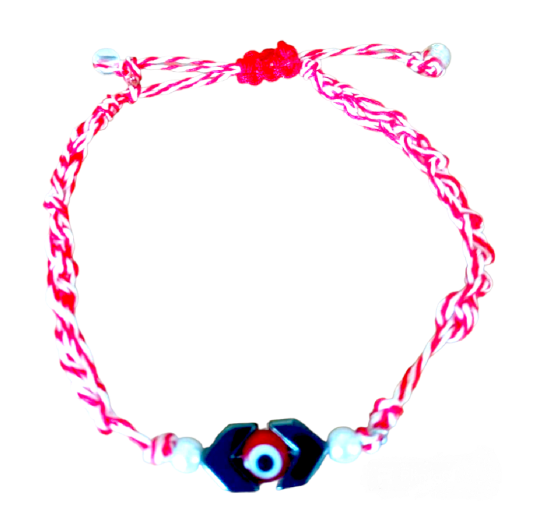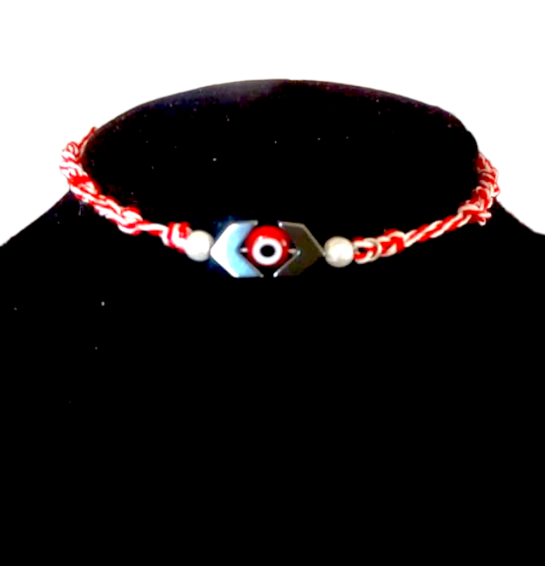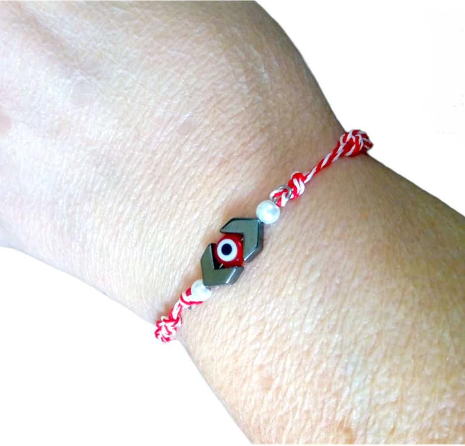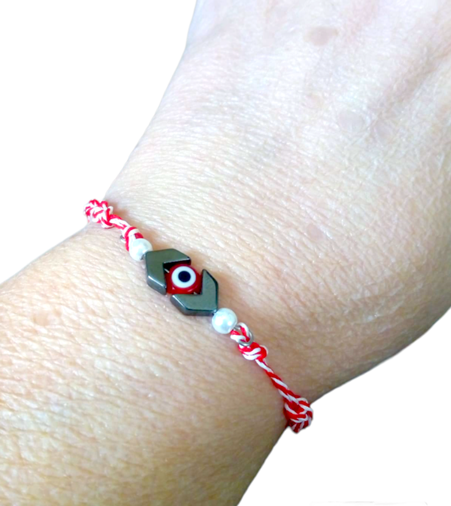 Χειροποιητο Μαρτακι, μακραμε , με ματακι , μαυρα βελη Αιματιτη , λευκες περλες και κορδονι απο ασπρη και κοκκινη κλωστη πλεγμενες με το βελονακι , οποτε γινεταιι ενα πολυ ομορφο και εμφανισιμο κορδονι. Αυξομειουμενο