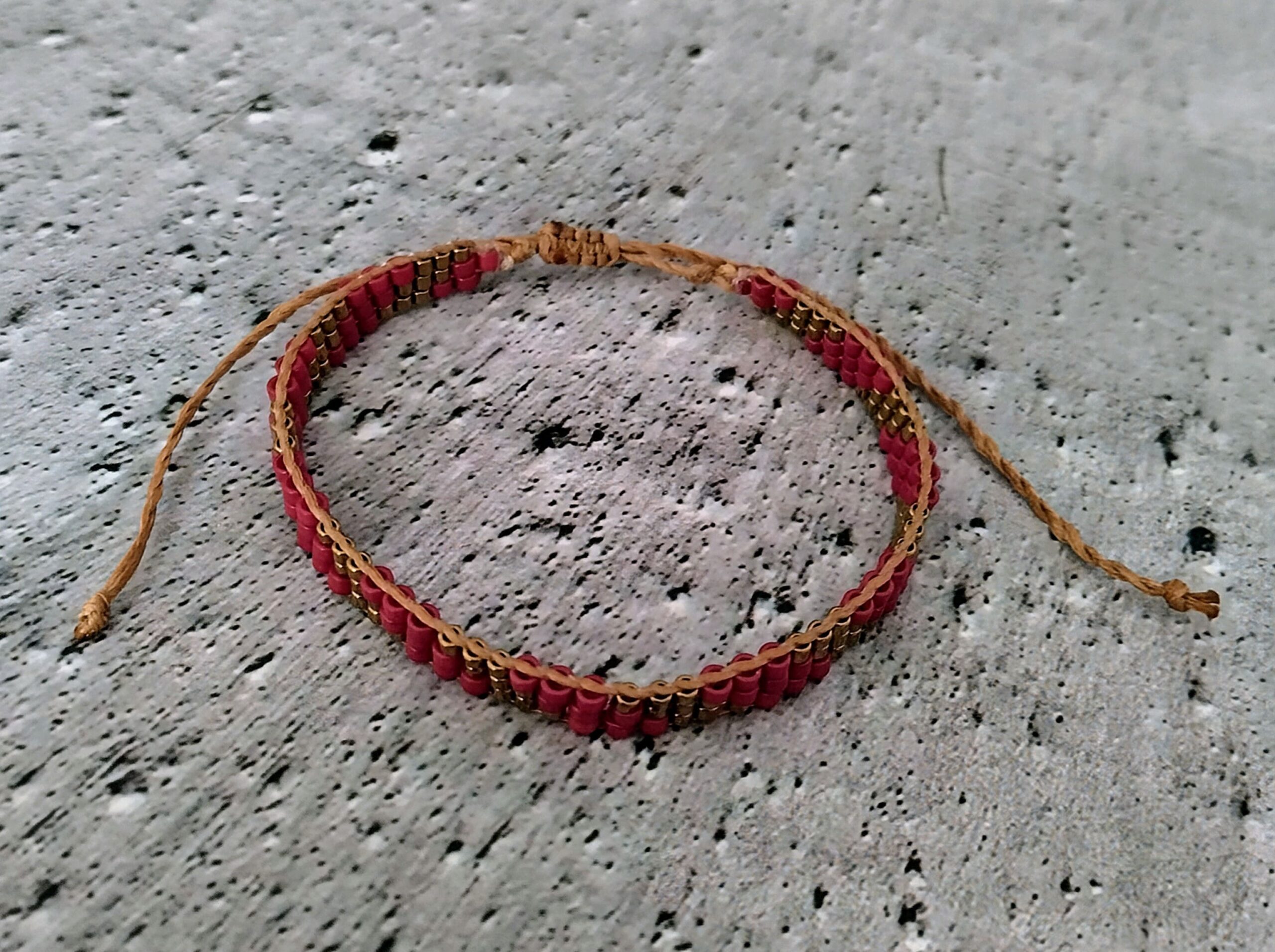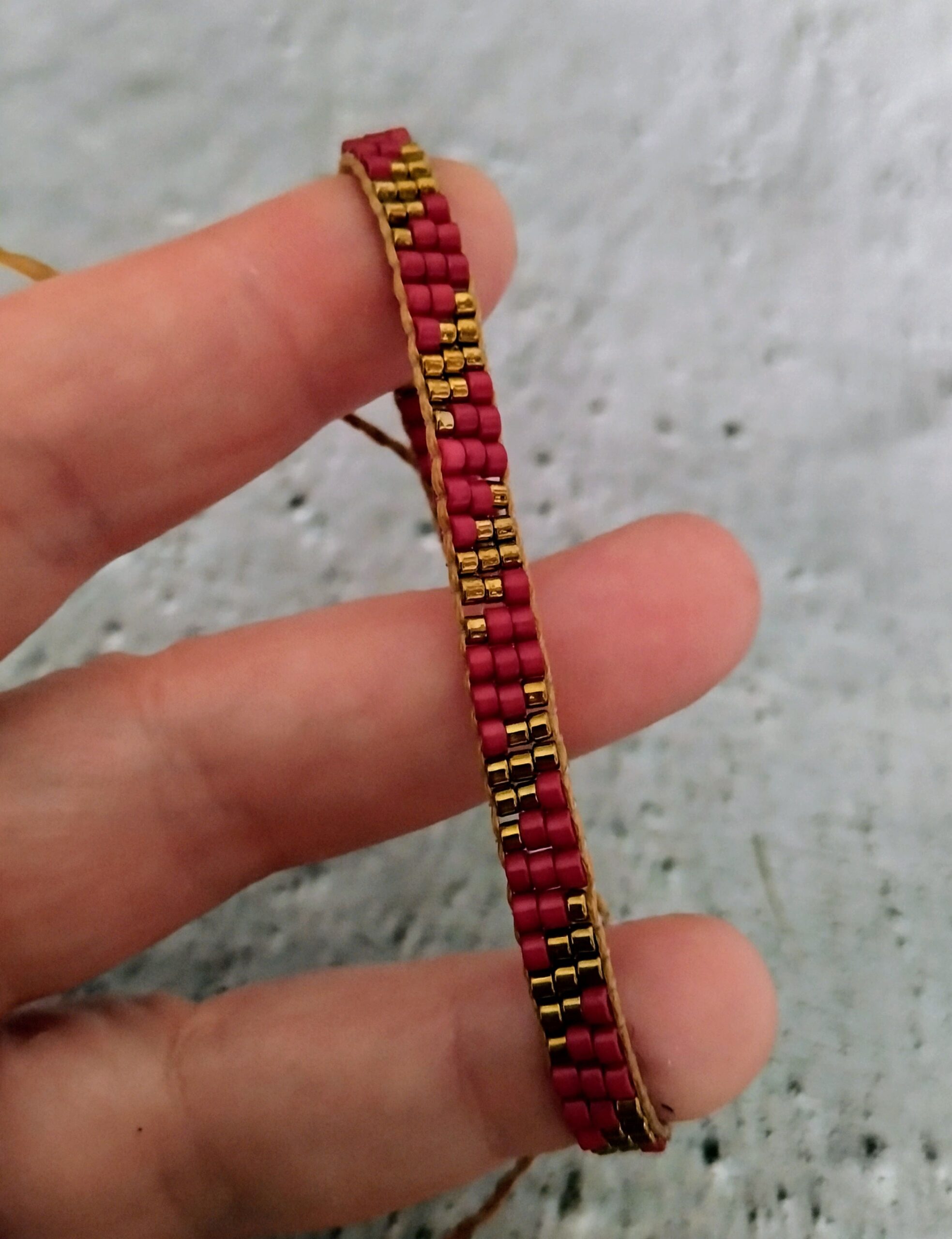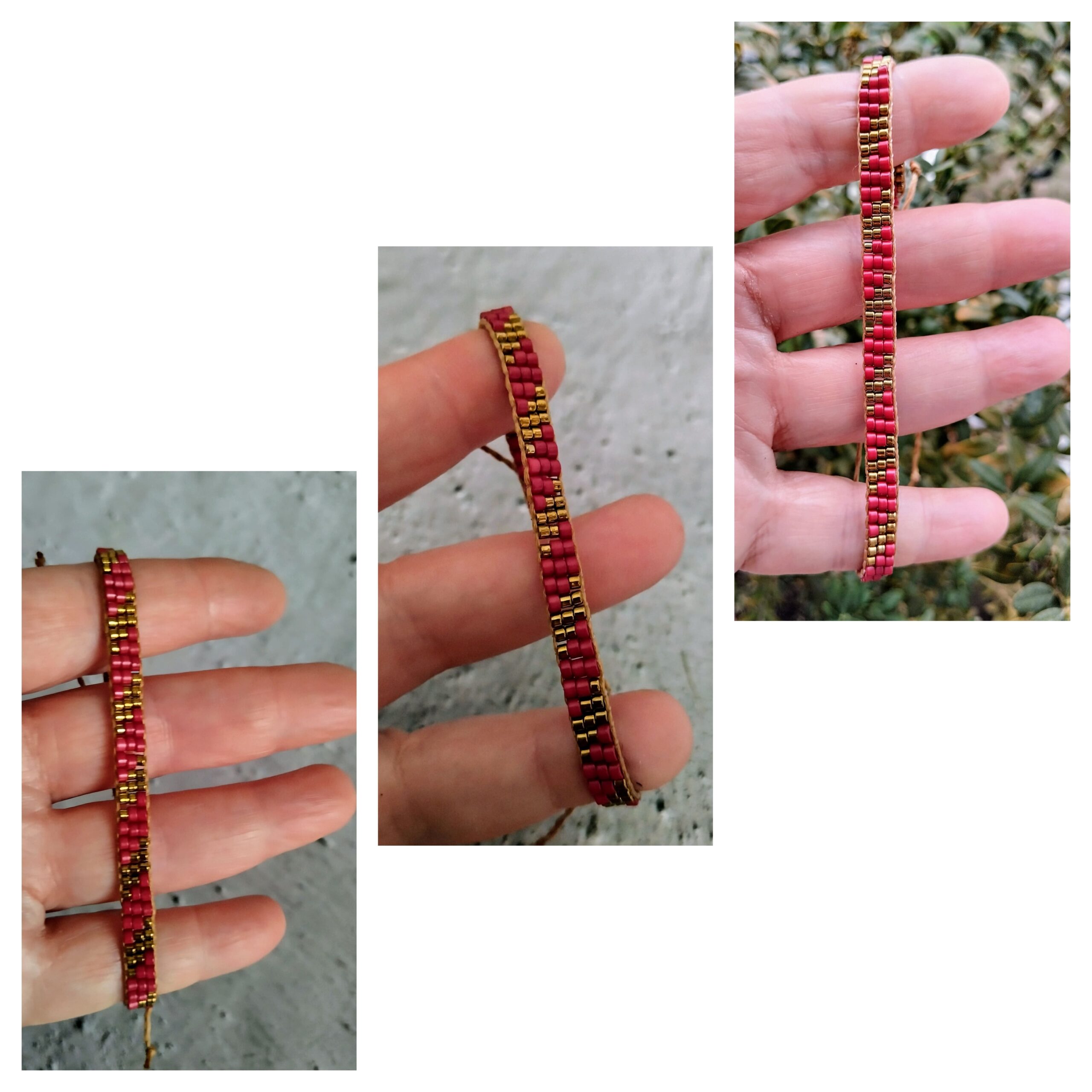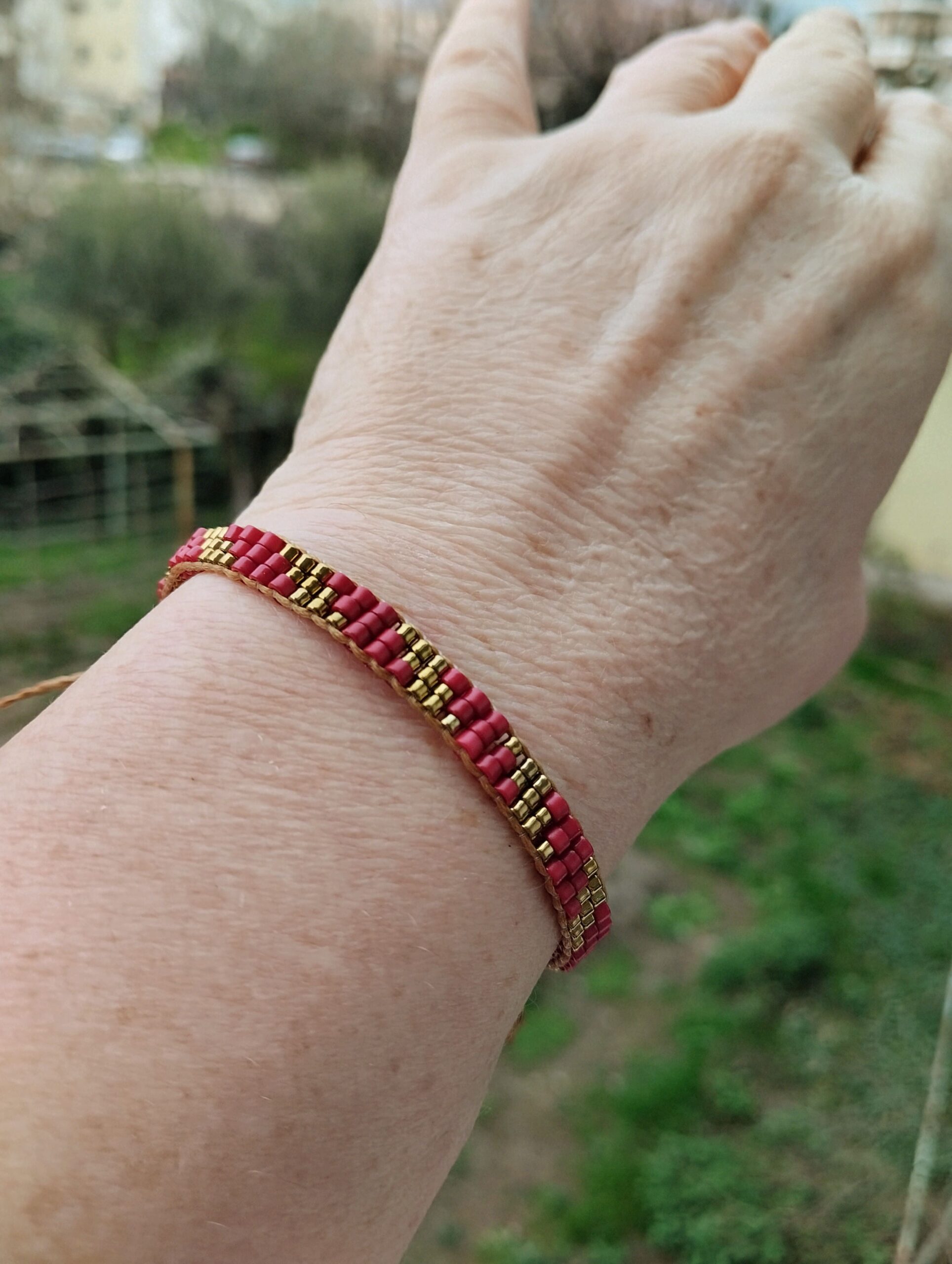 Είναι σε τρεις σειρές οι χαντρούλες που σχηματίζουν ένα όμορφο σχέδιο, στα χρώματα του μπορντό και του vintage χρυσού, το κορδόνι του είναι στο χρώμα της ζεστής σοκολάτας!!