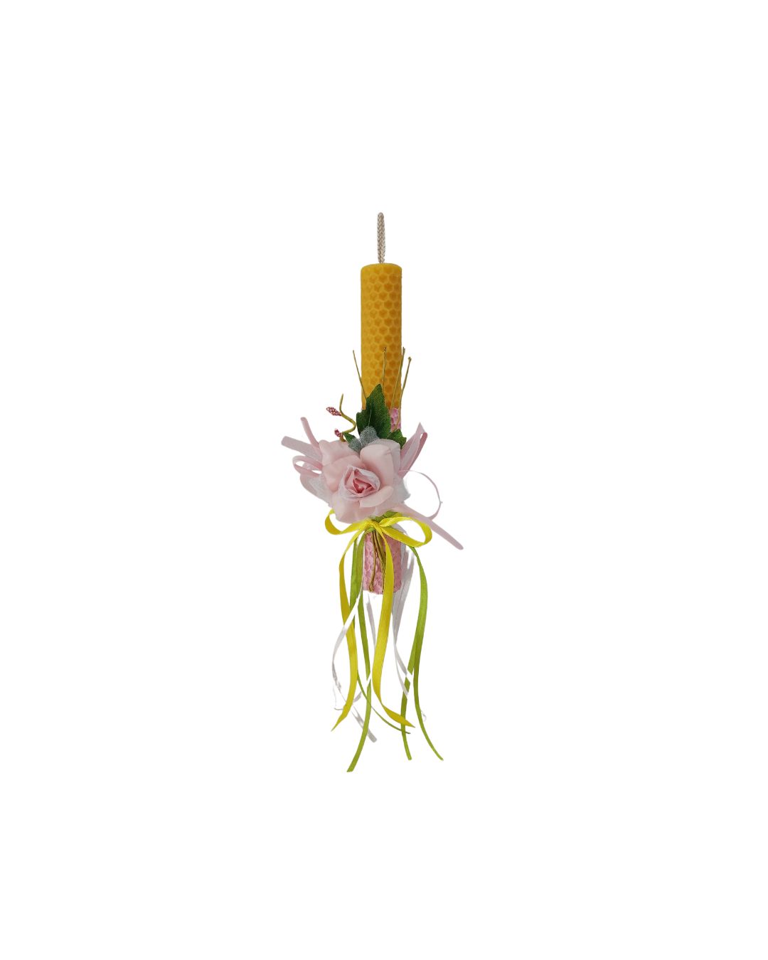 Πασχαλινή λαμπάδα από φυσικό δίχρωμο (κίτρινο – ροζ) μελισσοκέρι 20 εκατοστών διακοσμημένη με ροζ τριαντάφυλλο.