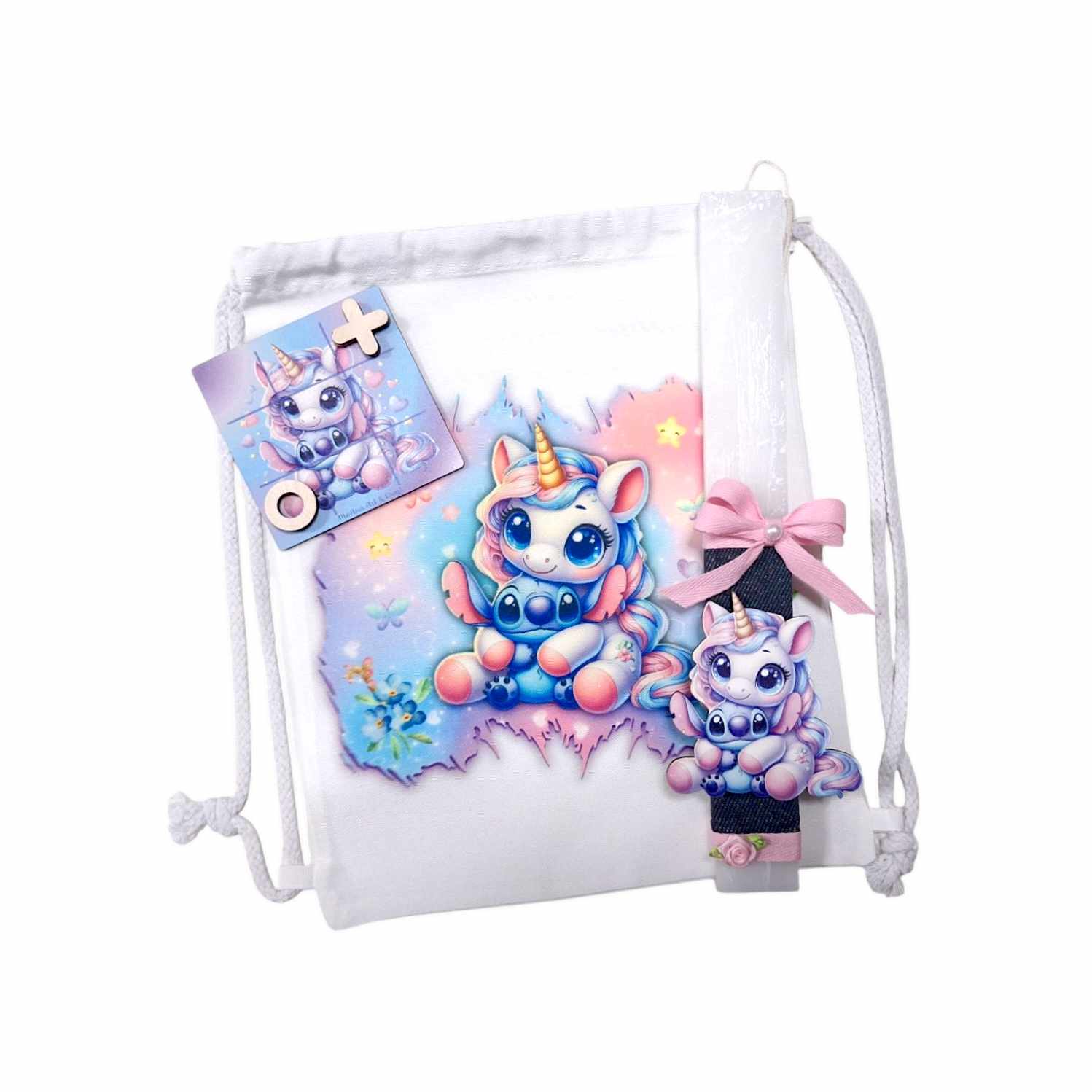 Λαμπάδα με προσωποποιημένο σακίδιο πλάτης και τρίλιζα | Μπλε κοάλα και μονόκερος