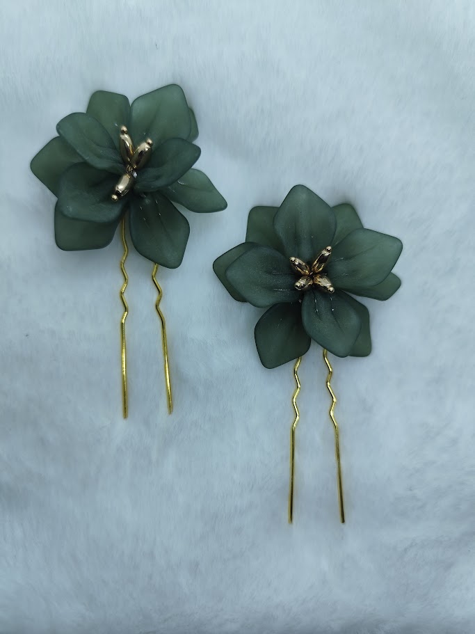 Αναδείξτε το χτένισμά σας με αυτές τις υπέροχες χειροποίητες φουρκέτες μαλλιών, διακοσμημένες με εντυπωσιακά λουλούδια σε βαθύ πράσινο χρώμα και χρυσές λεπτομέρειες στο κέντρο.
