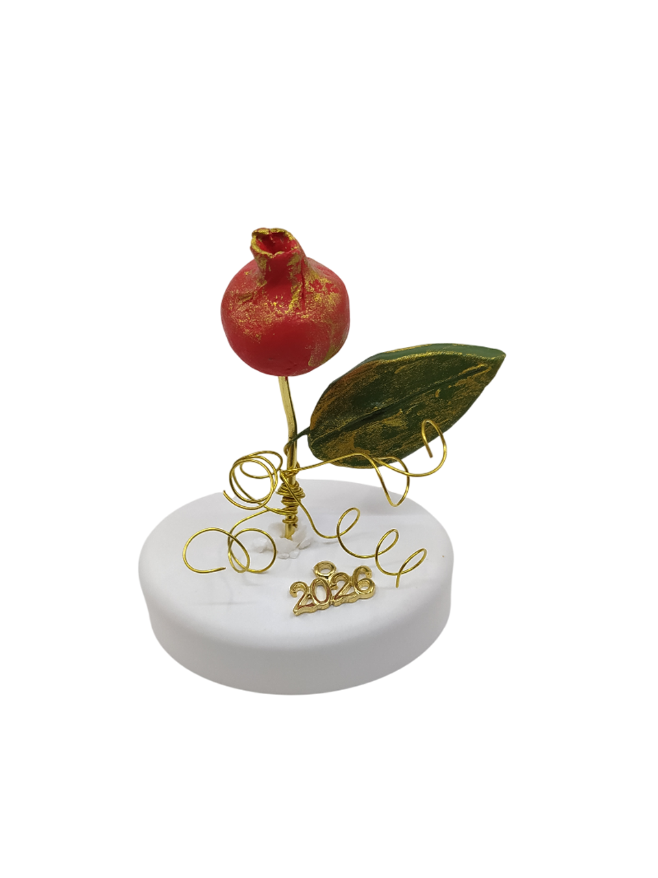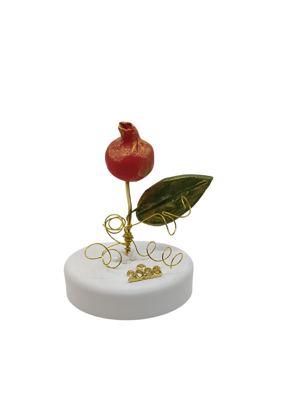 Χειροποίητο γούρι κεραμικό ρόδι με φύλλο σε πέτρα και ημερομηνία.