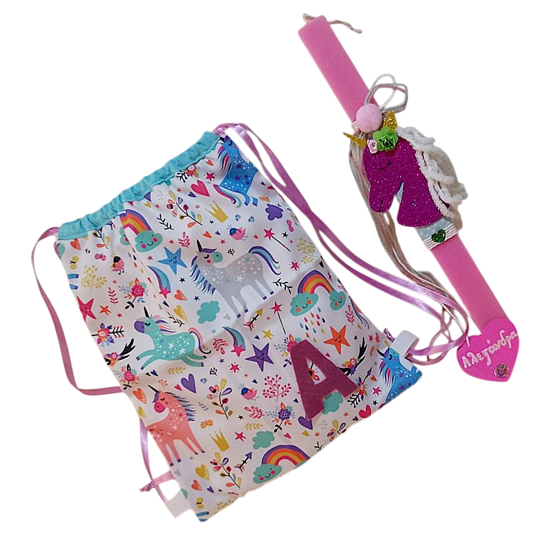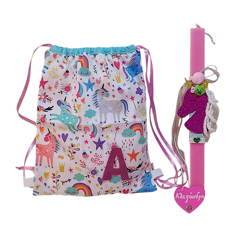 Σετ 2 τεμ ¨Μονόκερος “-Λαμπάδα Πλακέ Ροζ (32 χ 3 εκ. ) και ασορτί Σακίδιο Πλάτης με μονόκερους