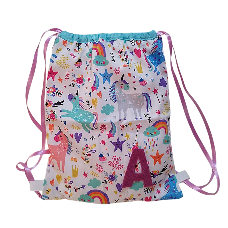 Ασορτί χειροποίητο σακίδιο πλάτης από βαμβακερό ύφασμα 35 χ 25 εκ. με πολύχρωμους μονόκερους και μονόγραμμα.