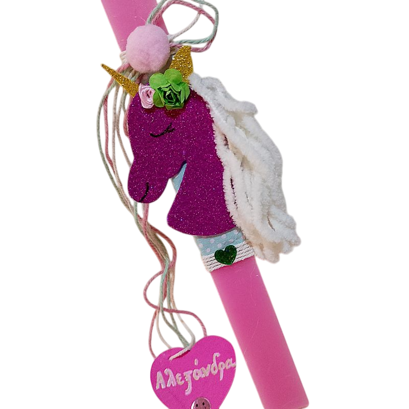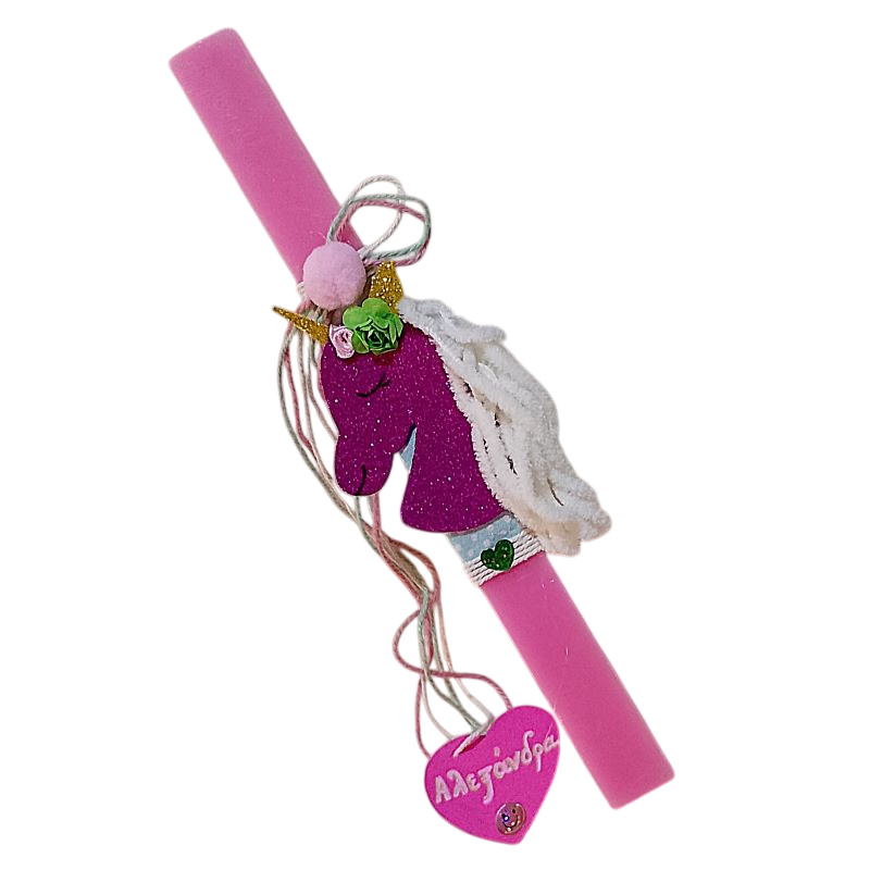 Προσωποποιημένη λαμπάδα με χειροποίητο στοιχείο “μονόκερος ” και το όνομα του παιδιού . Το κερί είναι πλακέ σε ροζ χρώμα 32 χ 3 εκ.