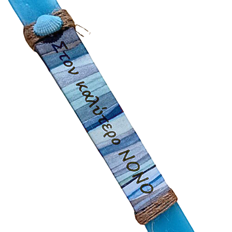 Λαμπάδα ” Στον καλύτερο ΝΟΝΟ ” . Το κερί είναι πλακέ σε γαλάζιο χρώμα ( 25 χ 3 εκ. ).