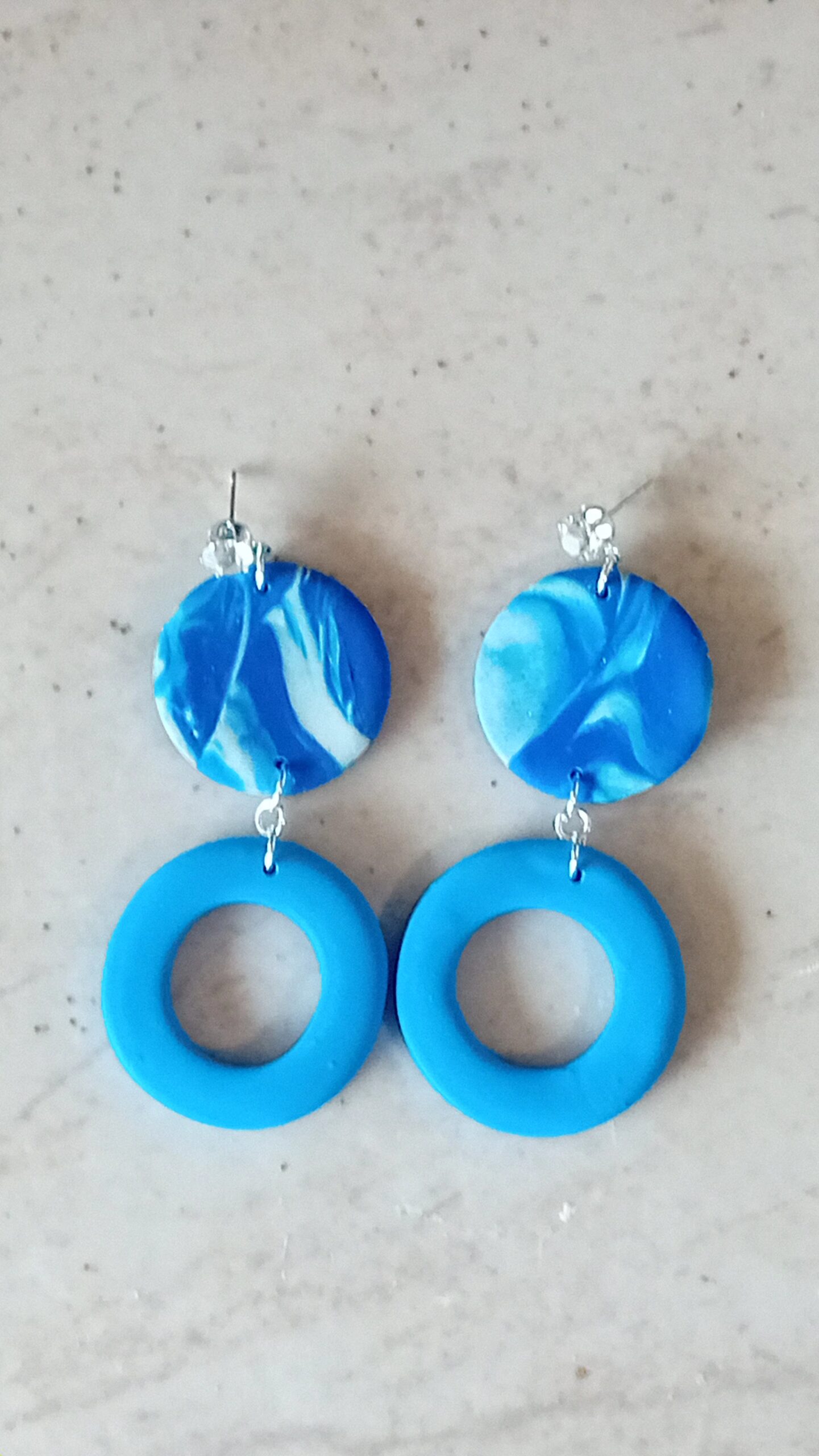 Σκουλαρίκι από πολυμερικο πηλό, μοναδικό κομμάτι σε δύο κύκλους, μακρύ με καρφί ατσάλινο με γυάλινη πετρα.