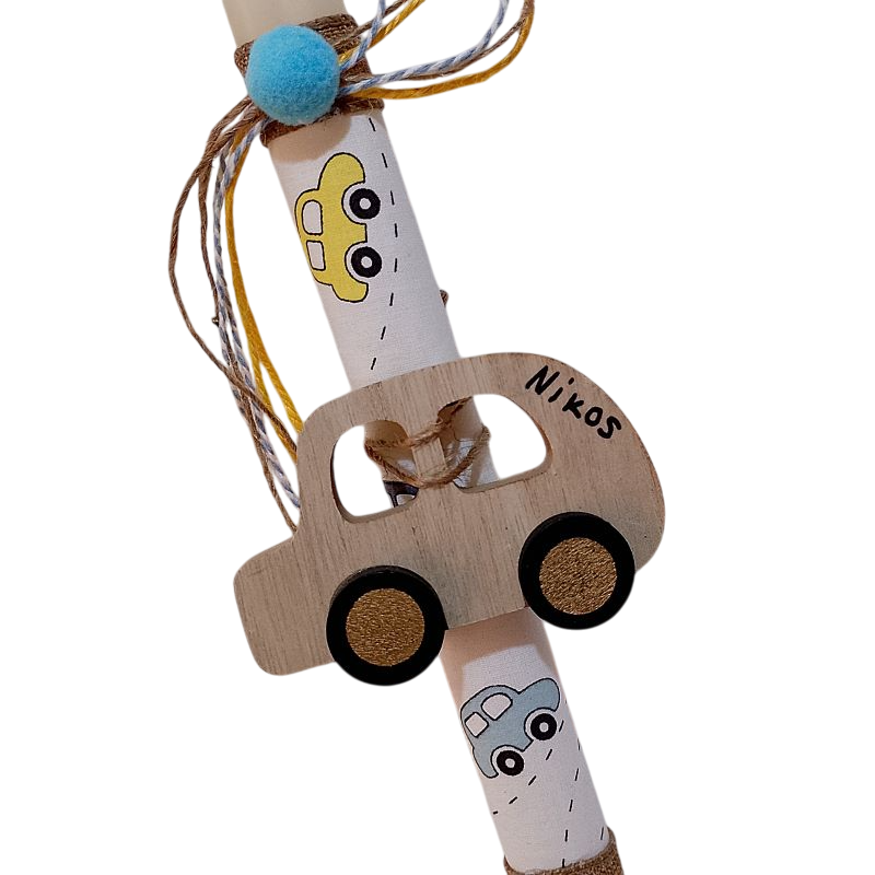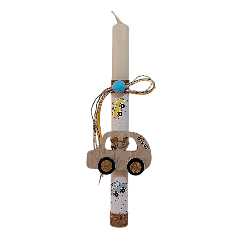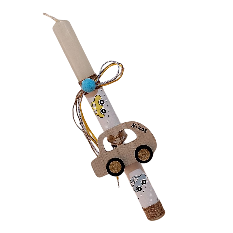 Λαμπάδα εκρού οβάλ με διακοσμητικό ξύλινο αυτοκινητάκι με όνομα ( 32χ3 εκ.)