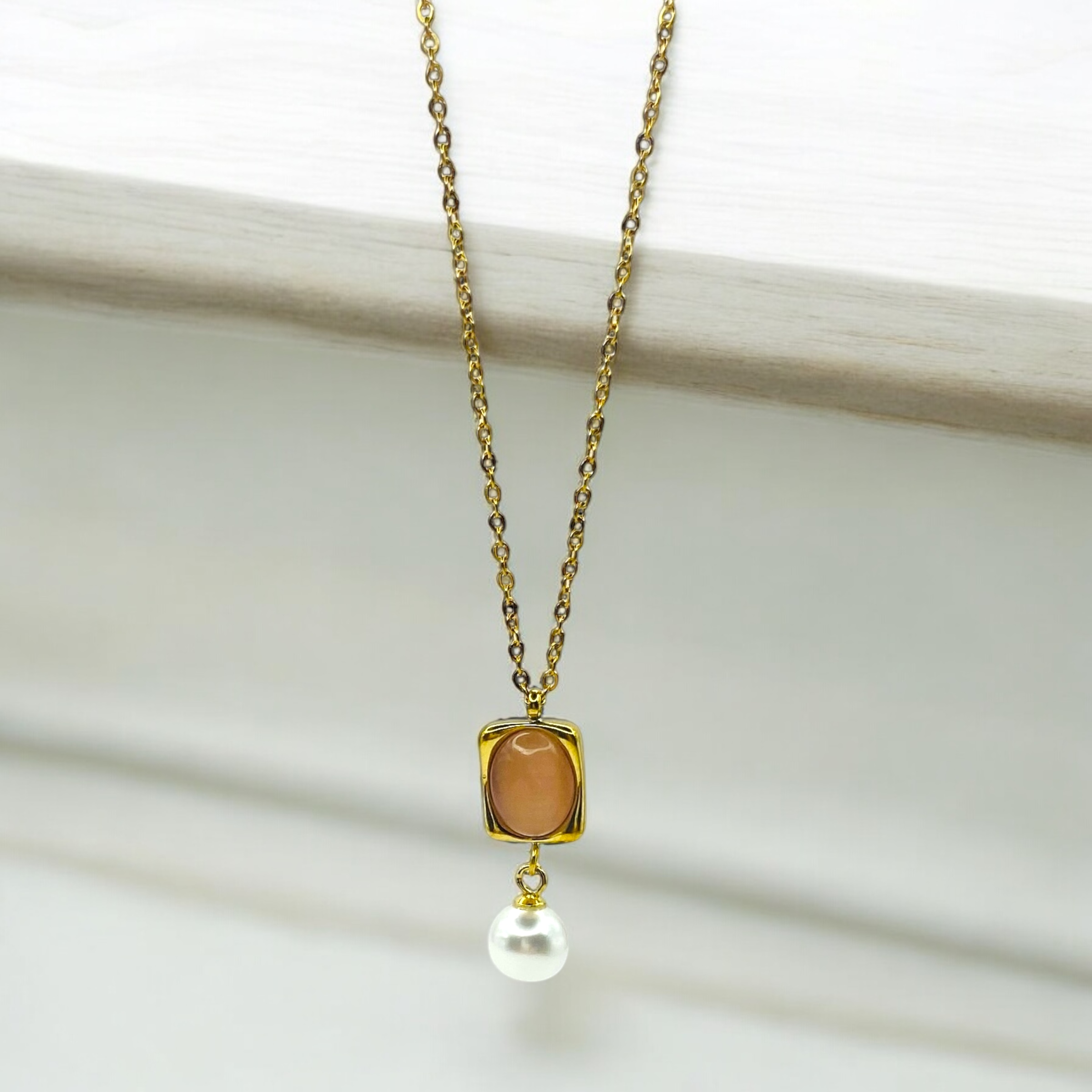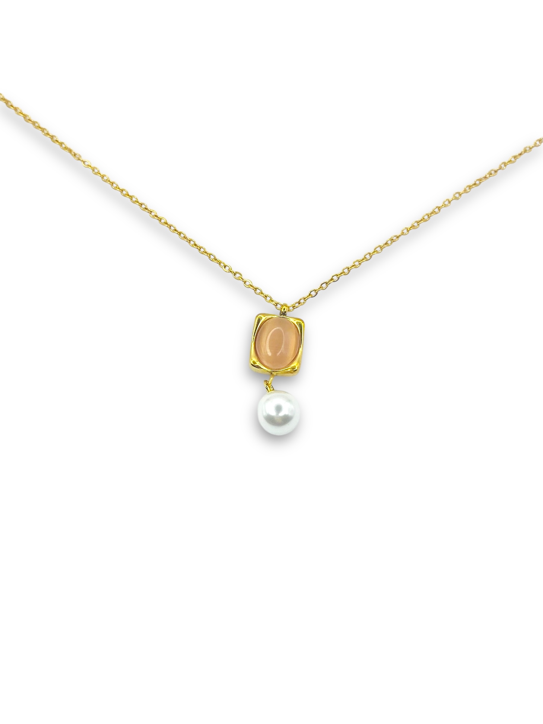 Ατσάλινο χρυσό κολιέ με ροδακινί πέτρα και πέρλα (40+4cm)